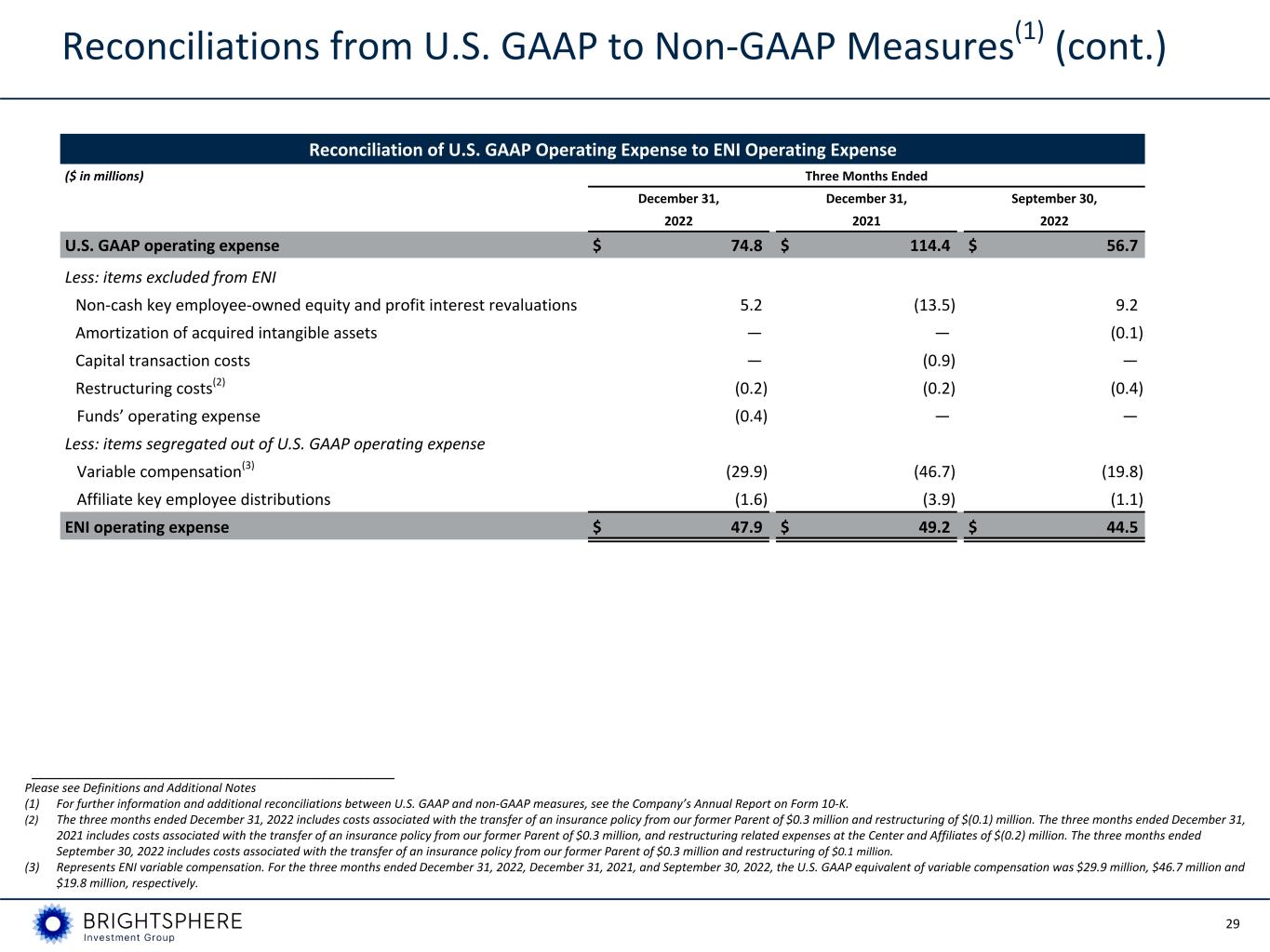 28 Reconciliations from U.S. GAAP to Non-GAAP Measures(1) (cont.) Reconciliation of per-share U.S. GAAP Net Income to Economic Net Income per share ($) Three Months Ended December 31, December 31, September 30, 2022 2021 2022 U.S. GAAP net income per share $ 0.72 $ 0.53 $ 0.42 Adjustments to reflect the economic earnings of the Company: i. Non-cash key employee-owned equity and profit interest revaluations (0.12) 0.18 (0.21) ii. Capital transaction costs — 0.01 — iii. Seed/Co-investment (gains) losses and financing (0.02) (0.01) 0.01 iv. Tax benefit of goodwill and acquired intangibles deductions 0.01 0.01 0.01 v. Discontinued operations and restructuring — (0.17) 0.01 vi. ENI tax normalization 0.04 (0.03) 0.01 Tax effect of above adjustments, as applicable 0.04 0.01 0.05 Economic net income per share $ 0.67 $ 0.53 $ 0.30 Reconciliation of U.S. GAAP Revenue to ENI Revenue ($ in millions) Three Months Ended December 31, December 31, September 30, 2022 2021 2022 U.S. GAAP revenue $ 122.7 $ 162.9 $ 86.8 Exclude revenue from consolidated Funds (0.4) — — ENI revenue $ 122.3 $ 162.9 $ 86.8 ___________________________________________________________ Please see Definitions and Additional Notes (1) For further information and additional reconciliations between U.S. GAAP and non-GAAP measures, see the Company’s Annual Report on Form 10-K.
