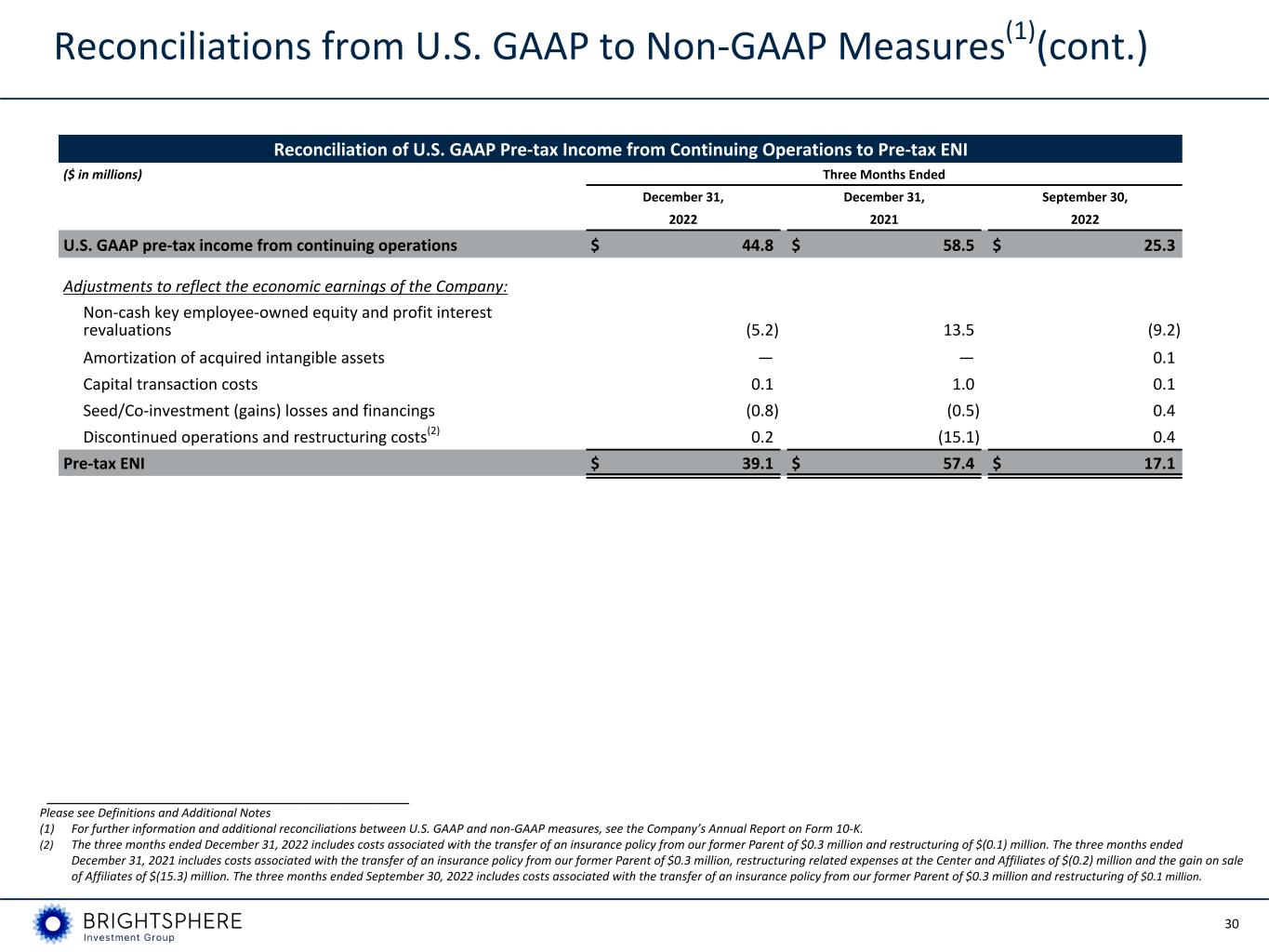 29 Reconciliations from U.S. GAAP to Non-GAAP Measures(1) (cont.) Reconciliation of U.S. GAAP Operating Expense to ENI Operating Expense ($ in millions) Three Months Ended December 31, December 31, September 30, 2022 2021 2022 U.S. GAAP operating expense $ 74.8 $ 114.4 $ 56.7 Less: items excluded from ENI Non-cash key employee-owned equity and profit interest revaluations 5.2 (13.5) 9.2 Amortization of acquired intangible assets — — (0.1) Capital transaction costs — (0.9) — Restructuring costs(2) (0.2) (0.2) (0.4) Funds’ operating expense (0.4) — — Less: items segregated out of U.S. GAAP operating expense Variable compensation(3) (29.9) (46.7) (19.8) Affiliate key employee distributions (1.6) (3.9) (1.1) ENI operating expense $ 47.9 $ 49.2 $ 44.5 ___________________________________________________________ Please see Definitions and Additional Notes (1) For further information and additional reconciliations between U.S. GAAP and non-GAAP measures, see the Company’s Annual Report on Form 10-K. (2) The three months ended December 31, 2022 includes costs associated with the transfer of an insurance policy from our former Parent of $0.3 million and restructuring of $(0.1) million. The three months ended December 31, 2021 includes costs associated with the transfer of an insurance policy from our former Parent of $0.3 million, and restructuring related expenses at the Center and Affiliates of $(0.2) million. The three months ended September 30, 2022 includes costs associated with the transfer of an insurance policy from our former Parent of $0.3 million and restructuring of $0.1 million. (3) Represents ENI variable compensation. For the three months ended December 31, 2022, December 31, 2021, and September 30, 2022, the U.S. GAAP equivalent of variable compensation was $29.9 million, $46.7 million and $19.8 million, respectively.