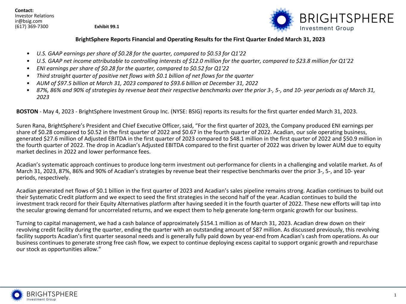 1 Contact: Investor Relations ir@bsig.com (617) 369-7300 Exhibit 99.1 BrightSphere Reports Financial and Operating Results for the First Quarter Ended March 31, 2023 • U.S. GAAP earnings per share of $0.28 for the quarter, compared to $0.53 for Q1'22 • U.S. GAAP net income attributable to controlling interests of $12.0 million for the quarter, compared to $23.8 million for Q1'22 • ENI earnings per share of $0.28 for the quarter, compared to $0.52 for Q1'22 • Third straight quarter of positive net flows with $0.1 billion of net flows for the quarter • AUM of $97.5 billion at March 31, 2023 compared to $93.6 billion at December 31, 2022 • 87%, 86% and 90% of strategies by revenue beat their respective benchmarks over the prior 3-, 5-, and 10- year periods as of March 31, 2023 BOSTON - May 4, 2023 - BrightSphere Investment Group Inc. (NYSE: BSIG) reports its results for the first quarter ended March 31, 2023. Suren Rana, BrightSphere’s President and Chief Executive Officer, said, “For the first quarter of 2023, the Company produced ENI earnings per share of $0.28 compared to $0.52 in the first quarter of 2022 and $0.67 in the fourth quarter of 2022. Acadian, our sole operating business, generated $27.6 million of Adjusted EBITDA in the first quarter of 2023 compared to $48.1 million in the first quarter of 2022 and $50.9 million in the fourth quarter of 2022. The drop in Acadian’s Adjusted EBITDA compared to the first quarter of 2022 was driven by lower AUM due to equity market declines in 2022 and lower performance fees. Acadian’s systematic approach continues to produce long-term investment out-performance for clients in a challenging and volatile market. As of March 31, 2023, 87%, 86% and 90% of Acadian’s strategies by revenue beat their respective benchmarks over the prior 3-, 5-, and 10- year periods, respectively. Acadian generated net flows of $0.1 billion in the first quarter of 2023 and Acadian’s sales pipeline remains strong. Acadian continues to build out their Systematic Credit platform and we expect to seed the first strategies in the second half of the year. Acadian continues to build the investment track record for their Equity Alternatives platform after having seeded it in the fourth quarter of 2022. These new efforts will tap into the secular growing demand for uncorrelated returns, and we expect them to help generate long-term organic growth for our business. Turning to capital management, we had a cash balance of approximately $154.1 million as of March 31, 2023. Acadian drew down on their revolving credit facility during the quarter, ending the quarter with an outstanding amount of $87 million. As discussed previously, this revolving facility supports Acadian’s first quarter seasonal needs and is generally fully paid down by year-end from Acadian’s cash from operations. As our business continues to generate strong free cash flow, we expect to continue deploying excess capital to support organic growth and repurchase our stock as opportunities allow.”