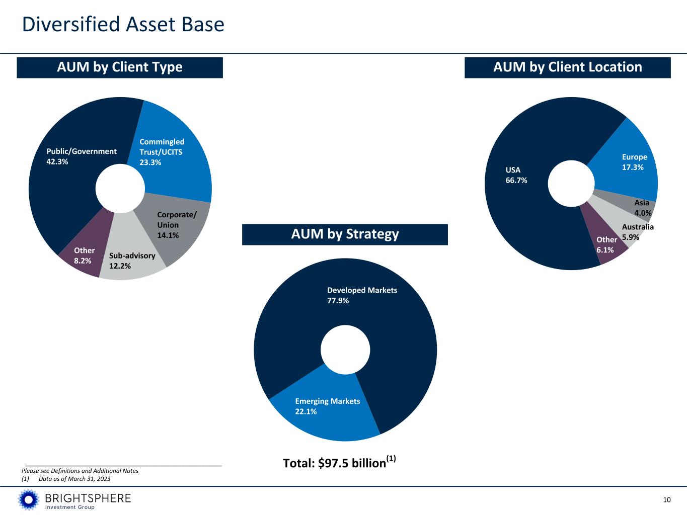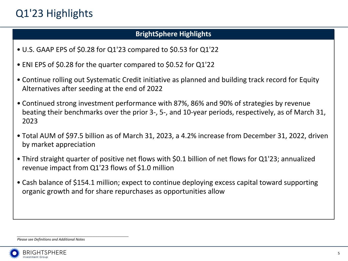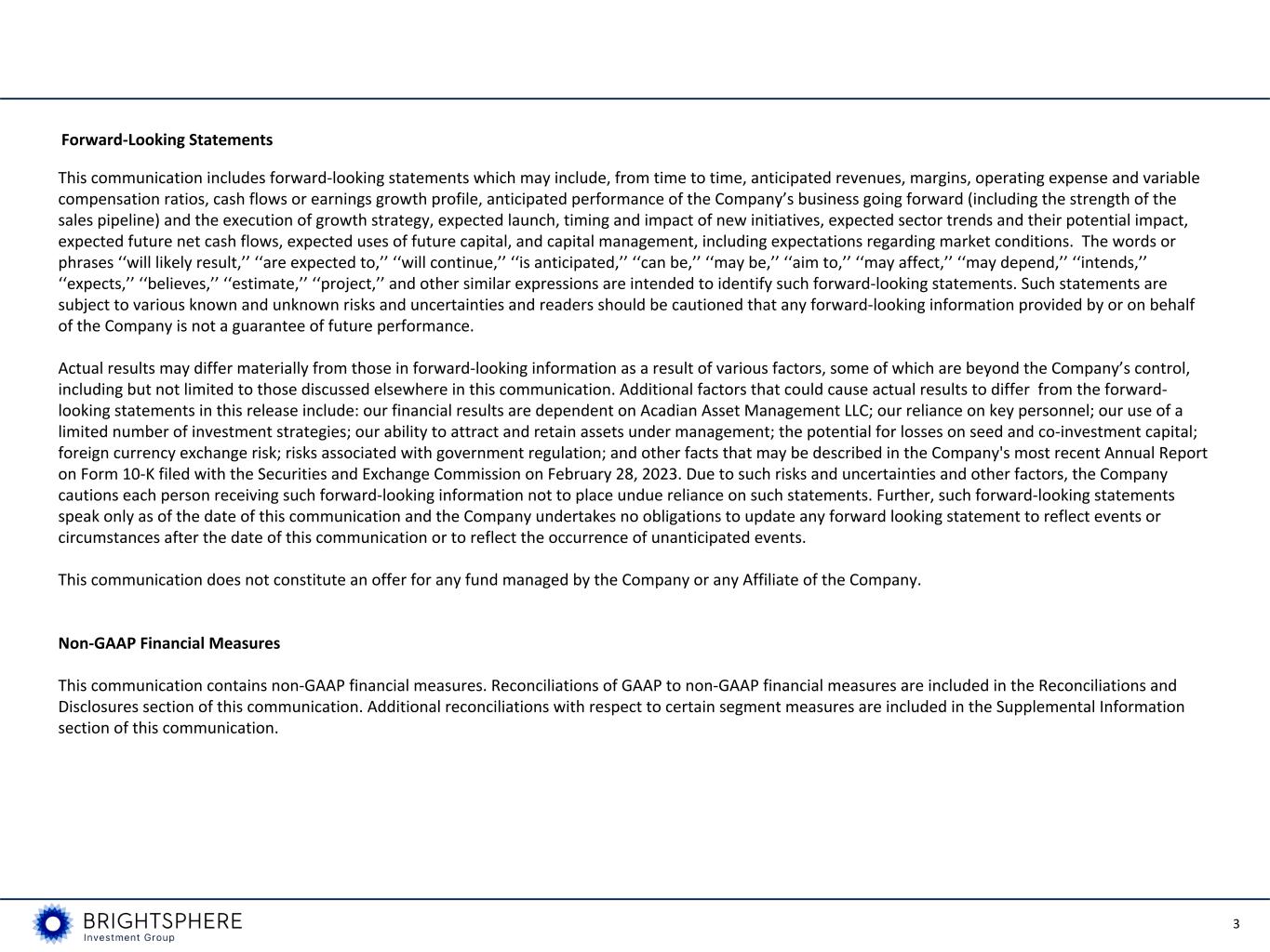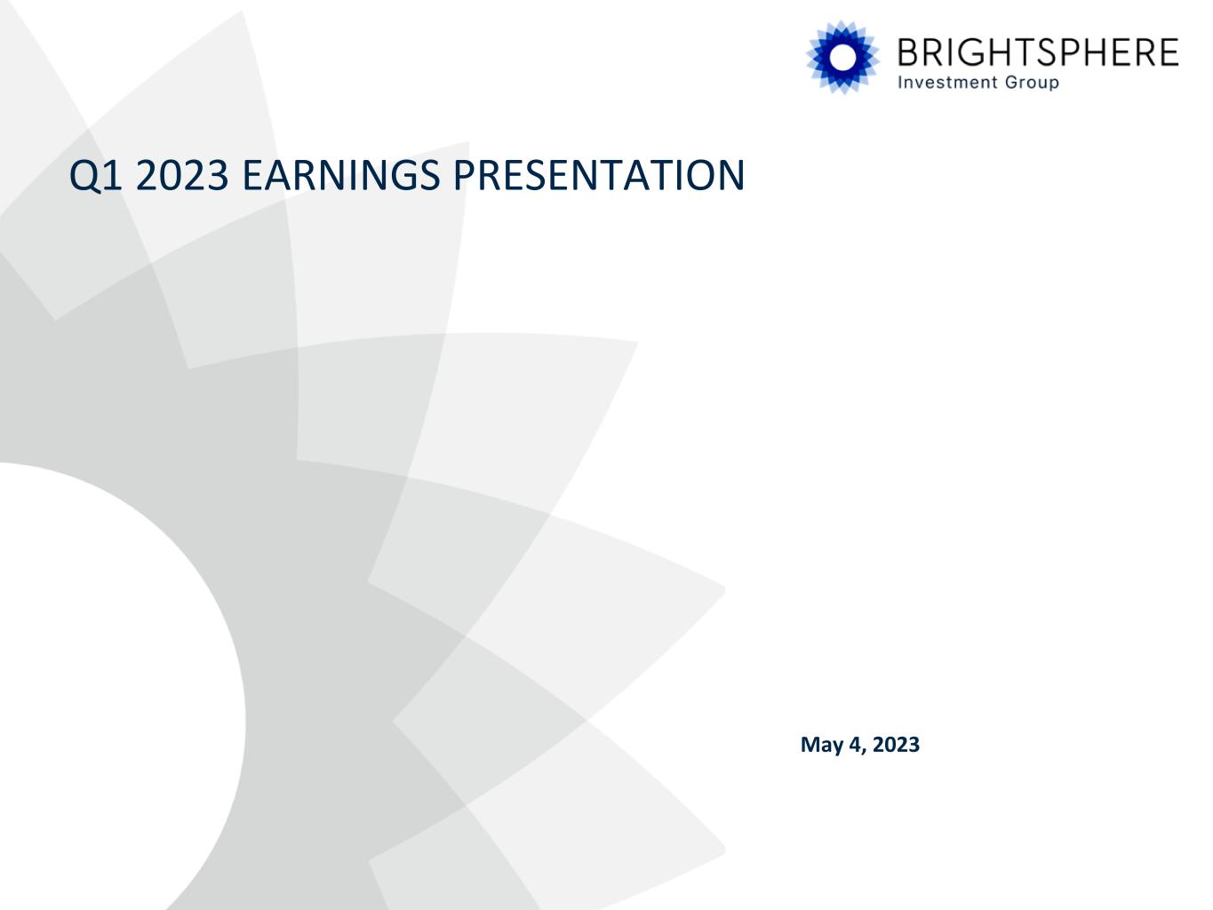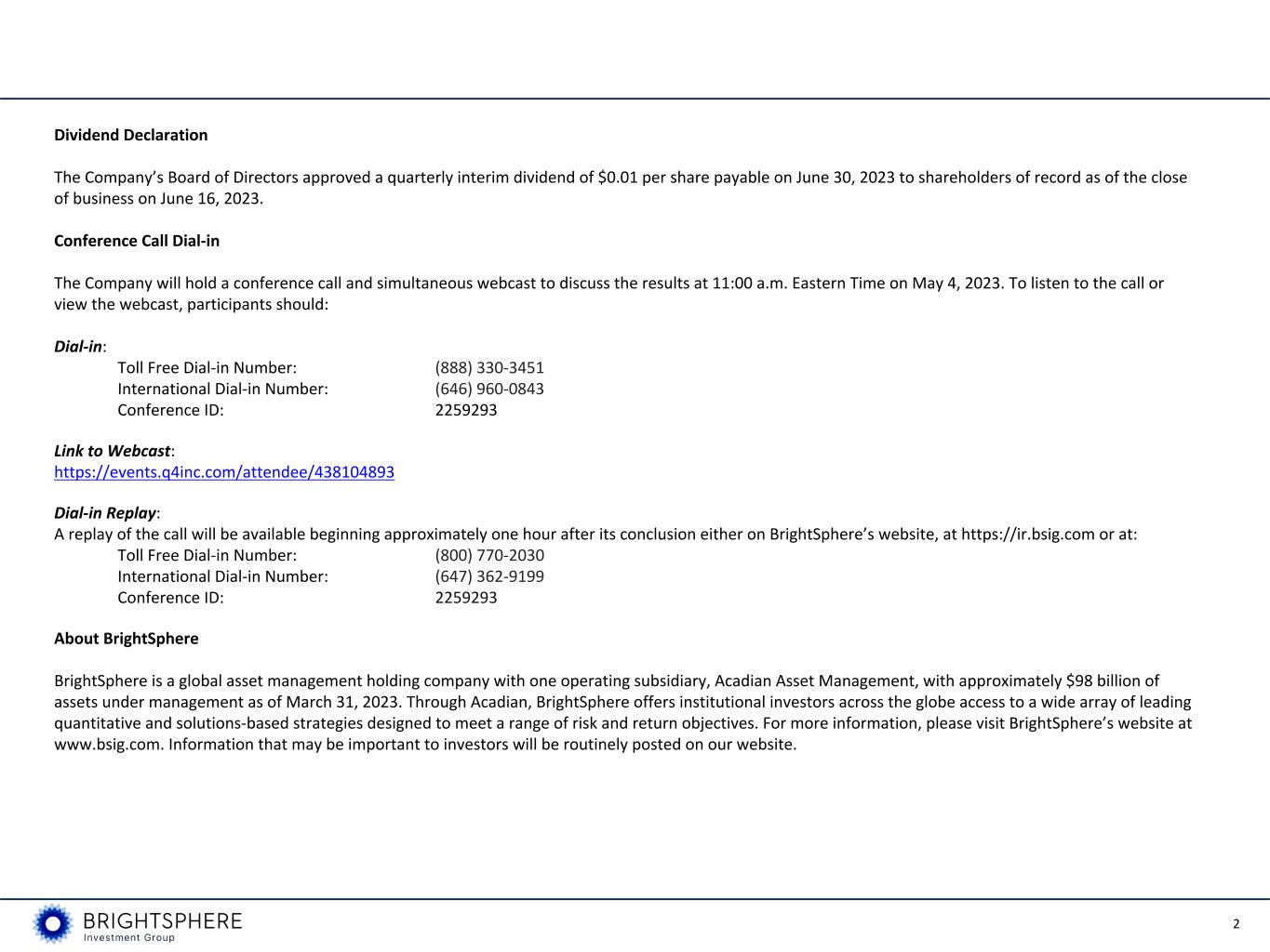 2 Dividend Declaration The Company’s Board of Directors approved a quarterly interim dividend of $0.01 per share payable on June 30, 2023 to shareholders of record as of the close of business on June 16, 2023. Conference Call Dial-in The Company will hold a conference call and simultaneous webcast to discuss the results at 11:00 a.m. Eastern Time on May 4, 2023. To listen to the call or view the webcast, participants should: Dial-in: Toll Free Dial-in Number: (888) 330-3451 International Dial-in Number: (646) 960-0843 Conference ID: 2259293 Link to Webcast: https://events.q4inc.com/attendee/438104893 Dial-in Replay: A replay of the call will be available beginning approximately one hour after its conclusion either on BrightSphere’s website, at https://ir.bsig.com or at: Toll Free Dial-in Number: (800) 770-2030 International Dial-in Number: (647) 362-9199 Conference ID: 2259293 About BrightSphere BrightSphere is a global asset management holding company with one operating subsidiary, Acadian Asset Management, with approximately $98 billion of assets under management as of March 31, 2023. Through Acadian, BrightSphere offers institutional investors across the globe access to a wide array of leading quantitative and solutions-based strategies designed to meet a range of risk and return objectives. For more information, please visit BrightSphere’s website at www.bsig.com. Information that may be important to investors will be routinely posted on our website.