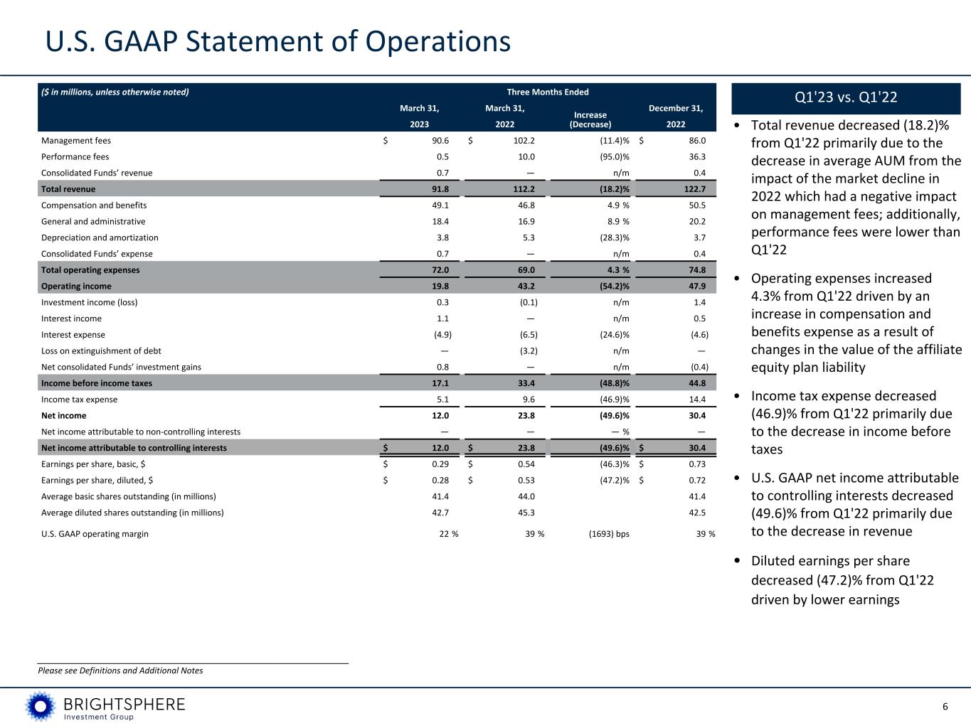5 • U.S. GAAP EPS of $0.28 for Q1'23 compared to $0.53 for Q1'22 • ENI EPS of $0.28 for the quarter compared to $0.52 for Q1'22 • Continue rolling out Systematic Credit initiative as planned and building track record for Equity Alternatives after seeding at the end of 2022 • Continued strong investment performance with 87%, 86% and 90% of strategies by revenue beating their benchmarks over the prior 3-, 5-, and 10-year periods, respectively, as of March 31, 2023 • Total AUM of $97.5 billion as of March 31, 2023, a 4.2% increase from December 31, 2022, driven by market appreciation • Third straight quarter of positive net flows with $0.1 billion of net flows for Q1'23; annualized revenue impact from Q1'23 flows of $1.0 million • Cash balance of $154.1 million; expect to continue deploying excess capital toward supporting organic growth and for share repurchases as opportunities allow BrightSphere Highlights Q1'23 Highlights __________________________________________________________ Please see Definitions and Additional Notes