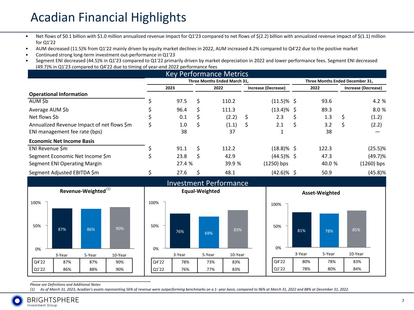 6 • Total revenue decreased (18.2)% from Q1'22 primarily due to the decrease in average AUM from the impact of the market decline in 2022 which had a negative impact on management fees; additionally, performance fees were lower than Q1'22 • Operating expenses increased 4.3% from Q1'22 driven by an increase in compensation and benefits expense as a result of changes in the value of the affiliate equity plan liability • Income tax expense decreased (46.9)% from Q1'22 primarily due to the decrease in income before taxes • U.S. GAAP net income attributable to controlling interests decreased (49.6)% from Q1'22 primarily due to the decrease in revenue • Diluted earnings per share decreased (47.2)% from Q1'22 driven by lower earnings U.S. GAAP Statement of Operations ($ in millions, unless otherwise noted) Three Months Ended March 31, March 31, Increase (Decrease) December 31, 2023 2022 2022 Management fees $ 90.6 $ 102.2 (11.4) % $ 86.0 Performance fees 0.5 10.0 (95.0) % 36.3 Consolidated Funds’ revenue 0.7 — n/m 0.4 Total revenue 91.8 112.2 (18.2) % 122.7 Compensation and benefits 49.1 46.8 4.9 % 50.5 General and administrative 18.4 16.9 8.9 % 20.2 Depreciation and amortization 3.8 5.3 (28.3) % 3.7 Consolidated Funds’ expense 0.7 — n/m 0.4 Total operating expenses 72.0 69.0 4.3 % 74.8 Operating income 19.8 43.2 (54.2) % 47.9 Investment income (loss) 0.3 (0.1) n/m 1.4 Interest income 1.1 — n/m 0.5 Interest expense (4.9) (6.5) (24.6) % (4.6) Loss on extinguishment of debt — (3.2) n/m — Net consolidated Funds’ investment gains 0.8 — n/m (0.4) Income before income taxes 17.1 33.4 (48.8) % 44.8 Income tax expense 5.1 9.6 (46.9) % 14.4 Net income 12.0 23.8 (49.6) % 30.4 Net income attributable to non-controlling interests — — — % — Net income attributable to controlling interests $ 12.0 $ 23.8 (49.6) % $ 30.4 Earnings per share, basic, $ $ 0.29 $ 0.54 (46.3) % $ 0.73 Earnings per share, diluted, $ $ 0.28 $ 0.53 (47.2) % $ 0.72 Average basic shares outstanding (in millions) 41.4 44.0 41.4 Average diluted shares outstanding (in millions) 42.7 45.3 42.5 U.S. GAAP operating margin 22 % 39 % (1693) bps 39 % Q1'23 vs. Q1'22 __________________________________________________________ Please see Definitions and Additional Notes