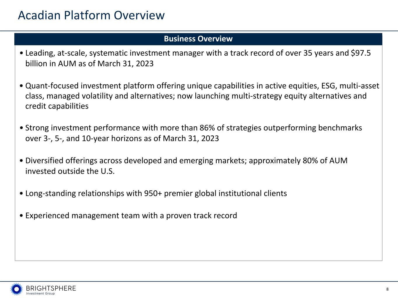 7 Revenue-Weighted 87% 86% 90% 3-Year 5-Year 10-Year 0% 50% 100% Equal-Weighted 76% 69% 83% 3-Year 5-Year 10-Year 0% 50% 100% Acadian Financial Highlights • Net flows of $0.1 billion with $1.0 million annualized revenue impact for Q1'23 compared to net flows of $(2.2) billion with annualized revenue impact of $(1.1) million for Q1'22 • AUM decreased (11.5)% from Q1'22 mainly driven by equity market declines in 2022, AUM increased 4.2% compared to Q4'22 due to the positive market • Continued strong long-term investment out-performance in Q1'23 • Segment ENI decreased (44.5)% in Q1'23 compared to Q1'22 primarily driven by market depreciation in 2022 and lower performance fees. Segment ENI decreased (49.7)% in Q1'23 compared to Q4'22 due to timing of year-end 2022 performance fees Investment Performance Q4’22 87% 87% 90% Q1’22 86% 88% 90% Q4’22 78% 73% 83% Q1’22 76% 77% 83% Asset-Weighted 81% 78% 85% 3-Year 5-Year 10-Year 0% 50% 100% Q4’22 80% 78% 83% Q1’22 78% 80% 84% Key Performance Metrics Three Months Ended March 31, Three Months Ended December 31, 2023 2022 Increase (Decrease) 2022 Increase (Decrease) Operational Information AUM $b $ 97.5 $ 110.2 (11.5) % $ 93.6 4.2 % Average AUM $b $ 96.4 $ 111.3 (13.4) % $ 89.3 8.0 % Net flows $b $ 0.1 $ (2.2) $ 2.3 $ 1.3 $ (1.2) Annualized Revenue Impact of net flows $m $ 1.0 $ (1.1) $ 2.1 $ 3.2 $ (2.2) ENI management fee rate (bps) 38 37 1 38 — Economic Net Income Basis ENI Revenue $m $ 91.1 $ 112.2 (18.8) % $ 122.3 (25.5) % Segment Economic Net Income $m $ 23.8 $ 42.9 (44.5) % $ 47.3 (49.7) % Segment ENI Operating Margin 27.4 % 39.9 % (1250) bps 40.0 % (1260) bps Segment Adjusted EBITDA $m $ 27.6 $ 48.1 (42.6) % $ 50.9 (45.8) % ___________________________________________________________ Please see Definitions and Additional Notes (1) As of March 31, 2023, Acadian’s assets representing 56% of revenue were outperforming benchmarks on a 1- year basis, compared to 96% at March 31, 2022 and 88% at December 31, 2022. (1)