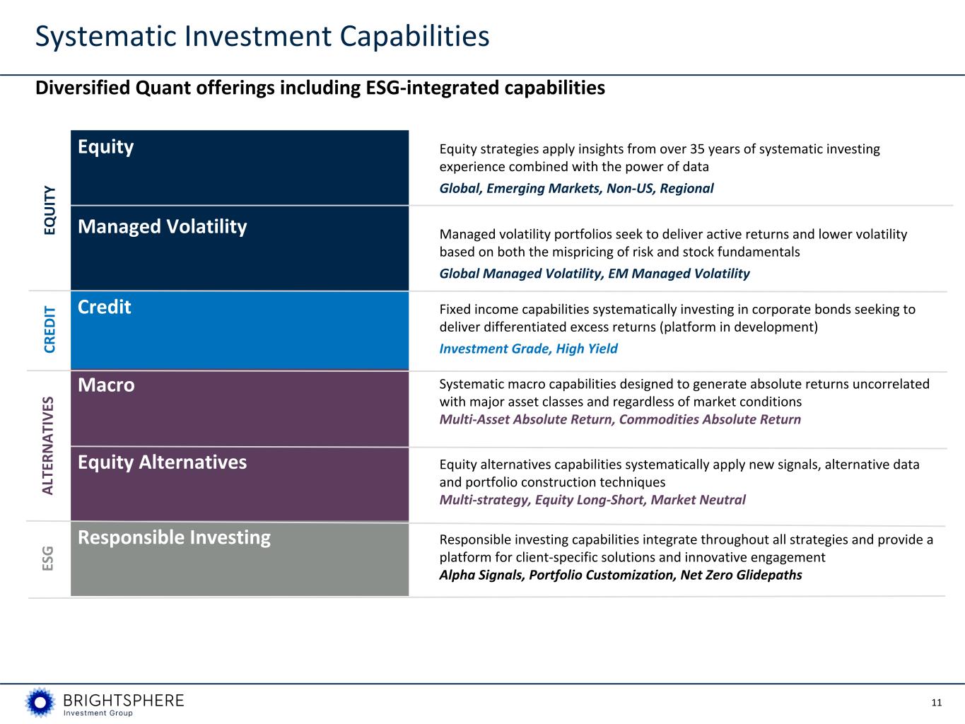 11 Equity strategies apply insights from over 35 years of systematic investing experience combined with the power of data Global, Emerging Markets, Non-US, Regional Managed volatility portfolios seek to deliver active returns and lower volatility based on both the mispricing of risk and stock fundamentals Global Managed Volatility, EM Managed Volatility Fixed income capabilities systematically investing in corporate bonds seeking to deliver differentiated excess returns (platform in development) Investment Grade, High Yield Systematic macro capabilities designed to generate absolute returns uncorrelated with major asset classes and regardless of market conditions Multi-Asset Absolute Return, Commodities Absolute Return Equity alternatives capabilities systematically apply new signals, alternative data and portfolio construction techniques Multi-strategy, Equity Long-Short, Market Neutral Responsible investing capabilities integrate throughout all strategies and provide a platform for client-specific solutions and innovative engagement Alpha Signals, Portfolio Customization, Net Zero Glidepaths Diversified Quant offerings including ESG-integrated capabilities Managed VolatilityEQ U IT Y CR ED IT Credit Macro Equity Alternatives A LT ER N A TI V ES ES G Responsible Investing Systematic Investment Capabilities Equity