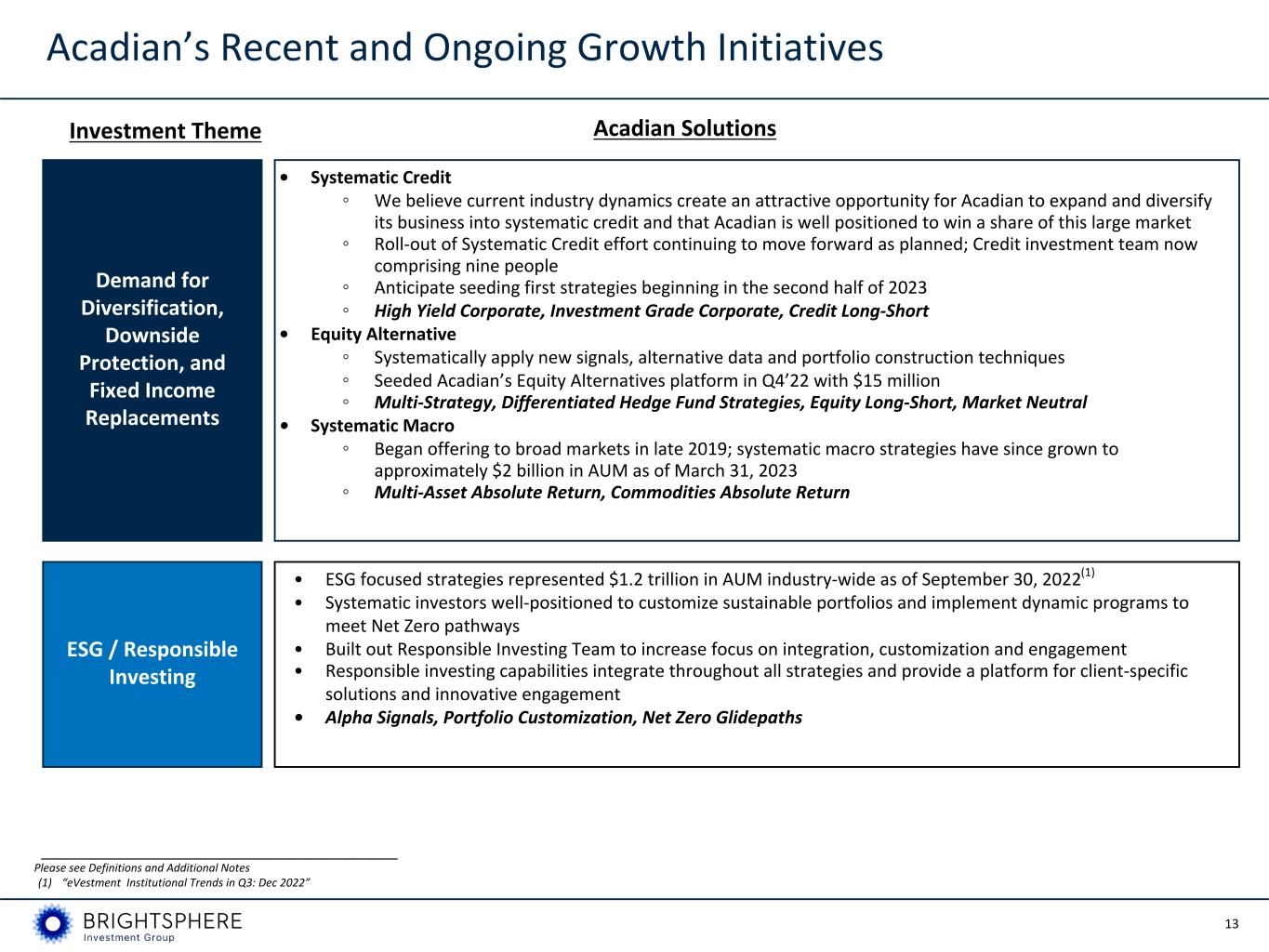 12 Sector Tailwinds Expected to Support Organic Long-term Growth Alpha Secular Trends Anticipated Impact for Acadian Acadian Brand and Barriers to Entry Organic Growth Applying Data and Expertise to New Capabilities Explosive Growth in Alternative Data Continued Development of Advanced Techniques: Machine Learning, AI Scale of Investment in Data, Technology, and Talent Increasingly Important Growing Demand for Uncorrelated Strategies and Customization