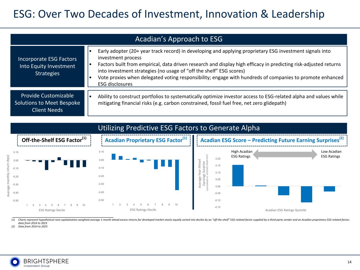 13 • ESG focused strategies represented $1.2 trillion in AUM industry-wide as of September 30, 2022(1) • Systematic investors well-positioned to customize sustainable portfolios and implement dynamic programs to meet Net Zero pathways • Built out Responsible Investing Team to increase focus on integration, customization and engagement • Responsible investing capabilities integrate throughout all strategies and provide a platform for client-specific solutions and innovative engagement • Alpha Signals, Portfolio Customization, Net Zero Glidepaths • Systematic Credit ◦ We believe current industry dynamics create an attractive opportunity for Acadian to expand and diversify its business into systematic credit and that Acadian is well positioned to win a share of this large market ◦ Roll-out of Systematic Credit effort continuing to move forward as planned; Credit investment team now comprising nine people ◦ Anticipate seeding first strategies beginning in the second half of 2023 ◦ High Yield Corporate, Investment Grade Corporate, Credit Long-Short • Equity Alternative ◦ Systematically apply new signals, alternative data and portfolio construction techniques ◦ Seeded Acadian’s Equity Alternatives platform in Q4’22 with $15 million ◦ Multi-Strategy, Differentiated Hedge Fund Strategies, Equity Long-Short, Market Neutral • Systematic Macro ◦ Began offering to broad markets in late 2019; systematic macro strategies have since grown to approximately $2 billion in AUM as of March 31, 2023 ◦ Multi-Asset Absolute Return, Commodities Absolute Return Demand for Diversification, Downside Protection, and Fixed Income Replacements Acadian’s Recent and Ongoing Growth Initiatives Investment Theme Acadian Solutions ESG / Responsible Investing __________________________________________________________ Please see Definitions and Additional Notes (1) “eVestment Institutional Trends in Q3: Dec 2022”