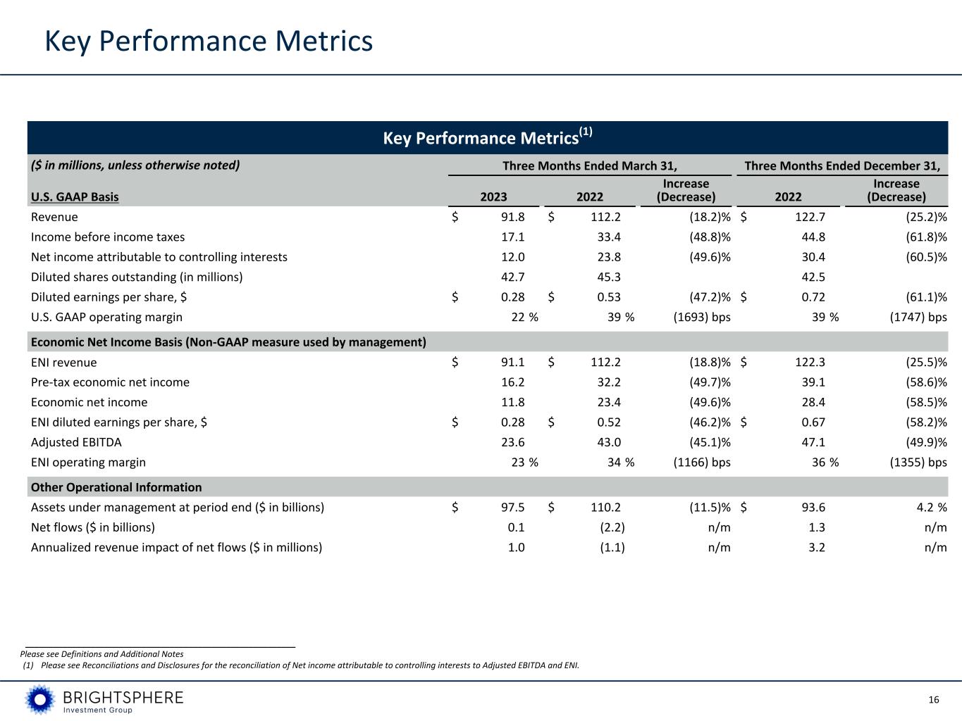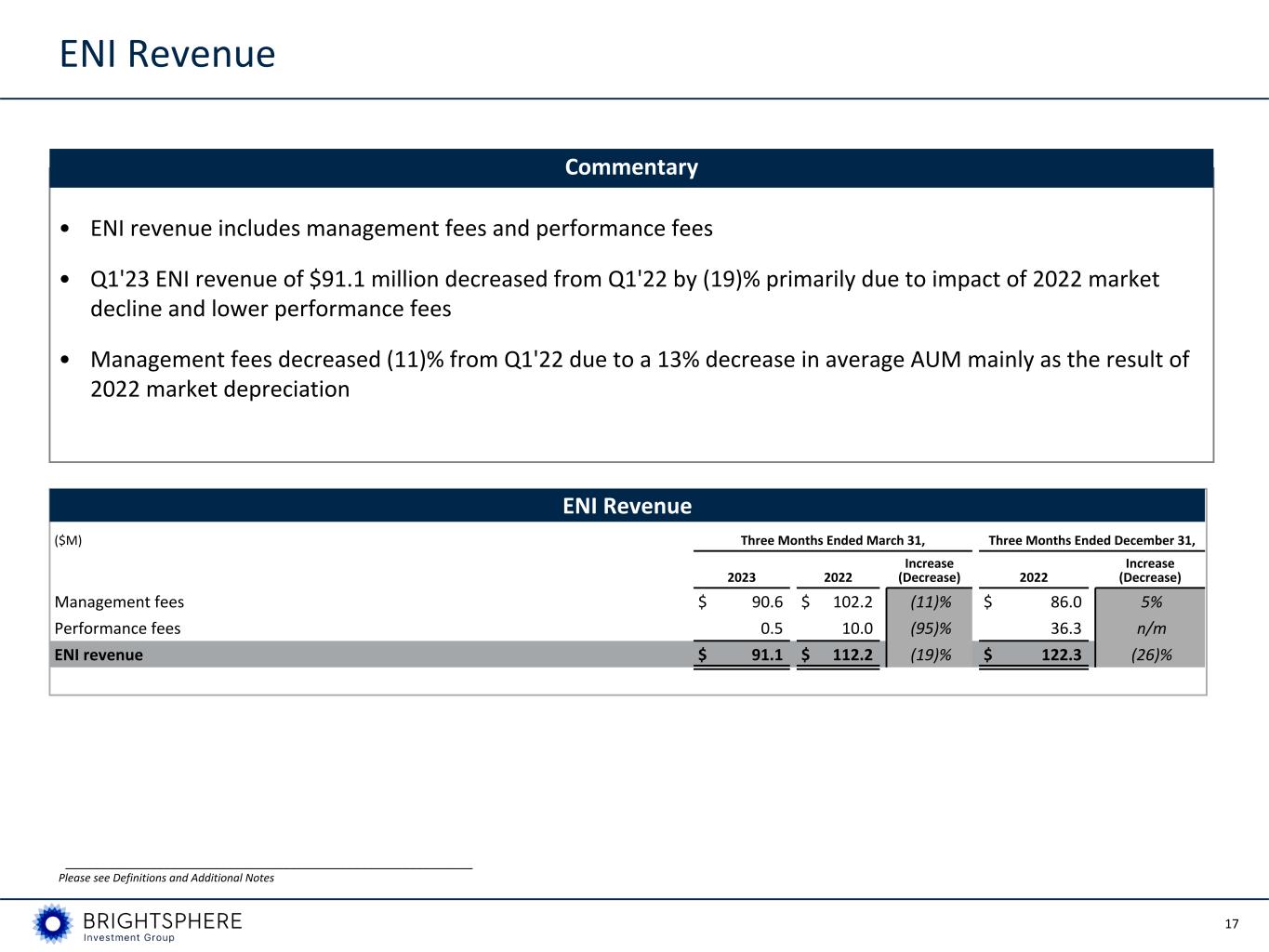 16 Key Performance Metrics Key Performance Metrics(1) ($ in millions, unless otherwise noted) Three Months Ended March 31, Three Months Ended December 31, U.S. GAAP Basis 2023 2022 Increase (Decrease) 2022 Increase (Decrease) Revenue $ 91.8 $ 112.2 (18.2) % $ 122.7 (25.2) % Income before income taxes 17.1 33.4 (48.8) % 44.8 (61.8) % Net income attributable to controlling interests 12.0 23.8 (49.6) % 30.4 (60.5) % Diluted shares outstanding (in millions) 42.7 45.3 42.5 Diluted earnings per share, $ $ 0.28 $ 0.53 (47.2) % $ 0.72 (61.1) % U.S. GAAP operating margin 22 % 39 % (1693) bps 39 % (1747) bps Economic Net Income Basis (Non-GAAP measure used by management) ENI revenue $ 91.1 $ 112.2 (18.8) % $ 122.3 (25.5) % Pre-tax economic net income 16.2 32.2 (49.7) % 39.1 (58.6) % Economic net income 11.8 23.4 (49.6) % 28.4 (58.5) % ENI diluted earnings per share, $ $ 0.28 $ 0.52 (46.2) % $ 0.67 (58.2) % Adjusted EBITDA 23.6 43.0 (45.1) % 47.1 (49.9) % ENI operating margin 23 % 34 % (1166) bps 36 % (1355) bps Other Operational Information Assets under management at period end ($ in billions) $ 97.5 $ 110.2 (11.5) % $ 93.6 4.2 % Net flows ($ in billions) 0.1 (2.2) n/m 1.3 n/m Annualized revenue impact of net flows ($ in millions) 1.0 (1.1) n/m 3.2 n/m __________________________________________________________ Please see Definitions and Additional Notes (1) Please see Reconciliations and Disclosures for the reconciliation of Net income attributable to controlling interests to Adjusted EBITDA and ENI.