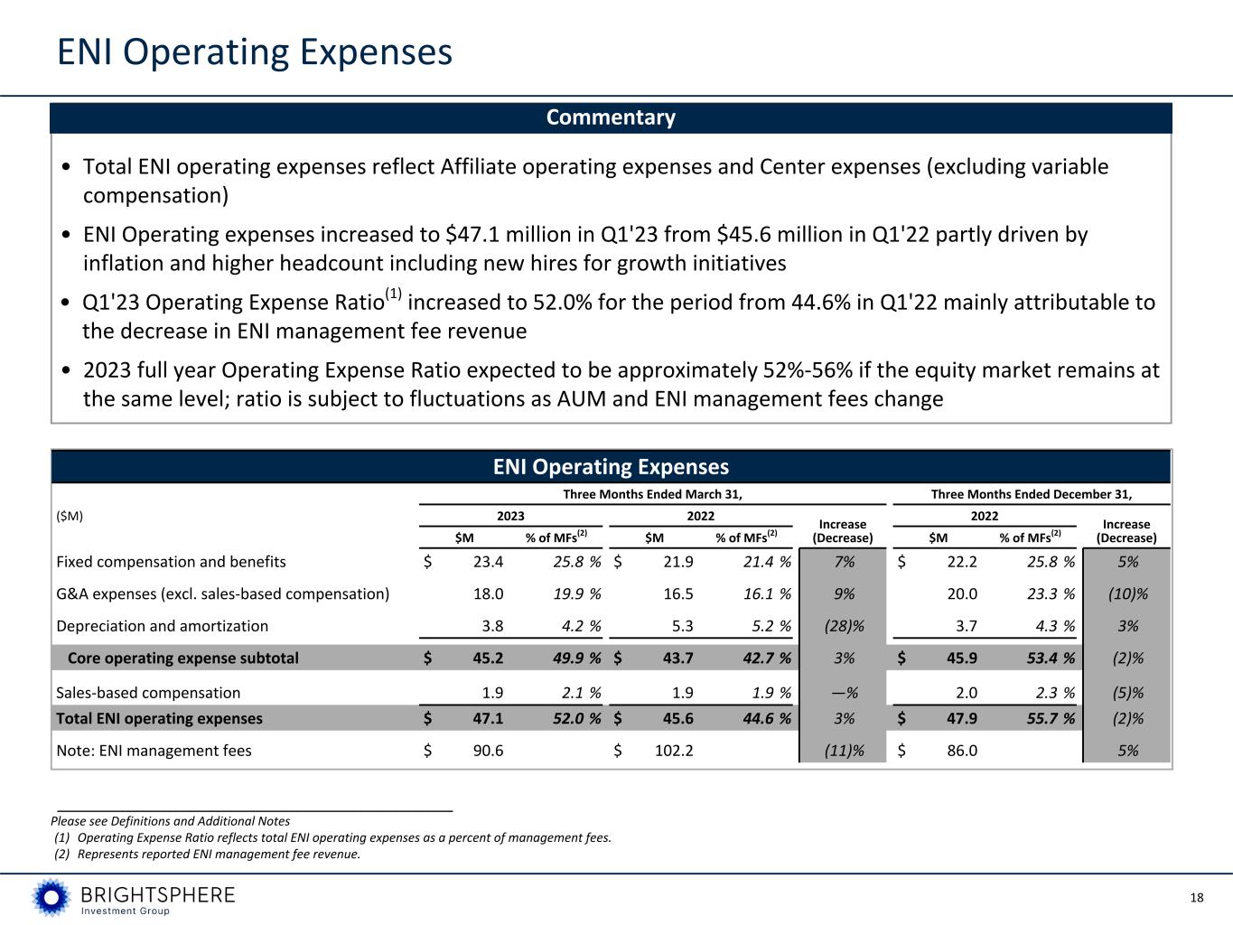 17 ENI Revenue • ENI revenue includes management fees and performance fees • Q1'23 ENI revenue of $91.1 million decreased from Q1'22 by (19)% primarily due to impact of 2022 market decline and lower performance fees • Management fees decreased (11)% from Q1'22 due to a 13% decrease in average AUM mainly as the result of 2022 market depreciation Commentary ENI Revenue ($M) Three Months Ended March 31, Three Months Ended December 31, 2023 2022 Increase (Decrease) 2022 Increase (Decrease) Management fees $ 90.6 $ 102.2 (11)% $ 86.0 5% Performance fees 0.5 10.0 (95)% 36.3 n/m ENI revenue $ 91.1 $ 112.2 (19)% $ 122.3 (26)% __________________________________________________________ Please see Definitions and Additional Notes