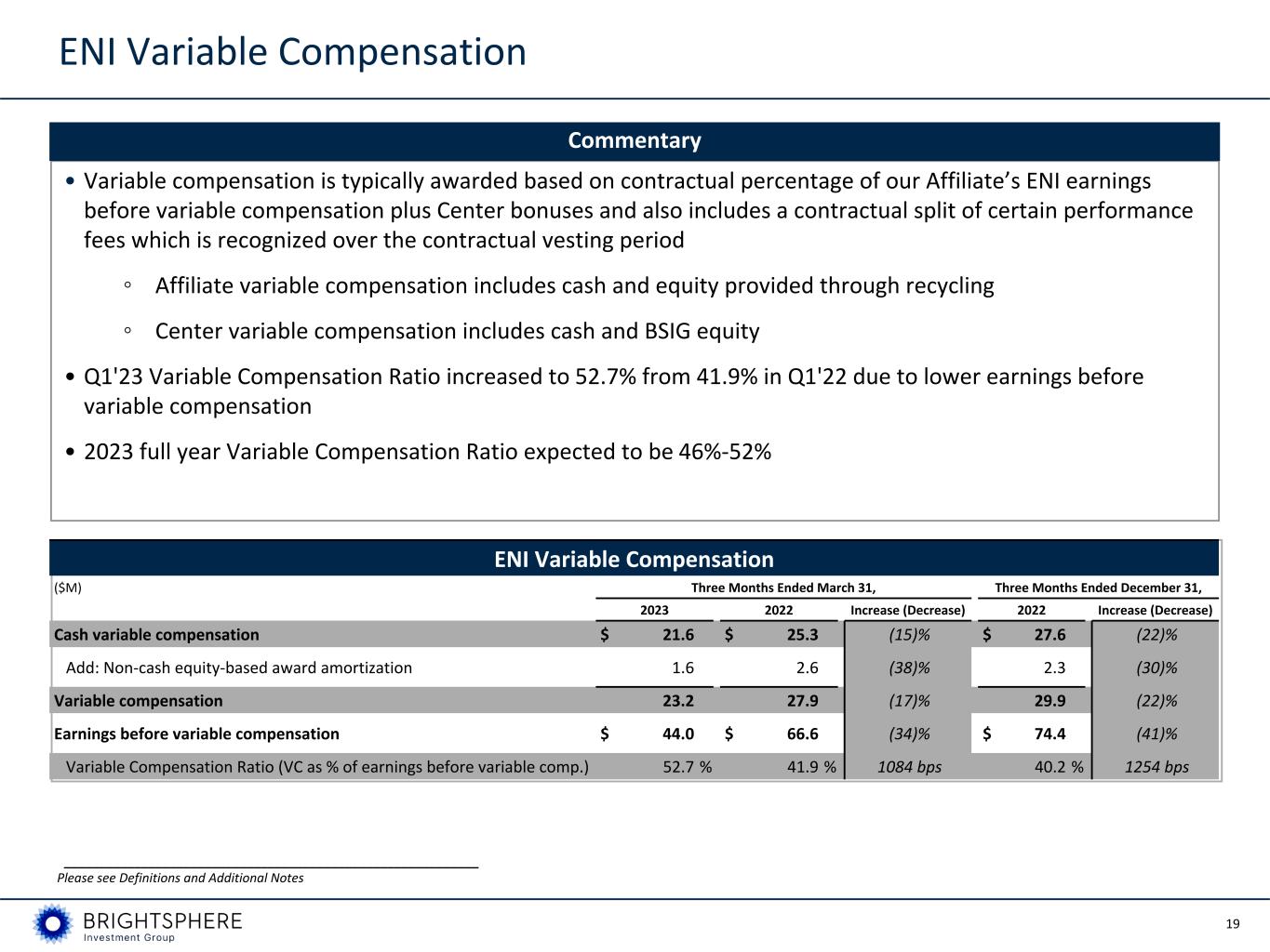 18 ENI Operating Expenses Three Months Ended March 31, Three Months Ended December 31, ($M) 2023 2022 Increase (Decrease) 2022 Increase (Decrease)$M % of MFs(2) $M % of MFs(2) $M % of MFs(2) Fixed compensation and benefits $ 23.4 25.8 % $ 21.9 21.4 % 7% $ 22.2 25.8 % 5% G&A expenses (excl. sales-based compensation) 18.0 19.9 % 16.5 16.1 % 9% 20.0 23.3 % (10)% Depreciation and amortization 3.8 4.2 % 5.3 5.2 % (28)% 3.7 4.3 % 3% Core operating expense subtotal $ 45.2 49.9 % $ 43.7 42.7 % 3% $ 45.9 53.4 % (2)% Sales-based compensation 1.9 2.1 % 1.9 1.9 % —% 2.0 2.3 % (5)% Total ENI operating expenses $ 47.1 52.0 % $ 45.6 44.6 % 3% $ 47.9 55.7 % (2)% Note: ENI management fees $ 90.6 $ 102.2 (11)% $ 86.0 5% • Total ENI operating expenses reflect Affiliate operating expenses and Center expenses (excluding variable compensation) • ENI Operating expenses increased to $47.1 million in Q1'23 from $45.6 million in Q1'22 partly driven by inflation and higher headcount including new hires for growth initiatives • Q1'23 Operating Expense Ratio(1) increased to 52.0% for the period from 44.6% in Q1'22 mainly attributable to the decrease in ENI management fee revenue • 2023 full year Operating Expense Ratio expected to be approximately 52%-56% if the equity market remains at the same level; ratio is subject to fluctuations as AUM and ENI management fees change __________________________________________________________ Please see Definitions and Additional Notes (1) Operating Expense Ratio reflects total ENI operating expenses as a percent of management fees. (2) Represents reported ENI management fee revenue. ENI Operating Expenses Commentary