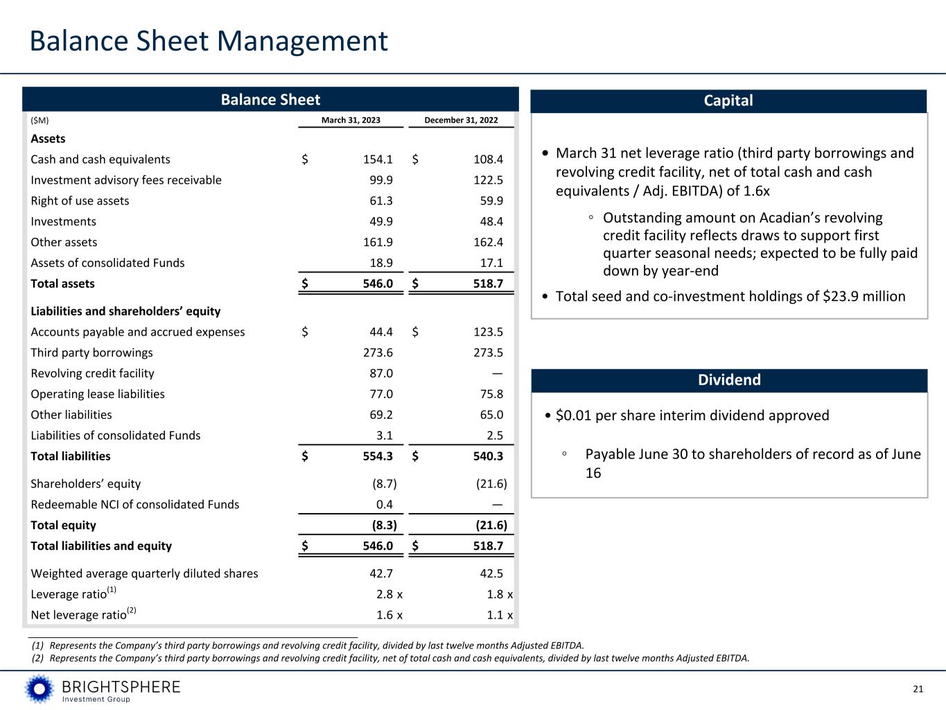 21 Balance Sheet ($M) March 31, 2023 December 31, 2022 Assets Cash and cash equivalents $ 154.1 $ 108.4 Investment advisory fees receivable 99.9 122.5 Right of use assets 61.3 59.9 Investments 49.9 48.4 Other assets 161.9 162.4 Assets of consolidated Funds 18.9 17.1 Total assets $ 546.0 $ 518.7 Liabilities and shareholders’ equity Accounts payable and accrued expenses $ 44.4 $ 123.5 Third party borrowings 273.6 273.5 Revolving credit facility 87.0 — Operating lease liabilities 77.0 75.8 Other liabilities 69.2 65.0 Liabilities of consolidated Funds 3.1 2.5 Total liabilities $ 554.3 $ 540.3 Shareholders’ equity (8.7) (21.6) Redeemable NCI of consolidated Funds 0.4 — Total equity (8.3) (21.6) Total liabilities and equity $ 546.0 $ 518.7 Weighted average quarterly diluted shares 42.7 42.5 Leverage ratio(1) 2.8 x 1.8 x Net leverage ratio(2) 1.6 x 1.1 x Balance Sheet Management • $0.01 per share interim dividend approved ◦ Payable June 30 to shareholders of record as of June 16 • March 31 net leverage ratio (third party borrowings and revolving credit facility, net of total cash and cash equivalents / Adj. EBITDA) of 1.6x ◦ Outstanding amount on Acadian’s revolving credit facility reflects draws to support first quarter seasonal needs; expected to be fully paid down by year-end • Total seed and co-investment holdings of $23.9 million Capital Dividend _______________________________________________________________ (1) Represents the Company’s third party borrowings and revolving credit facility, divided by last twelve months Adjusted EBITDA. (2) Represents the Company’s third party borrowings and revolving credit facility, net of total cash and cash equivalents, divided by last twelve months Adjusted EBITDA.