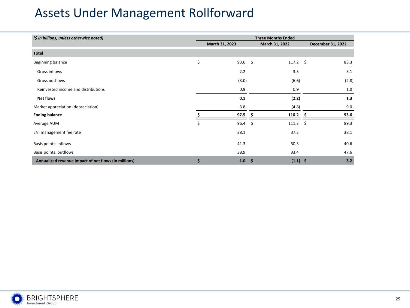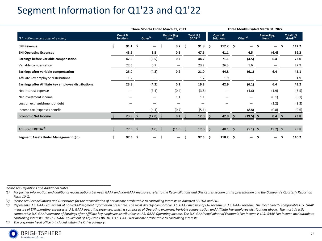 24 Three Months Ended December 31, 2022 ($ in millions, unless otherwise noted) Quant & Solutions Other(4) Reconciling Items(1) Total U.S. GAAP (3) ENI Revenue $ 122.3 $ — $ 0.4 $ 122.7 ENI Operating Expenses 44.3 3.6 (4.6) 43.3 Earnings before variable compensation 78.0 (3.6) 5.0 79.4 Variable compensation 29.1 0.8 — 29.9 Earnings after variable compensation 48.9 (4.4) 5.0 49.5 Affiliate key employee distributions 1.6 — — 1.6 Earnings after Affiliate key employee distributions 47.3 (4.4) 5.0 47.9 Net interest expense — (3.8) (0.3) (4.1) Net investment loss — — 1.0 1.0 Income tax expense — (10.7) (3.7) (14.4) Economic Net Income $ 47.3 $ (18.9) $ 2.0 $ 30.4 Adjusted EBITDA(2) $ 50.9 $ (3.8) $ (16.7) $ 30.4 Segment Assets Under Management ($b) $ 93.6 $ — $ — $ 93.6 Segment Information for Q4'22 __________________________________________________________ Please see Definitions and Additional Notes (1) For further information and additional reconciliations between GAAP and non-GAAP measures, refer to the Reconciliations and Disclosures section of this presentation and the Company’s Quarterly Report on Form 10-Q. (2) Please see Reconciliations and Disclosures for the reconciliation of net income attributable to controlling interests to Adjusted EBITDA and ENI. (3) Represents U.S. GAAP equivalent of non-GAAP segment information presented. The most directly comparable U.S. GAAP measure of ENI revenue is U.S. GAAP revenue. The most directly comparable U.S. GAAP measure of ENI operating expenses is U.S. GAAP operating expenses, which is comprised of Operating expenses, Variable compensation and Affiliate key employee distributions above. The most directly comparable U.S. GAAP measure of Earnings after Affiliate key employee distributions is U.S. GAAP Operating Income. The U.S. GAAP equivalent of Economic Net Income is U.S. GAAP Net Income attributable to controlling interests. The U.S. GAAP equivalent of Adjusted EBITDA is U.S. GAAP Net Income attributable to controlling interests. (4) The corporate head office is included within the Other category.