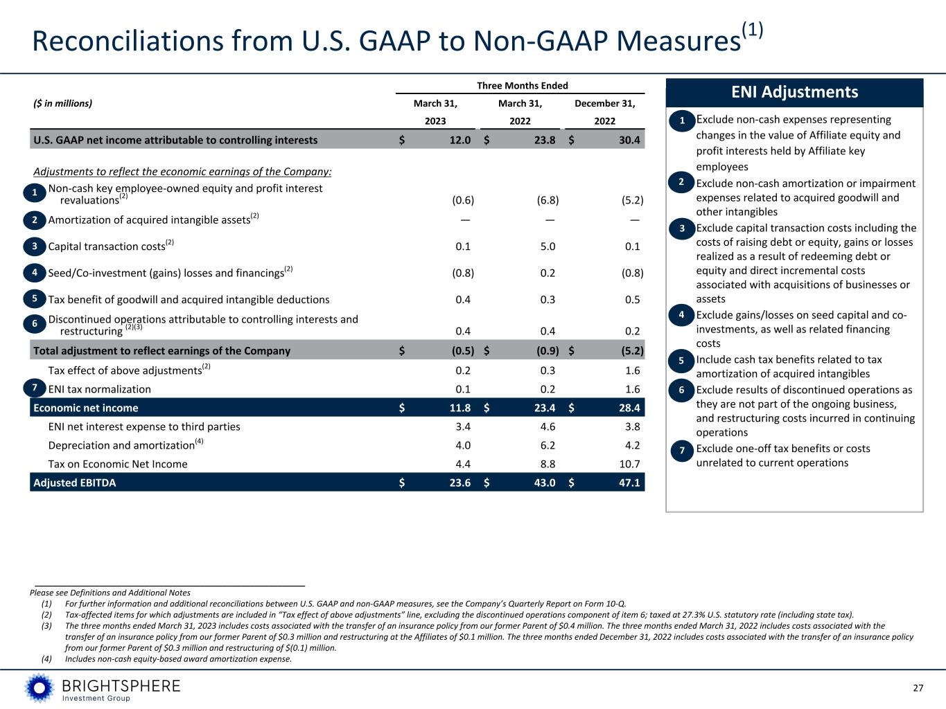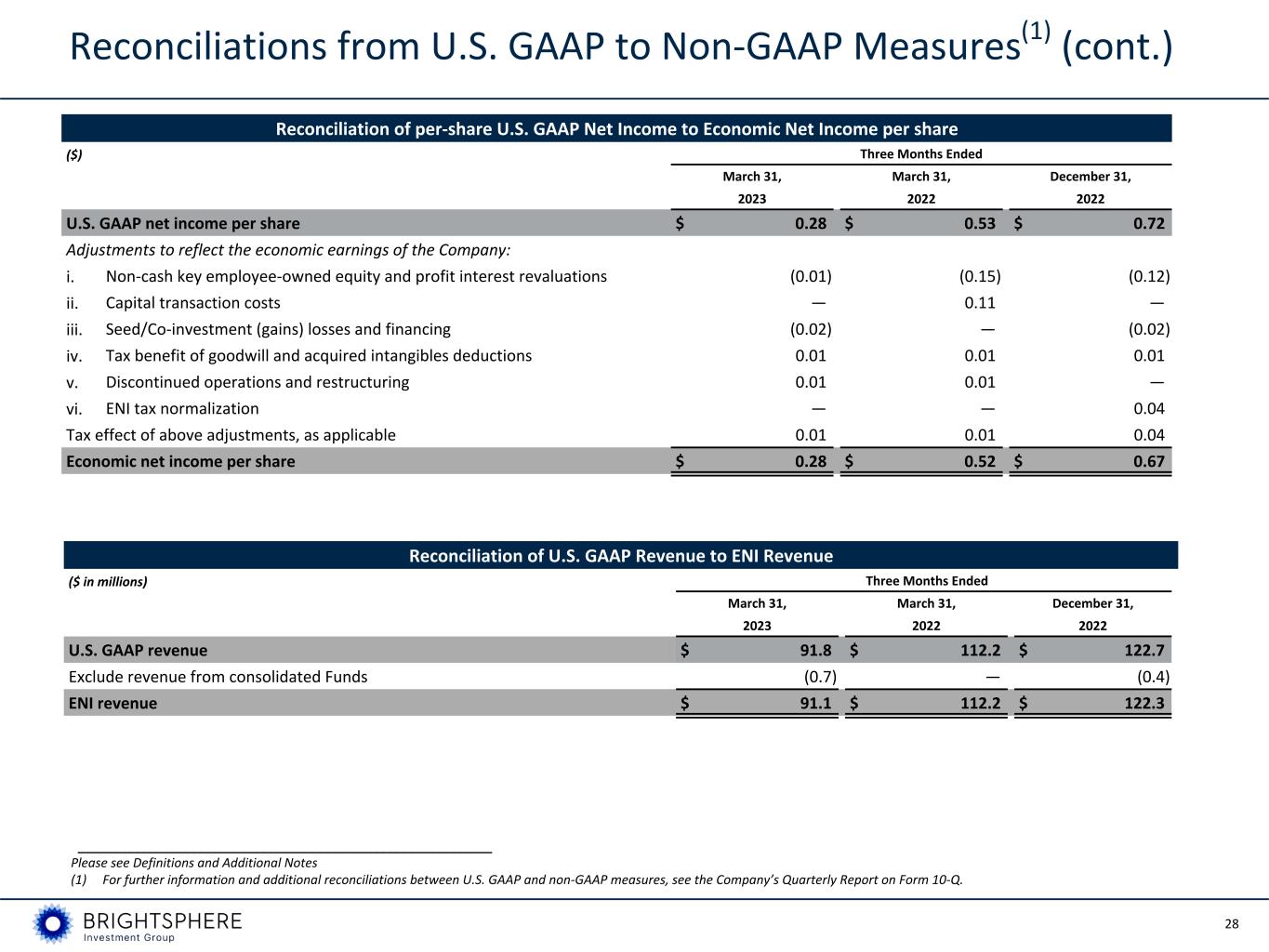 27 Three Months Ended ($ in millions) March 31, March 31, December 31, 2023 2022 2022 U.S. GAAP net income attributable to controlling interests $ 12.0 $ 23.8 $ 30.4 Adjustments to reflect the economic earnings of the Company: Non-cash key employee-owned equity and profit interest revaluations(2) (0.6) (6.8) (5.2) Amortization of acquired intangible assets(2) — — — Capital transaction costs(2) 0.1 5.0 0.1 Seed/Co-investment (gains) losses and financings(2) (0.8) 0.2 (0.8) Tax benefit of goodwill and acquired intangible deductions 0.4 0.3 0.5 Discontinued operations attributable to controlling interests and restructuring (2)(3) 0.4 0.4 0.2 Total adjustment to reflect earnings of the Company $ (0.5) $ (0.9) $ (5.2) Tax effect of above adjustments(2) 0.2 0.3 1.6 ENI tax normalization 0.1 0.2 1.6 Economic net income $ 11.8 $ 23.4 $ 28.4 ENI net interest expense to third parties 3.4 4.6 3.8 Depreciation and amortization(4) 4.0 6.2 4.2 Tax on Economic Net Income 4.4 8.8 10.7 Adjusted EBITDA $ 23.6 $ 43.0 $ 47.1 Reconciliations from U.S. GAAP to Non-GAAP Measures(1) i. Exclude non-cash expenses representing changes in the value of Affiliate equity and profit interests held by Affiliate key employees ii. Exclude non-cash amortization or impairment expenses related to acquired goodwill and other intangibles iii.Exclude capital transaction costs including the costs of raising debt or equity, gains or losses realized as a result of redeeming debt or equity and direct incremental costs associated with acquisitions of businesses or assets iv.Exclude gains/losses on seed capital and co- investments, as well as related financing costs v. Include cash tax benefits related to tax amortization of acquired intangibles vi.Exclude results of discontinued operations as they are not part of the ongoing business, and restructuring costs incurred in continuing operations vii. Exclude one-off tax benefits or costs unrelated to current operations ENI Adjustments ___________________________________________________________ Please see Definitions and Additional Notes (1) For further information and additional reconciliations between U.S. GAAP and non-GAAP measures, see the Company’s Quarterly Report on Form 10-Q. (2) Tax-affected items for which adjustments are included in “Tax effect of above adjustments” line, excluding the discontinued operations component of item 6; taxed at 27.3% U.S. statutory rate (including state tax). (3) The three months ended March 31, 2023 includes costs associated with the transfer of an insurance policy from our former Parent of $0.4 million. The three months ended March 31, 2022 includes costs associated with the transfer of an insurance policy from our former Parent of $0.3 million and restructuring at the Affiliates of $0.1 million. The three months ended December 31, 2022 includes costs associated with the transfer of an insurance policy from our former Parent of $0.3 million and restructuring of $(0.1) million. (4) Includes non-cash equity-based award amortization expense. 1 3 2 3 4 5 7 6 2 1 4 5 6 7