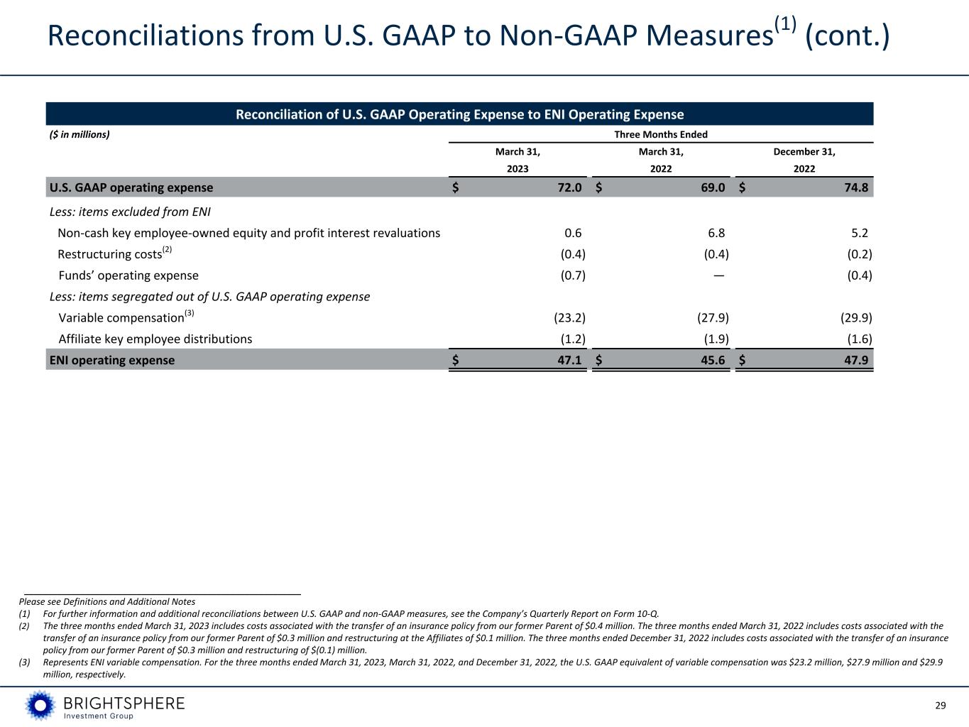 28 Reconciliations from U.S. GAAP to Non-GAAP Measures(1) (cont.) Reconciliation of per-share U.S. GAAP Net Income to Economic Net Income per share ($) Three Months Ended March 31, March 31, December 31, 2023 2022 2022 U.S. GAAP net income per share $ 0.28 $ 0.53 $ 0.72 Adjustments to reflect the economic earnings of the Company: i. Non-cash key employee-owned equity and profit interest revaluations (0.01) (0.15) (0.12) ii. Capital transaction costs — 0.11 — iii. Seed/Co-investment (gains) losses and financing (0.02) — (0.02) iv. Tax benefit of goodwill and acquired intangibles deductions 0.01 0.01 0.01 v. Discontinued operations and restructuring 0.01 0.01 — vi. ENI tax normalization — — 0.04 Tax effect of above adjustments, as applicable 0.01 0.01 0.04 Economic net income per share $ 0.28 $ 0.52 $ 0.67 Reconciliation of U.S. GAAP Revenue to ENI Revenue ($ in millions) Three Months Ended March 31, March 31, December 31, 2023 2022 2022 U.S. GAAP revenue $ 91.8 $ 112.2 $ 122.7 Exclude revenue from consolidated Funds (0.7) — (0.4) ENI revenue $ 91.1 $ 112.2 $ 122.3 ___________________________________________________________ Please see Definitions and Additional Notes (1) For further information and additional reconciliations between U.S. GAAP and non-GAAP measures, see the Company’s Quarterly Report on Form 10-Q.