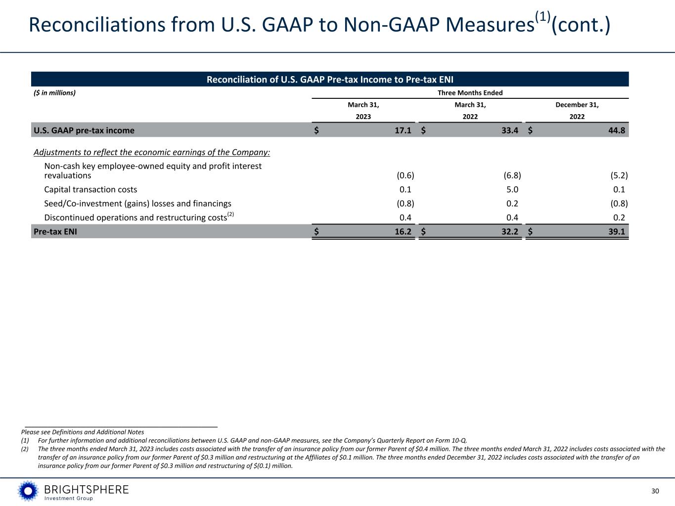 29 Reconciliations from U.S. GAAP to Non-GAAP Measures(1) (cont.) Reconciliation of U.S. GAAP Operating Expense to ENI Operating Expense ($ in millions) Three Months Ended March 31, March 31, December 31, 2023 2022 2022 U.S. GAAP operating expense $ 72.0 $ 69.0 $ 74.8 Less: items excluded from ENI Non-cash key employee-owned equity and profit interest revaluations 0.6 6.8 5.2 Restructuring costs(2) (0.4) (0.4) (0.2) Funds’ operating expense (0.7) — (0.4) Less: items segregated out of U.S. GAAP operating expense Variable compensation(3) (23.2) (27.9) (29.9) Affiliate key employee distributions (1.2) (1.9) (1.6) ENI operating expense $ 47.1 $ 45.6 $ 47.9 ___________________________________________________________ Please see Definitions and Additional Notes (1) For further information and additional reconciliations between U.S. GAAP and non-GAAP measures, see the Company’s Quarterly Report on Form 10-Q. (2) The three months ended March 31, 2023 includes costs associated with the transfer of an insurance policy from our former Parent of $0.4 million. The three months ended March 31, 2022 includes costs associated with the transfer of an insurance policy from our former Parent of $0.3 million and restructuring at the Affiliates of $0.1 million. The three months ended December 31, 2022 includes costs associated with the transfer of an insurance policy from our former Parent of $0.3 million and restructuring of $(0.1) million. (3) Represents ENI variable compensation. For the three months ended March 31, 2023, March 31, 2022, and December 31, 2022, the U.S. GAAP equivalent of variable compensation was $23.2 million, $27.9 million and $29.9 million, respectively.