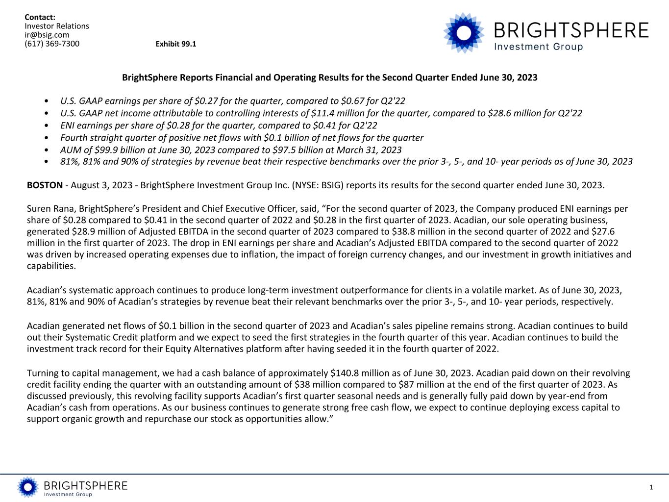 1 Contact: Investor Relations ir@bsig.com (617) 369-7300 Exhibit 99.1 BrightSphere Reports Financial and Operating Results for the Second Quarter Ended June 30, 2023 • U.S. GAAP earnings per share of $0.27 for the quarter, compared to $0.67 for Q2'22 • U.S. GAAP net income attributable to controlling interests of $11.4 million for the quarter, compared to $28.6 million for Q2'22 • ENI earnings per share of $0.28 for the quarter, compared to $0.41 for Q2'22 • Fourth straight quarter of positive net flows with $0.1 billion of net flows for the quarter • AUM of $99.9 billion at June 30, 2023 compared to $97.5 billion at March 31, 2023 • 81%, 81% and 90% of strategies by revenue beat their respective benchmarks over the prior 3-, 5-, and 10- year periods as of June 30, 2023 BOSTON - August 3, 2023 - BrightSphere Investment Group Inc. (NYSE: BSIG) reports its results for the second quarter ended June 30, 2023. Suren Rana, BrightSphere’s President and Chief Executive Officer, said, “For the second quarter of 2023, the Company produced ENI earnings per share of $0.28 compared to $0.41 in the second quarter of 2022 and $0.28 in the first quarter of 2023. Acadian, our sole operating business, generated $28.9 million of Adjusted EBITDA in the second quarter of 2023 compared to $38.8 million in the second quarter of 2022 and $27.6 million in the first quarter of 2023. The drop in ENI earnings per share and Acadian’s Adjusted EBITDA compared to the second quarter of 2022 was driven by increased operating expenses due to inflation, the impact of foreign currency changes, and our investment in growth initiatives and capabilities. Acadian’s systematic approach continues to produce long-term investment outperformance for clients in a volatile market. As of June 30, 2023, 81%, 81% and 90% of Acadian’s strategies by revenue beat their relevant benchmarks over the prior 3-, 5-, and 10- year periods, respectively. Acadian generated net flows of $0.1 billion in the second quarter of 2023 and Acadian’s sales pipeline remains strong. Acadian continues to build out their Systematic Credit platform and we expect to seed the first strategies in the fourth quarter of this year. Acadian continues to build the investment track record for their Equity Alternatives platform after having seeded it in the fourth quarter of 2022. Turning to capital management, we had a cash balance of approximately $140.8 million as of June 30, 2023. Acadian paid down on their revolving credit facility ending the quarter with an outstanding amount of $38 million compared to $87 million at the end of the first quarter of 2023. As discussed previously, this revolving facility supports Acadian’s first quarter seasonal needs and is generally fully paid down by year-end from Acadian’s cash from operations. As our business continues to generate strong free cash flow, we expect to continue deploying excess capital to support organic growth and repurchase our stock as opportunities allow.”