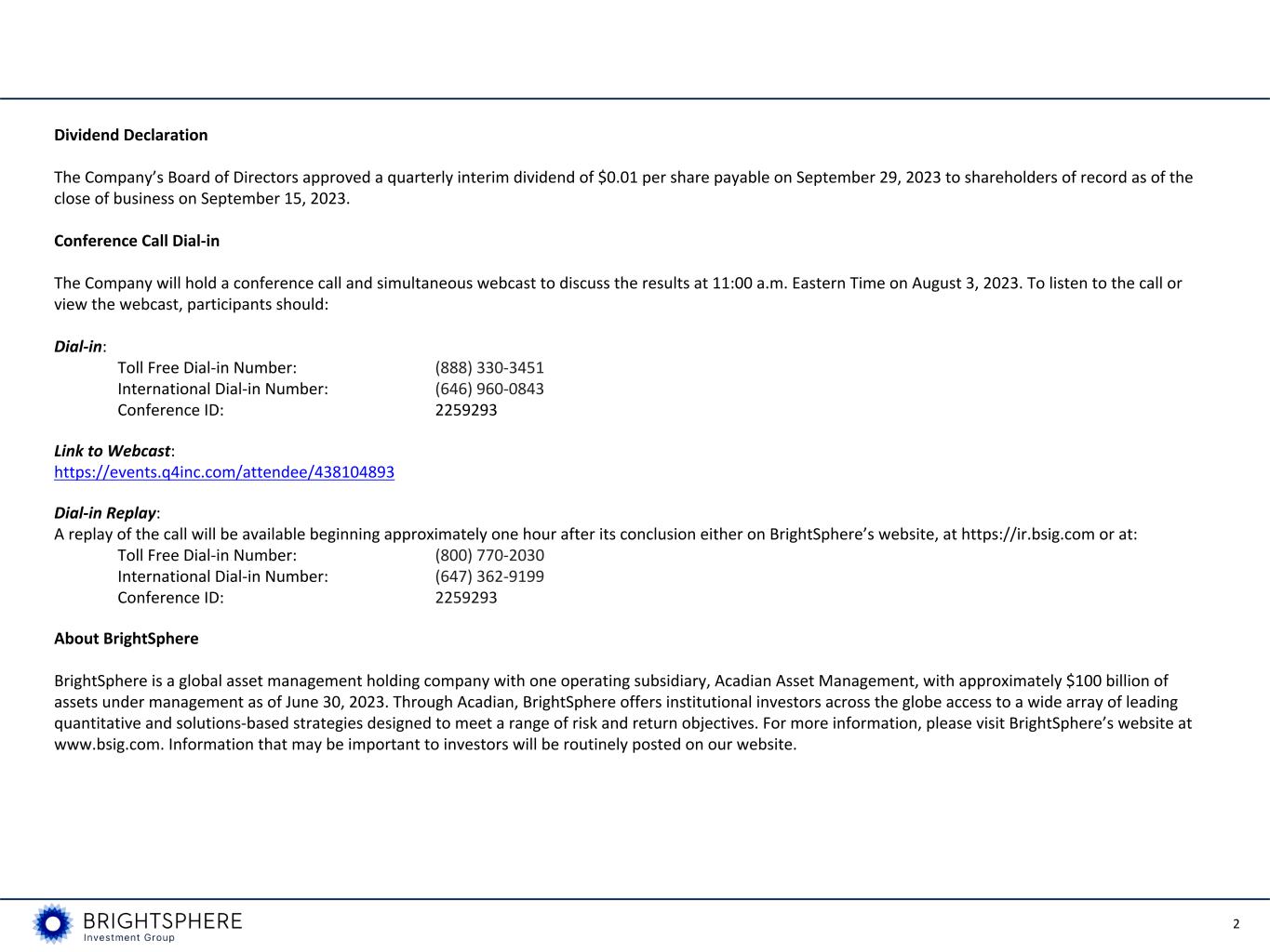 2 Dividend Declaration The Company’s Board of Directors approved a quarterly interim dividend of $0.01 per share payable on September 29, 2023 to shareholders of record as of the close of business on September 15, 2023. Conference Call Dial-in The Company will hold a conference call and simultaneous webcast to discuss the results at 11:00 a.m. Eastern Time on August 3, 2023. To listen to the call or view the webcast, participants should: Dial-in: Toll Free Dial-in Number: (888) 330-3451 International Dial-in Number: (646) 960-0843 Conference ID: 2259293 Link to Webcast: https://events.q4inc.com/attendee/438104893 Dial-in Replay: A replay of the call will be available beginning approximately one hour after its conclusion either on BrightSphere’s website, at https://ir.bsig.com or at: Toll Free Dial-in Number: (800) 770-2030 International Dial-in Number: (647) 362-9199 Conference ID: 2259293 About BrightSphere BrightSphere is a global asset management holding company with one operating subsidiary, Acadian Asset Management, with approximately $100 billion of assets under management as of June 30, 2023. Through Acadian, BrightSphere offers institutional investors across the globe access to a wide array of leading quantitative and solutions-based strategies designed to meet a range of risk and return objectives. For more information, please visit BrightSphere’s website at www.bsig.com. Information that may be important to investors will be routinely posted on our website.