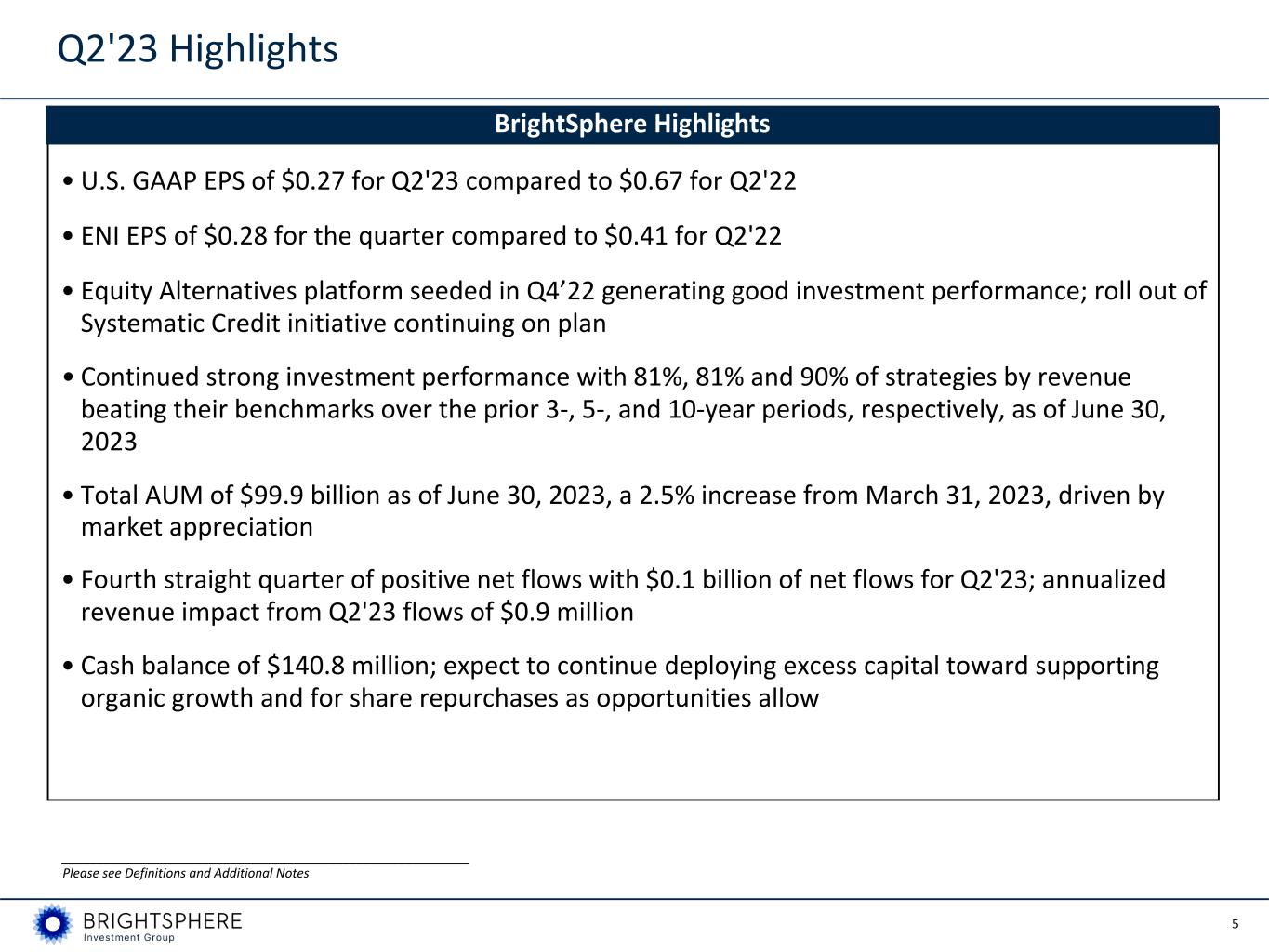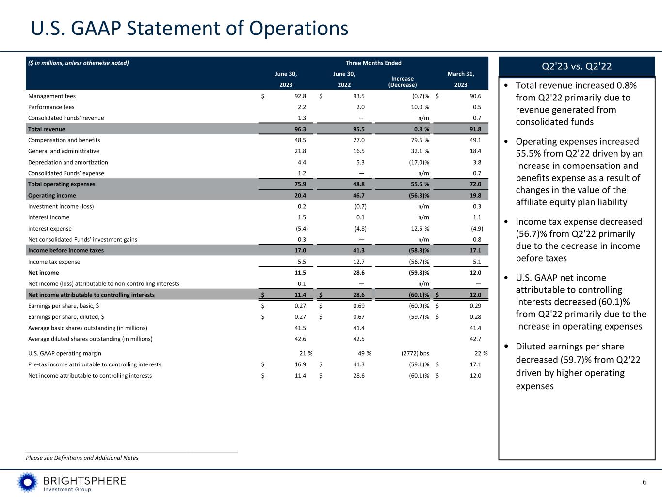 5 • U.S. GAAP EPS of $0.27 for Q2'23 compared to $0.67 for Q2'22 • ENI EPS of $0.28 for the quarter compared to $0.41 for Q2'22 • Equity Alternatives platform seeded in Q4’22 generating good investment performance; roll out of Systematic Credit initiative continuing on plan • Continued strong investment performance with 81%, 81% and 90% of strategies by revenue beating their benchmarks over the prior 3-, 5-, and 10-year periods, respectively, as of June 30, 2023 • Total AUM of $99.9 billion as of June 30, 2023, a 2.5% increase from March 31, 2023, driven by market appreciation • Fourth straight quarter of positive net flows with $0.1 billion of net flows for Q2'23; annualized revenue impact from Q2'23 flows of $0.9 million • Cash balance of $140.8 million; expect to continue deploying excess capital toward supporting organic growth and for share repurchases as opportunities allow BrightSphere Highlights Q2'23 Highlights __________________________________________________________ Please see Definitions and Additional Notes