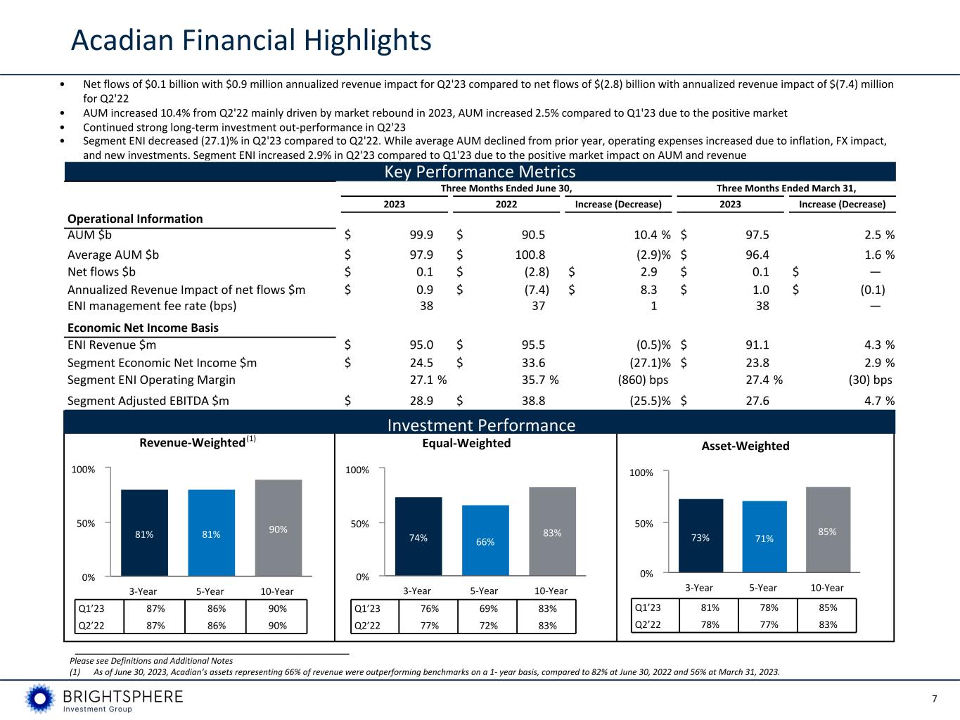 6 U.S. GAAP Statement of Operations ($ in millions, unless otherwise noted) Three Months Ended June 30, June 30, Increase (Decrease) March 31, 2023 2022 2023 Management fees $ 92.8 $ 93.5 (0.7) % $ 90.6 Performance fees 2.2 2.0 10.0 % 0.5 Consolidated Funds’ revenue 1.3 — n/m 0.7 Total revenue 96.3 95.5 0.8 % 91.8 Compensation and benefits 48.5 27.0 79.6 % 49.1 General and administrative 21.8 16.5 32.1 % 18.4 Depreciation and amortization 4.4 5.3 (17.0) % 3.8 Consolidated Funds’ expense 1.2 — n/m 0.7 Total operating expenses 75.9 48.8 55.5 % 72.0 Operating income 20.4 46.7 (56.3) % 19.8 Investment income (loss) 0.2 (0.7) n/m 0.3 Interest income 1.5 0.1 n/m 1.1 Interest expense (5.4) (4.8) 12.5 % (4.9) Net consolidated Funds’ investment gains 0.3 — n/m 0.8 Income before income taxes 17.0 41.3 (58.8) % 17.1 Income tax expense 5.5 12.7 (56.7) % 5.1 Net income 11.5 28.6 (59.8) % 12.0 Net income (loss) attributable to non-controlling interests 0.1 — n/m — Net income attributable to controlling interests $ 11.4 $ 28.6 (60.1) % $ 12.0 Earnings per share, basic, $ $ 0.27 $ 0.69 (60.9) % $ 0.29 Earnings per share, diluted, $ $ 0.27 $ 0.67 (59.7) % $ 0.28 Average basic shares outstanding (in millions) 41.5 41.4 41.4 Average diluted shares outstanding (in millions) 42.6 42.5 42.7 U.S. GAAP operating margin 21 % 49 % (2772) bps 22 % Pre-tax income attributable to controlling interests $ 16.9 $ 41.3 (59.1) % $ 17.1 Net income attributable to controlling interests $ 11.4 $ 28.6 (60.1) % $ 12.0 Q2'23 vs. Q2'22 __________________________________________________________ Please see Definitions and Additional Notes • Total revenue increased 0.8% from Q2'22 primarily due to revenue generated from consolidated funds • Operating expenses increased 55.5% from Q2'22 driven by an increase in compensation and benefits expense as a result of changes in the value of the affiliate equity plan liability • Income tax expense decreased (56.7)% from Q2'22 primarily due to the decrease in income before taxes • U.S. GAAP net income attributable to controlling interests decreased (60.1)% from Q2'22 primarily due to the increase in operating expenses • Diluted earnings per share decreased (59.7)% from Q2'22 driven by higher operating expenses