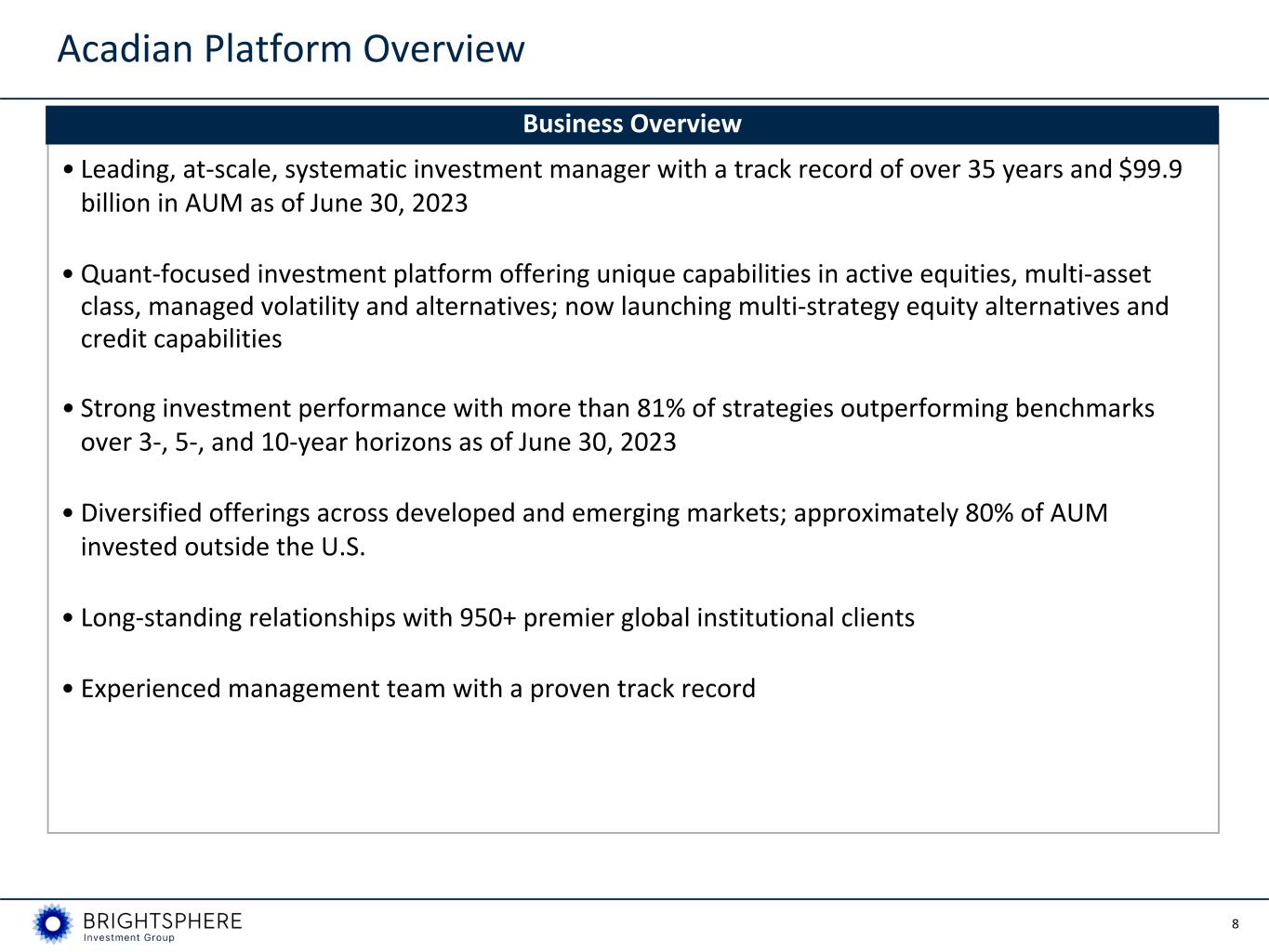 7 Revenue-Weighted 81% 81% 90% 3-Year 5-Year 10-Year 0% 50% 100% Equal-Weighted 74% 66% 83% 3-Year 5-Year 10-Year 0% 50% 100% Acadian Financial Highlights • Net flows of $0.1 billion with $0.9 million annualized revenue impact for Q2'23 compared to net flows of $(2.8) billion with annualized revenue impact of $(7.4) million for Q2'22 • AUM increased 10.4% from Q2'22 mainly driven by market rebound in 2023, AUM increased 2.5% compared to Q1'23 due to the positive market • Continued strong long-term investment out-performance in Q2'23 • Segment ENI decreased (27.1)% in Q2'23 compared to Q2'22. While average AUM declined from prior year, operating expenses increased due to inflation, FX impact, and new investments. Segment ENI increased 2.9% in Q2'23 compared to Q1'23 due to the positive market impact on AUM and revenue Investment Performance Q1’23 87% 86% 90% Q2’22 87% 86% 90% Q1’23 76% 69% 83% Q2’22 77% 72% 83% Asset-Weighted 73% 71% 85% 3-Year 5-Year 10-Year 0% 50% 100% Q1’23 81% 78% 85% Q2’22 78% 77% 83% Key Performance Metrics Three Months Ended June 30, Three Months Ended March 31, 2023 2022 Increase (Decrease) 2023 Increase (Decrease) Operational Information AUM $b $ 99.9 $ 90.5 10.4 % $ 97.5 2.5 % Average AUM $b $ 97.9 $ 100.8 (2.9) % $ 96.4 1.6 % Net flows $b $ 0.1 $ (2.8) $ 2.9 $ 0.1 $ — Annualized Revenue Impact of net flows $m $ 0.9 $ (7.4) $ 8.3 $ 1.0 $ (0.1) ENI management fee rate (bps) 38 37 1 38 — Economic Net Income Basis ENI Revenue $m $ 95.0 $ 95.5 (0.5) % $ 91.1 4.3 % Segment Economic Net Income $m $ 24.5 $ 33.6 (27.1) % $ 23.8 2.9 % Segment ENI Operating Margin 27.1 % 35.7 % (860) bps 27.4 % (30) bps Segment Adjusted EBITDA $m $ 28.9 $ 38.8 (25.5) % $ 27.6 4.7 % ___________________________________________________________ Please see Definitions and Additional Notes (1) As of June 30, 2023, Acadian’s assets representing 66% of revenue were outperforming benchmarks on a 1- year basis, compared to 82% at June 30, 2022 and 56% at March 31, 2023. (1)