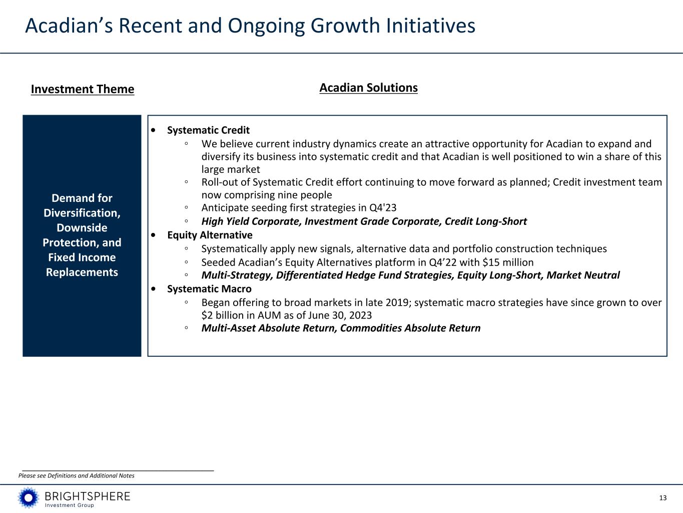 12 Sector Tailwinds Expected to Support Organic Long-term Growth Alpha Secular Trends Anticipated Impact for Acadian Acadian Brand and Barriers to Entry Organic Growth Applying Data and Expertise to New Capabilities Explosive Growth in Alternative Data Continued Development of Advanced Techniques: Machine Learning, AI Scale of Investment in Data, Technology, and Talent Increasingly Important Growing Demand for Uncorrelated Strategies and Customization