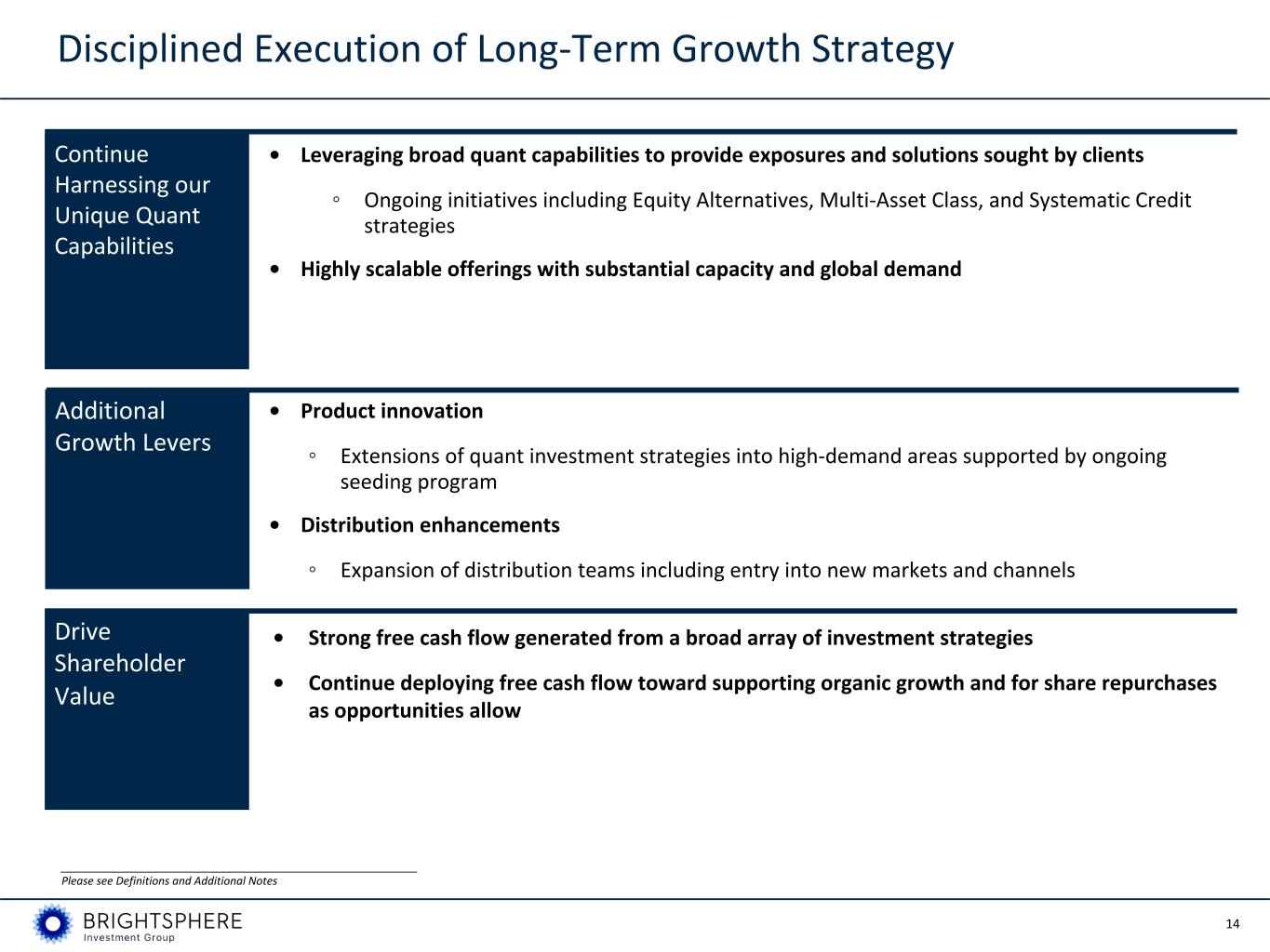 13 • Systematic Credit ◦ We believe current industry dynamics create an attractive opportunity for Acadian to expand and diversify its business into systematic credit and that Acadian is well positioned to win a share of this large market ◦ Roll-out of Systematic Credit effort continuing to move forward as planned; Credit investment team now comprising nine people ◦ Anticipate seeding first strategies in Q4'23 ◦ High Yield Corporate, Investment Grade Corporate, Credit Long-Short • Equity Alternative ◦ Systematically apply new signals, alternative data and portfolio construction techniques ◦ Seeded Acadian’s Equity Alternatives platform in Q4’22 with $15 million ◦ Multi-Strategy, Differentiated Hedge Fund Strategies, Equity Long-Short, Market Neutral • Systematic Macro ◦ Began offering to broad markets in late 2019; systematic macro strategies have since grown to over $2 billion in AUM as of June 30, 2023 ◦ Multi-Asset Absolute Return, Commodities Absolute Return Demand for Diversification, Downside Protection, and Fixed Income Replacements Acadian’s Recent and Ongoing Growth Initiatives Investment Theme Acadian Solutions __________________________________________________________ Please see Definitions and Additional Notes