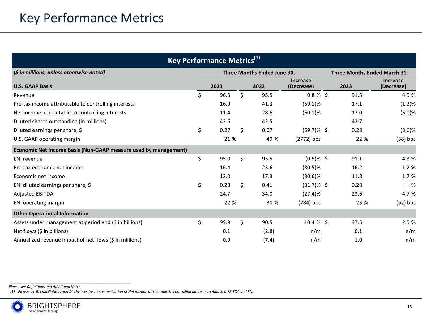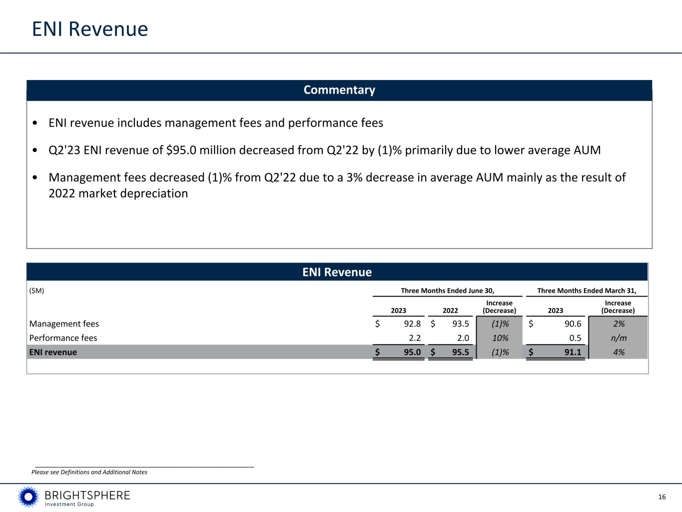 15 Key Performance Metrics Key Performance Metrics(1) ($ in millions, unless otherwise noted) Three Months Ended June 30, Three Months Ended March 31, U.S. GAAP Basis 2023 2022 Increase (Decrease) 2023 Increase (Decrease) Revenue $ 96.3 $ 95.5 0.8 % $ 91.8 4.9 % Pre-tax income attributable to controlling interests 16.9 41.3 (59.1) % 17.1 (1.2) % Net income attributable to controlling interests 11.4 28.6 (60.1) % 12.0 (5.0) % Diluted shares outstanding (in millions) 42.6 42.5 42.7 Diluted earnings per share, $ $ 0.27 $ 0.67 (59.7) % $ 0.28 (3.6) % U.S. GAAP operating margin 21 % 49 % (2772) bps 22 % (38) bps Economic Net Income Basis (Non-GAAP measure used by management) ENI revenue $ 95.0 $ 95.5 (0.5) % $ 91.1 4.3 % Pre-tax economic net income 16.4 23.6 (30.5) % 16.2 1.2 % Economic net income 12.0 17.3 (30.6) % 11.8 1.7 % ENI diluted earnings per share, $ $ 0.28 $ 0.41 (31.7) % $ 0.28 — % Adjusted EBITDA 24.7 34.0 (27.4) % 23.6 4.7 % ENI operating margin 22 % 30 % (784) bps 23 % (62) bps Other Operational Information Assets under management at period end ($ in billions) $ 99.9 $ 90.5 10.4 % $ 97.5 2.5 % Net flows ($ in billions) 0.1 (2.8) n/m 0.1 n/m Annualized revenue impact of net flows ($ in millions) 0.9 (7.4) n/m 1.0 n/m __________________________________________________________ Please see Definitions and Additional Notes (1) Please see Reconciliations and Disclosures for the reconciliation of Net income attributable to controlling interests to Adjusted EBITDA and ENI.
