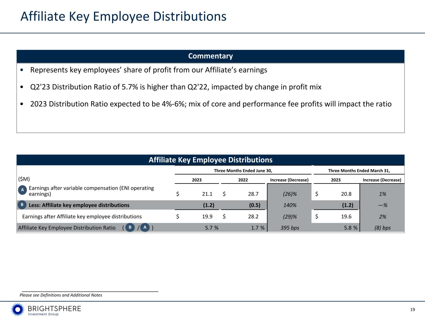 18 ENI Variable Compensation ($M) Three Months Ended June 30, Three Months Ended March 31, 2023 2022 Increase (Decrease) 2023 Increase (Decrease) Cash variable compensation $ 21.4 $ 20.3 5% $ 21.6 (1)% Add: Non-cash equity-based award amortization 1.3 2.4 (46)% 1.6 (19)% Variable compensation 22.7 22.7 —% 23.2 (2)% Earnings before variable compensation $ 43.8 $ 51.4 (15)% $ 44.0 —% Variable Compensation Ratio (VC as % of earnings before variable comp.) 51.8 % 44.2 % 766 bps 52.7 % (90) bps • Variable compensation is typically awarded based on contractual percentage of our Affiliate’s ENI earnings before variable compensation plus Center bonuses and also includes a contractual split of certain performance fees which is recognized over the contractual vesting period ◦ Affiliate variable compensation includes cash and equity provided through recycling ◦ Center variable compensation includes cash and BSIG equity • Q2'23 Variable Compensation Ratio increased to 51.8% from 44.2% in Q2'22 due to lower earnings before variable compensation • 2023 full year Variable Compensation Ratio expected to be 46%-52% ___________________________________________________________ Please see Definitions and Additional Notes ENI Variable Compensation Commentary