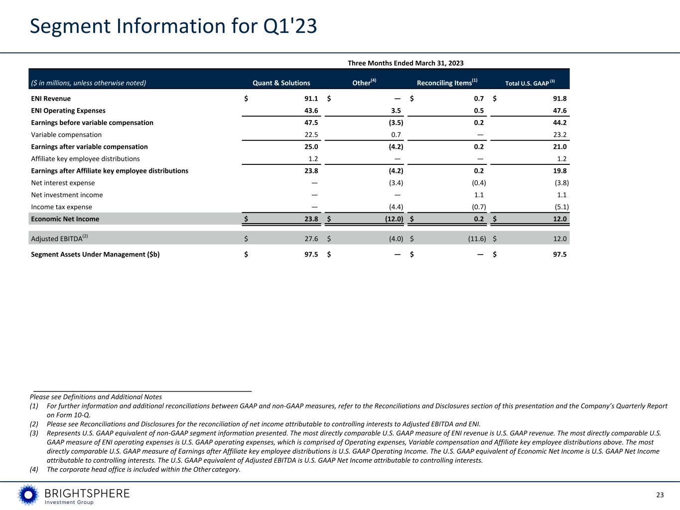 22 Segment Information for Q2'23 and Q2'22 Three Months Ended June 30, 2023 Three Months Ended June 30, 2022 ($ in millions, unless otherwise noted) Quant & Solutions Other(4) Reconciling Items(1) Total U.S. GAAP (3) Quant & Solutions Other(4) Reconciling Items(1) Total U.S. GAAP (3) ENI Revenue $ 95.0 $ — $ 1.3 $ 96.3 $ 95.5 $ — $ — $ 95.5 ENI Operating Expenses 47.3 3.9 0.8 52.0 39.7 4.4 (18.5) 25.6 Earnings before variable compensation 47.7 (3.9) 0.5 44.3 55.8 (4.4) 18.5 69.9 Variable compensation 22.0 0.7 — 22.7 21.7 1.0 — 22.7 Earnings after variable compensation 25.7 (4.6) 0.5 21.6 34.1 (5.4) 18.5 47.2 Affiliate key employee distributions 1.2 — — 1.2 0.5 — — 0.5 Earnings after Affiliate key employee distributions 24.5 (4.6) 0.5 20.4 33.6 (5.4) 18.5 46.7 Net interest expense — (3.5) (0.4) (3.9) — (4.6) (0.1) (4.7) Net investment income (loss) — — 0.5 0.5 — — (0.7) (0.7) Net (income) loss attributable to non-controlling interests — — (0.1) (0.1) — — — — Income tax expense — (4.4) (1.1) (5.5) — (6.3) (6.4) (12.7) Economic Net Income $ 24.5 $ (12.5) $ (0.6) $ 11.4 $ 33.6 $ (16.3) $ 11.3 $ 28.6 Adjusted EBITDA(2) $ 28.9 $ (4.2) $ (13.3) $ 11.4 $ 38.8 $ (4.8) $ (5.4) $ 28.6 Segment Assets Under Management ($b) $ 99.9 $ — $ — $ 99.9 $ 90.5 $ — $ — $ 90.5 __________________________________________________________ Please see Definitions and Additional Notes (1) For further information and additional reconciliations between GAAP and non-GAAP measures, refer to the Reconciliations and Disclosures section of this presentation and the Company’s Quarterly Report on Form 10-Q. (2) Please see Reconciliations and Disclosures for the reconciliation of net income attributable to controlling interests to Adjusted EBITDA and ENI. (3) Represents U.S. GAAP equivalent of non-GAAP segment information presented. The most directly comparable U.S. GAAP measure of ENI revenue is U.S. GAAP revenue. The most directly comparable U.S. GAAP measure of ENI operating expenses is U.S. GAAP operating expenses, which is comprised of Operating expenses, Variable compensation and Affiliate key employee distributions above. The most directly comparable U.S. GAAP measure of Earnings after Affiliate key employee distributions is U.S. GAAP Operating Income. The U.S. GAAP equivalent of Economic Net Income is U.S. GAAP Net Income attributable to controlling interests. The U.S. GAAP equivalent of Adjusted EBITDA is U.S. GAAP Net Income attributable to controlling interests. (4) The corporate head office is included within the Other category.