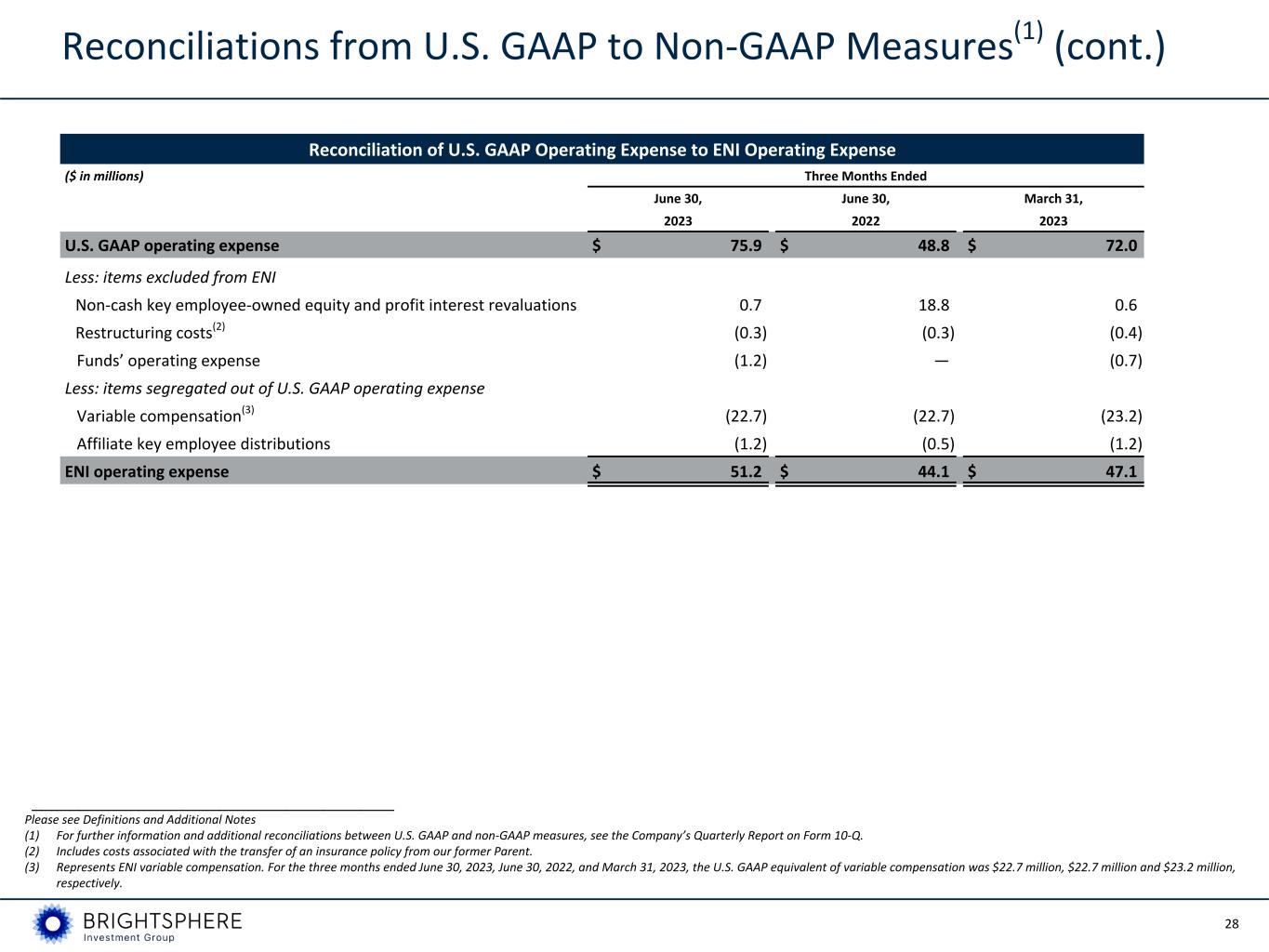 27 Reconciliations from U.S. GAAP to Non-GAAP Measures(1) (cont.) Reconciliation of per-share U.S. GAAP Net Income to Economic Net Income per share ($) Three Months Ended June 30, June 30, March 31, 2023 2022 2023 U.S. GAAP net income per share $ 0.27 $ 0.67 $ 0.28 Adjustments to reflect the economic earnings of the Company: i. Non-cash key employee-owned equity and profit interest revaluations (0.02) (0.44) (0.01) ii. Capital transaction costs — — — iii. Seed/Co-investment (gains) losses and financing — 0.02 (0.02) iv. Tax benefit of goodwill and acquired intangibles deductions 0.01 0.01 0.01 v. Discontinued operations and restructuring — 0.01 0.01 vi. ENI tax normalization 0.02 0.03 — Tax effect of above adjustments, as applicable — 0.11 0.01 Economic net income per share $ 0.28 $ 0.41 $ 0.28 Reconciliation of U.S. GAAP Revenue to ENI Revenue ($ in millions) Three Months Ended June 30, June 30, March 31, 2023 2022 2023 U.S. GAAP revenue $ 96.3 $ 95.5 $ 91.8 Exclude revenue from consolidated Funds (1.3) — (0.7) ENI revenue $ 95.0 $ 95.5 $ 91.1 ___________________________________________________________ Please see Definitions and Additional Notes (1) For further information and additional reconciliations between U.S. GAAP and non-GAAP measures, see the Company’s Quarterly Report on Form 10-Q.