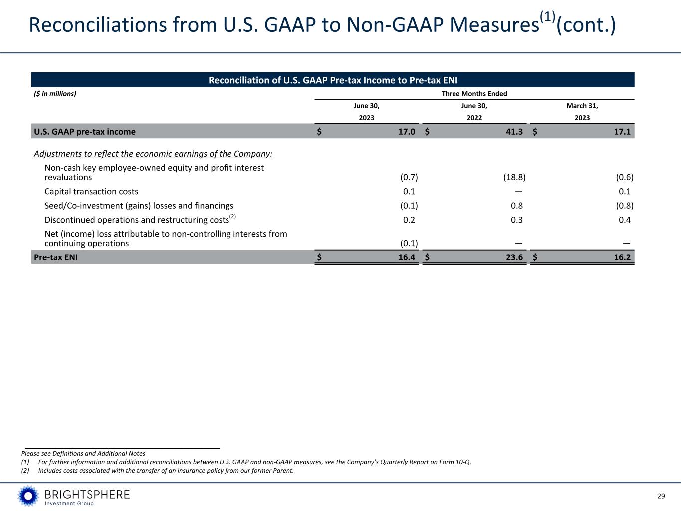 28 Reconciliations from U.S. GAAP to Non-GAAP Measures(1) (cont.) Reconciliation of U.S. GAAP Operating Expense to ENI Operating Expense ($ in millions) Three Months Ended June 30, June 30, March 31, 2023 2022 2023 U.S. GAAP operating expense $ 75.9 $ 48.8 $ 72.0 Less: items excluded from ENI Non-cash key employee-owned equity and profit interest revaluations 0.7 18.8 0.6 Restructuring costs(2) (0.3) (0.3) (0.4) Funds’ operating expense (1.2) — (0.7) Less: items segregated out of U.S. GAAP operating expense Variable compensation(3) (22.7) (22.7) (23.2) Affiliate key employee distributions (1.2) (0.5) (1.2) ENI operating expense $ 51.2 $ 44.1 $ 47.1 ___________________________________________________________ Please see Definitions and Additional Notes (1) For further information and additional reconciliations between U.S. GAAP and non-GAAP measures, see the Company’s Quarterly Report on Form 10-Q. (2) Includes costs associated with the transfer of an insurance policy from our former Parent. (3) Represents ENI variable compensation. For the three months ended June 30, 2023, June 30, 2022, and March 31, 2023, the U.S. GAAP equivalent of variable compensation was $22.7 million, $22.7 million and $23.2 million, respectively.