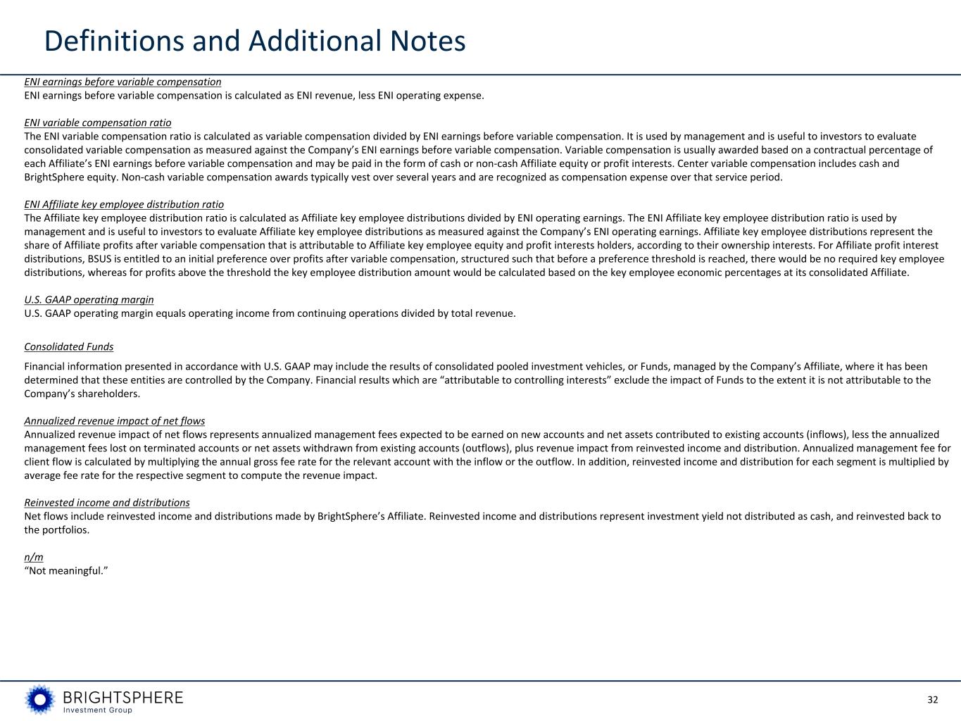 32 Definitions and Additional Notes ENI earnings before variable compensation ENI earnings before variable compensation is calculated as ENI revenue, less ENI operating expense. ENI variable compensation ratio The ENI variable compensation ratio is calculated as variable compensation divided by ENI earnings before variable compensation. It is used by management and is useful to investors to evaluate consolidated variable compensation as measured against the Company’s ENI earnings before variable compensation. Variable compensation is usually awarded based on a contractual percentage of each Affiliate’s ENI earnings before variable compensation and may be paid in the form of cash or non-cash Affiliate equity or profit interests. Center variable compensation includes cash and BrightSphere equity. Non-cash variable compensation awards typically vest over several years and are recognized as compensation expense over that service period. ENI Affiliate key employee distribution ratio The Affiliate key employee distribution ratio is calculated as Affiliate key employee distributions divided by ENI operating earnings. The ENI Affiliate key employee distribution ratio is used by management and is useful to investors to evaluate Affiliate key employee distributions as measured against the Company’s ENI operating earnings. Affiliate key employee distributions represent the share of Affiliate profits after variable compensation that is attributable to Affiliate key employee equity and profit interests holders, according to their ownership interests. For Affiliate profit interest distributions, BSUS is entitled to an initial preference over profits after variable compensation, structured such that before a preference threshold is reached, there would be no required key employee distributions, whereas for profits above the threshold the key employee distribution amount would be calculated based on the key employee economic percentages at its consolidated Affiliate. U.S. GAAP operating margin U.S. GAAP operating margin equals operating income from continuing operations divided by total revenue. Consolidated Funds Financial information presented in accordance with U.S. GAAP may include the results of consolidated pooled investment vehicles, or Funds, managed by the Company’s Affiliate, where it has been determined that these entities are controlled by the Company. Financial results which are “attributable to controlling interests” exclude the impact of Funds to the extent it is not attributable to the Company’s shareholders. Annualized revenue impact of net flows Annualized revenue impact of net flows represents annualized management fees expected to be earned on new accounts and net assets contributed to existing accounts (inflows), less the annualized management fees lost on terminated accounts or net assets withdrawn from existing accounts (outflows), plus revenue impact from reinvested income and distribution. Annualized management fee for client flow is calculated by multiplying the annual gross fee rate for the relevant account with the inflow or the outflow. In addition, reinvested income and distribution for each segment is multiplied by average fee rate for the respective segment to compute the revenue impact. Reinvested income and distributions Net flows include reinvested income and distributions made by BrightSphere’s Affiliate. Reinvested income and distributions represent investment yield not distributed as cash, and reinvested back to the portfolios. n/m “Not meaningful.”