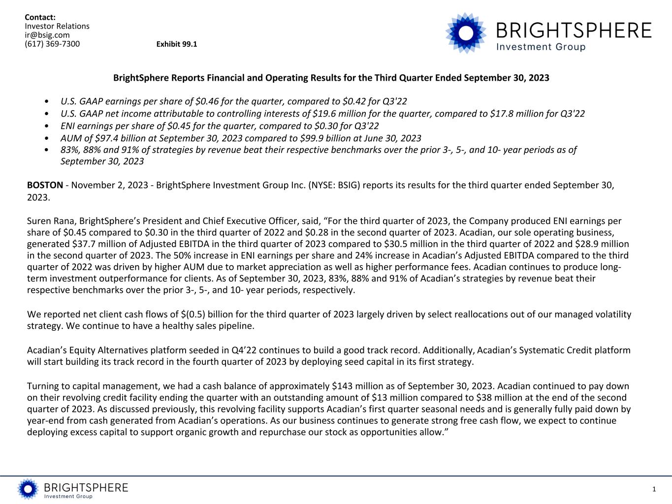 1 Contact: Investor Relations ir@bsig.com (617) 369-7300 Exhibit 99.1 BrightSphere Reports Financial and Operating Results for the Third Quarter Ended September 30, 2023 • U.S. GAAP earnings per share of $0.46 for the quarter, compared to $0.42 for Q3'22 • U.S. GAAP net income attributable to controlling interests of $19.6 million for the quarter, compared to $17.8 million for Q3'22 • ENI earnings per share of $0.45 for the quarter, compared to $0.30 for Q3'22 • AUM of $97.4 billion at September 30, 2023 compared to $99.9 billion at June 30, 2023 • 83%, 88% and 91% of strategies by revenue beat their respective benchmarks over the prior 3-, 5-, and 10- year periods as of September 30, 2023 BOSTON - November 2, 2023 - BrightSphere Investment Group Inc. (NYSE: BSIG) reports its results for the third quarter ended September 30, 2023. Suren Rana, BrightSphere’s President and Chief Executive Officer, said, “For the third quarter of 2023, the Company produced ENI earnings per share of $0.45 compared to $0.30 in the third quarter of 2022 and $0.28 in the second quarter of 2023. Acadian, our sole operating business, generated $37.7 million of Adjusted EBITDA in the third quarter of 2023 compared to $30.5 million in the third quarter of 2022 and $28.9 million in the second quarter of 2023. The 50% increase in ENI earnings per share and 24% increase in Acadian’s Adjusted EBITDA compared to the third quarter of 2022 was driven by higher AUM due to market appreciation as well as higher performance fees. Acadian continues to produce long- term investment outperformance for clients. As of September 30, 2023, 83%, 88% and 91% of Acadian’s strategies by revenue beat their respective benchmarks over the prior 3-, 5-, and 10- year periods, respectively. We reported net client cash flows of $(0.5) billion for the third quarter of 2023 largely driven by select reallocations out of our managed volatility strategy. We continue to have a healthy sales pipeline. Acadian’s Equity Alternatives platform seeded in Q4’22 continues to build a good track record. Additionally, Acadian’s Systematic Credit platform will start building its track record in the fourth quarter of 2023 by deploying seed capital in its first strategy. Turning to capital management, we had a cash balance of approximately $143 million as of September 30, 2023. Acadian continued to pay down on their revolving credit facility ending the quarter with an outstanding amount of $13 million compared to $38 million at the end of the second quarter of 2023. As discussed previously, this revolving facility supports Acadian’s first quarter seasonal needs and is generally fully paid down by year-end from cash generated from Acadian’s operations. As our business continues to generate strong free cash flow, we expect to continue deploying excess capital to support organic growth and repurchase our stock as opportunities allow.”