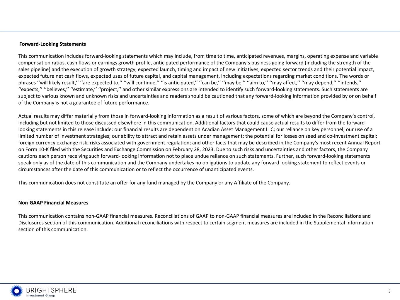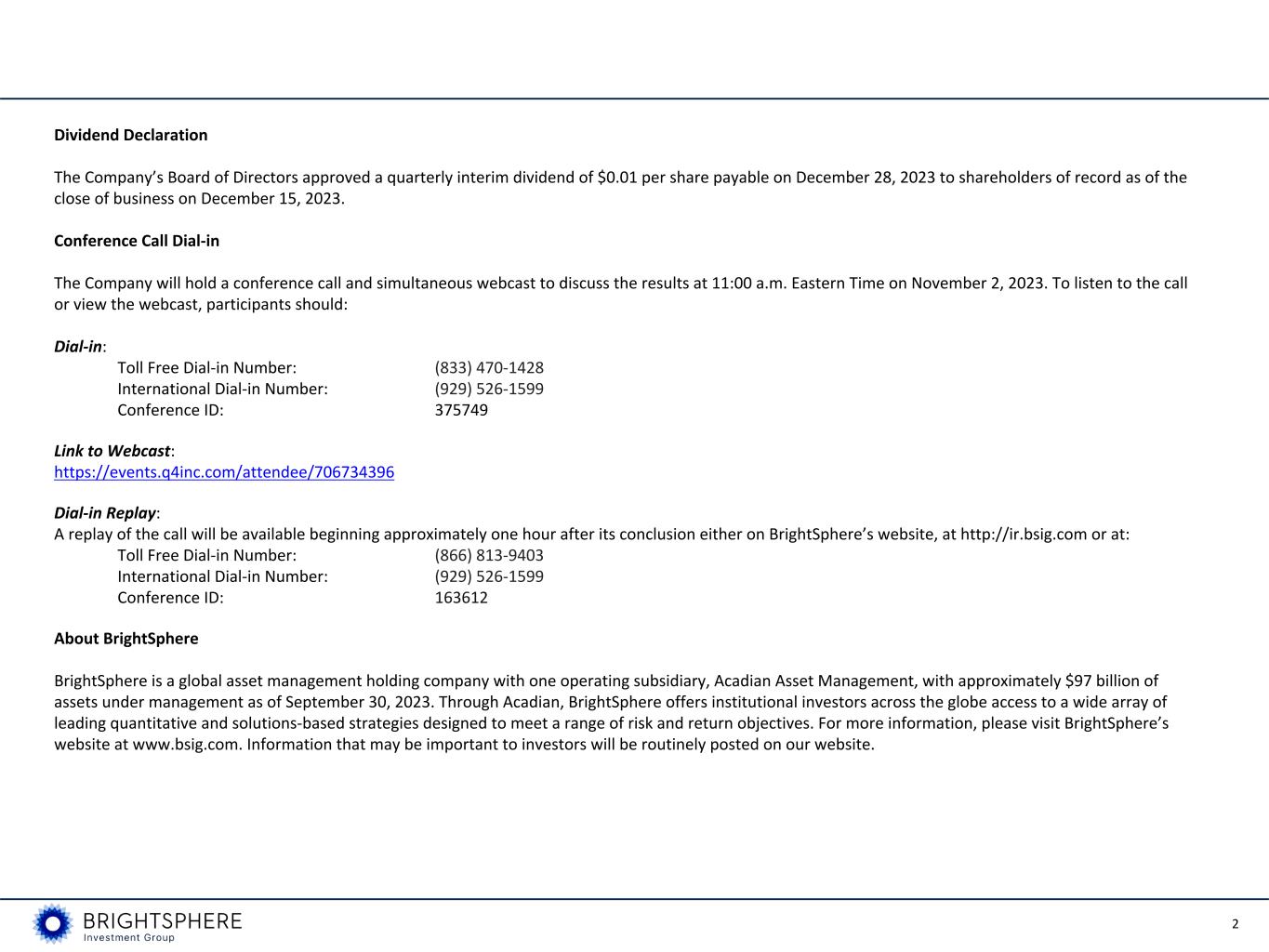 2 Dividend Declaration The Company’s Board of Directors approved a quarterly interim dividend of $0.01 per share payable on December 28, 2023 to shareholders of record as of the close of business on December 15, 2023. Conference Call Dial-in The Company will hold a conference call and simultaneous webcast to discuss the results at 11:00 a.m. Eastern Time on November 2, 2023. To listen to the call or view the webcast, participants should: Dial-in: Toll Free Dial-in Number: (833) 470-1428 International Dial-in Number: (929) 526-1599 Conference ID: 375749 Link to Webcast: https://events.q4inc.com/attendee/706734396 Dial-in Replay: A replay of the call will be available beginning approximately one hour after its conclusion either on BrightSphere’s website, at http://ir.bsig.com or at: Toll Free Dial-in Number: (866) 813-9403 International Dial-in Number: (929) 526-1599 Conference ID: 163612 About BrightSphere BrightSphere is a global asset management holding company with one operating subsidiary, Acadian Asset Management, with approximately $97 billion of assets under management as of September 30, 2023. Through Acadian, BrightSphere offers institutional investors across the globe access to a wide array of leading quantitative and solutions-based strategies designed to meet a range of risk and return objectives. For more information, please visit BrightSphere’s website at www.bsig.com. Information that may be important to investors will be routinely posted on our website.