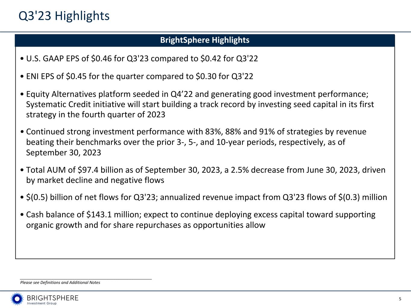 32 Definitions and Additional Notes ENI earnings before variable compensation ENI earnings before variable compensation is calculated as ENI revenue, less ENI operating expense. ENI variable compensation ratio The ENI variable compensation ratio is calculated as variable compensation divided by ENI earnings before variable compensation. It is used by management and is useful to investors to evaluate consolidated variable compensation as measured against the Company’s ENI earnings before variable compensation. Variable compensation is usually awarded based on a contractual percentage of each Affiliate’s ENI earnings before variable compensation and may be paid in the form of cash or non-cash Affiliate equity or profit interests. Center variable compensation includes cash and BrightSphere equity. Non-cash variable compensation awards typically vest over several years and are recognized as compensation expense over that service period. ENI Affiliate key employee distribution ratio The Affiliate key employee distribution ratio is calculated as Affiliate key employee distributions divided by ENI operating earnings. The ENI Affiliate key employee distribution ratio is used by management and is useful to investors to evaluate Affiliate key employee distributions as measured against the Company’s ENI operating earnings. Affiliate key employee distributions represent the share of Affiliate profits after variable compensation that is attributable to Affiliate key employee equity and profit interests holders, according to their ownership interests. For Affiliate profit interest distributions, BSUS is entitled to an initial preference over profits after variable compensation, structured such that before a preference threshold is reached, there would be no required key employee distributions, whereas for profits above the threshold the key employee distribution amount would be calculated based on the key employee economic percentages at its consolidated Affiliate. U.S. GAAP operating margin U.S. GAAP operating margin equals operating income from continuing operations divided by total revenue. Consolidated Funds Financial information presented in accordance with U.S. GAAP may include the results of consolidated pooled investment vehicles, or Funds, managed by the Company’s Affiliate, where it has been determined that these entities are controlled by the Company. Financial results which are “attributable to controlling interests” exclude the impact of Funds to the extent it is not attributable to the Company’s shareholders. Annualized revenue impact of net flows Annualized revenue impact of net flows represents annualized management fees expected to be earned on new accounts and net assets contributed to existing accounts (inflows), less the annualized management fees lost on terminated accounts or net assets withdrawn from existing accounts (outflows), plus revenue impact from reinvested income and distribution. Annualized management fee for client flow is calculated by multiplying the annual gross fee rate for the relevant account with the inflow or the outflow. In addition, reinvested income and distribution for each segment is multiplied by average fee rate for the respective segment to compute the revenue impact. Reinvested income and distributions Net flows include reinvested income and distributions made by BrightSphere’s Affiliate. Reinvested income and distributions represent investment yield not distributed as cash, and reinvested back to the portfolios. n/m “Not meaningful.”