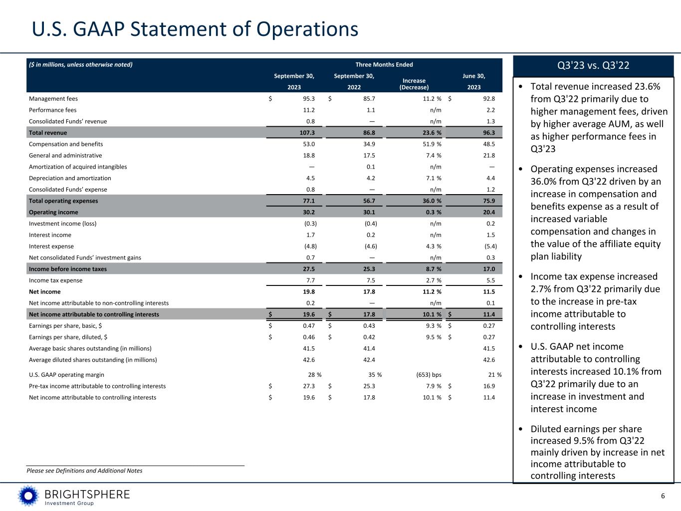 5 • U.S. GAAP EPS of $0.46 for Q3'23 compared to $0.42 for Q3'22 • ENI EPS of $0.45 for the quarter compared to $0.30 for Q3'22 • Equity Alternatives platform seeded in Q4’22 and generating good investment performance; Systematic Credit initiative will start building a track record by investing seed capital in its first strategy in the fourth quarter of 2023 • Continued strong investment performance with 83%, 88% and 91% of strategies by revenue beating their benchmarks over the prior 3-, 5-, and 10-year periods, respectively, as of September 30, 2023 • Total AUM of $97.4 billion as of September 30, 2023, a 2.5% decrease from June 30, 2023, driven by market decline and negative flows • $(0.5) billion of net flows for Q3'23; annualized revenue impact from Q3'23 flows of $(0.3) million • Cash balance of $143.1 million; expect to continue deploying excess capital toward supporting organic growth and for share repurchases as opportunities allow BrightSphere Highlights Q3'23 Highlights __________________________________________________________ Please see Definitions and Additional Notes