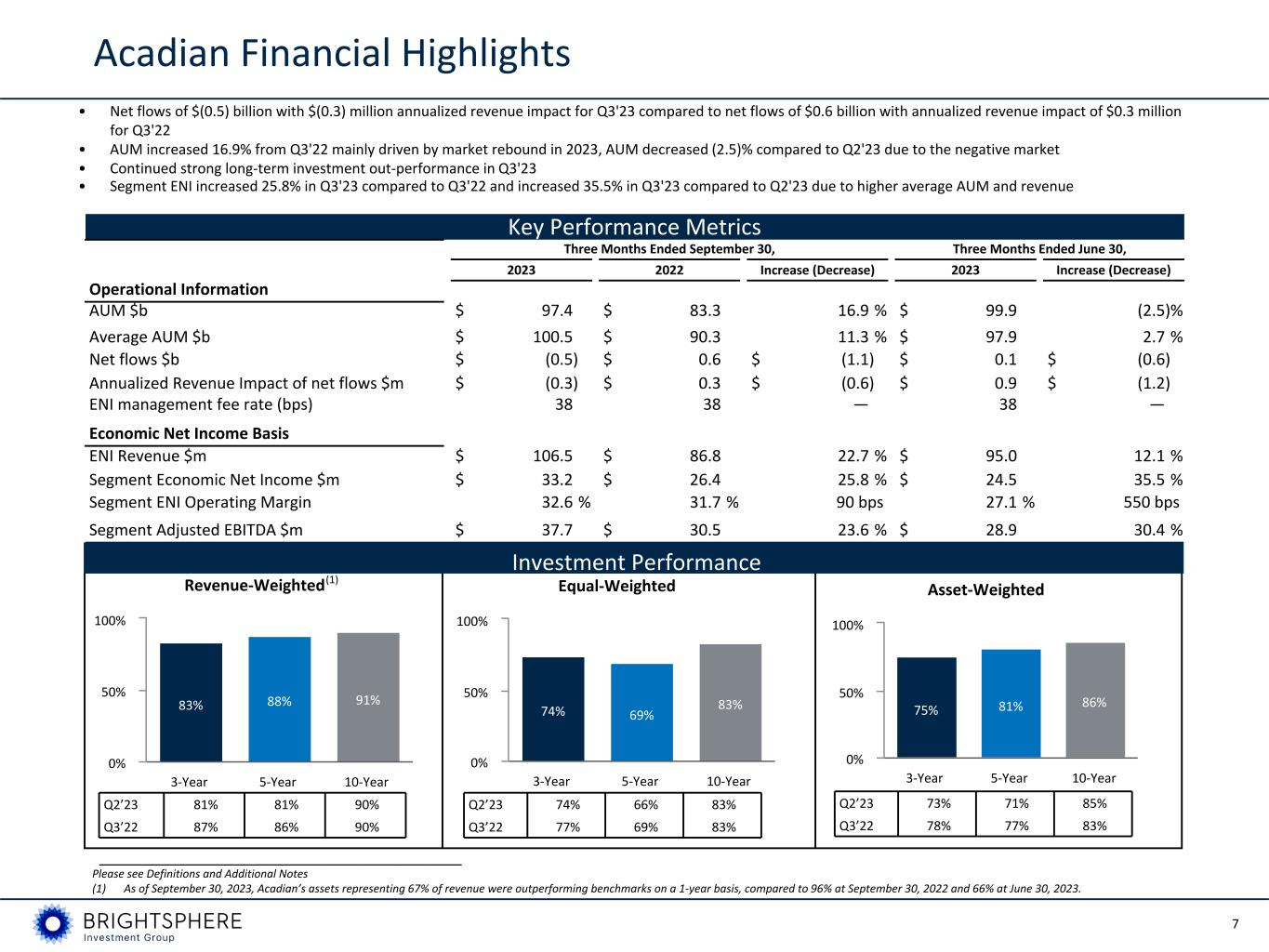 6 U.S. GAAP Statement of Operations ($ in millions, unless otherwise noted) Three Months Ended September 30, September 30, Increase (Decrease) June 30, 2023 2022 2023 Management fees $ 95.3 $ 85.7 11.2 % $ 92.8 Performance fees 11.2 1.1 n/m 2.2 Consolidated Funds’ revenue 0.8 — n/m 1.3 Total revenue 107.3 86.8 23.6 % 96.3 Compensation and benefits 53.0 34.9 51.9 % 48.5 General and administrative 18.8 17.5 7.4 % 21.8 Amortization of acquired intangibles — 0.1 n/m — Depreciation and amortization 4.5 4.2 7.1 % 4.4 Consolidated Funds’ expense 0.8 — n/m 1.2 Total operating expenses 77.1 56.7 36.0 % 75.9 Operating income 30.2 30.1 0.3 % 20.4 Investment income (loss) (0.3) (0.4) n/m 0.2 Interest income 1.7 0.2 n/m 1.5 Interest expense (4.8) (4.6) 4.3 % (5.4) Net consolidated Funds’ investment gains 0.7 — n/m 0.3 Income before income taxes 27.5 25.3 8.7 % 17.0 Income tax expense 7.7 7.5 2.7 % 5.5 Net income 19.8 17.8 11.2 % 11.5 Net income attributable to non-controlling interests 0.2 — n/m 0.1 Net income attributable to controlling interests $ 19.6 $ 17.8 10.1 % $ 11.4 Earnings per share, basic, $ $ 0.47 $ 0.43 9.3 % $ 0.27 Earnings per share, diluted, $ $ 0.46 $ 0.42 9.5 % $ 0.27 Average basic shares outstanding (in millions) 41.5 41.4 41.5 Average diluted shares outstanding (in millions) 42.6 42.4 42.6 U.S. GAAP operating margin 28 % 35 % (653) bps 21 % Pre-tax income attributable to controlling interests $ 27.3 $ 25.3 7.9 % $ 16.9 Net income attributable to controlling interests $ 19.6 $ 17.8 10.1 % $ 11.4 Q3'23 vs. Q3'22 __________________________________________________________ Please see Definitions and Additional Notes • Total revenue increased 23.6% from Q3'22 primarily due to higher management fees, driven by higher average AUM, as well as higher performance fees in Q3'23 • Operating expenses increased 36.0% from Q3'22 driven by an increase in compensation and benefits expense as a result of increased variable compensation and changes in the value of the affiliate equity plan liability • Income tax expense increased 2.7% from Q3'22 primarily due to the increase in pre-tax income attributable to controlling interests • U.S. GAAP net income attributable to controlling interests increased 10.1% from Q3'22 primarily due to an increase in investment and interest income • Diluted earnings per share increased 9.5% from Q3'22 mainly driven by increase in net income attributable to controlling interests