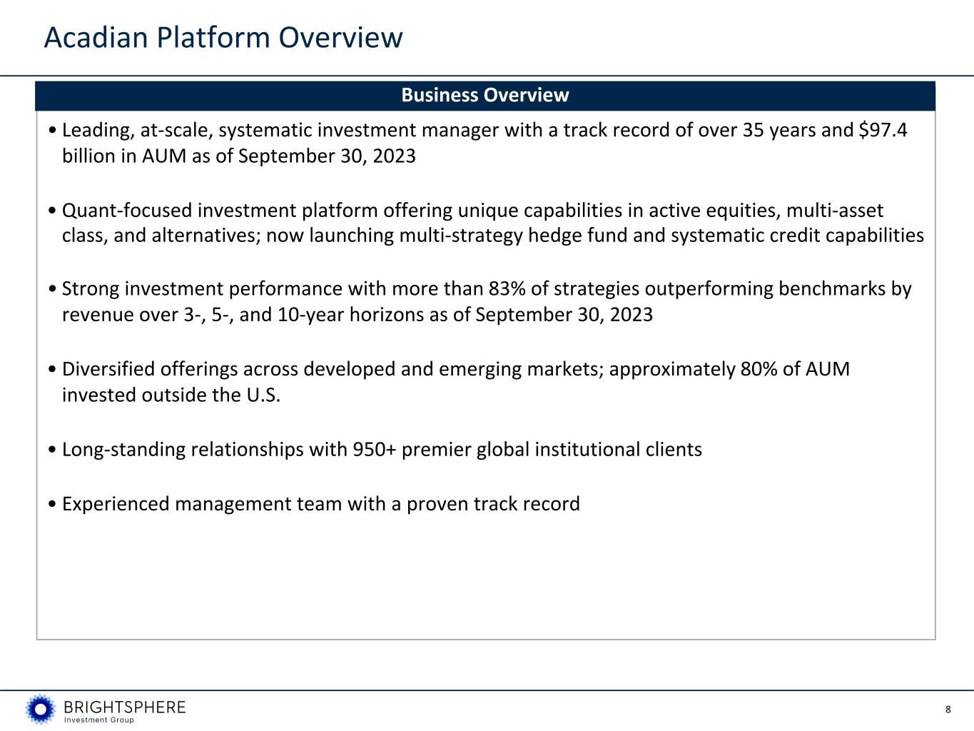 7 Revenue-Weighted 83% 88% 91% 3-Year 5-Year 10-Year 0% 50% 100% Equal-Weighted 74% 69% 83% 3-Year 5-Year 10-Year 0% 50% 100% Acadian Financial Highlights • Net flows of $(0.5) billion with $(0.3) million annualized revenue impact for Q3'23 compared to net flows of $0.6 billion with annualized revenue impact of $0.3 million for Q3'22 • AUM increased 16.9% from Q3'22 mainly driven by market rebound in 2023, AUM decreased (2.5)% compared to Q2'23 due to the negative market • Continued strong long-term investment out-performance in Q3'23 • Segment ENI increased 25.8% in Q3'23 compared to Q3'22 and increased 35.5% in Q3'23 compared to Q2'23 due to higher average AUM and revenue Investment Performance Q2’23 81% 81% 90% Q3’22 87% 86% 90% Q2’23 74% 66% 83% Q3’22 77% 69% 83% Asset-Weighted 75% 81% 86% 3-Year 5-Year 10-Year 0% 50% 100% Q2’23 73% 71% 85% Q3’22 78% 77% 83% Key Performance Metrics Three Months Ended September 30, Three Months Ended June 30, 2023 2022 Increase (Decrease) 2023 Increase (Decrease) Operational Information AUM $b $ 97.4 $ 83.3 16.9 % $ 99.9 (2.5) % Average AUM $b $ 100.5 $ 90.3 11.3 % $ 97.9 2.7 % Net flows $b $ (0.5) $ 0.6 $ (1.1) $ 0.1 $ (0.6) Annualized Revenue Impact of net flows $m $ (0.3) $ 0.3 $ (0.6) $ 0.9 $ (1.2) ENI management fee rate (bps) 38 38 — 38 — Economic Net Income Basis ENI Revenue $m $ 106.5 $ 86.8 22.7 % $ 95.0 12.1 % Segment Economic Net Income $m $ 33.2 $ 26.4 25.8 % $ 24.5 35.5 % Segment ENI Operating Margin 32.6 % 31.7 % 90 bps 27.1 % 550 bps Segment Adjusted EBITDA $m $ 37.7 $ 30.5 23.6 % $ 28.9 30.4 % ___________________________________________________________ Please see Definitions and Additional Notes (1) As of September 30, 2023, Acadian’s assets representing 67% of revenue were outperforming benchmarks on a 1-year basis, compared to 96% at September 30, 2022 and 66% at June 30, 2023. (1)