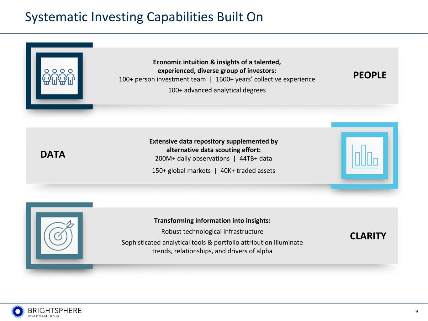 8 Acadian Platform Overview • Leading, at-scale, systematic investment manager with a track record of over 35 years and $97.4 billion in AUM as of September 30, 2023 • Quant-focused investment platform offering unique capabilities in active equities, multi-asset class, and alternatives; now launching multi-strategy hedge fund and systematic credit capabilities • Strong investment performance with more than 83% of strategies outperforming benchmarks by revenue over 3-, 5-, and 10-year horizons as of September 30, 2023 • Diversified offerings across developed and emerging markets; approximately 80% of AUM invested outside the U.S. • Long-standing relationships with 950+ premier global institutional clients • Experienced management team with a proven track record Business Overview