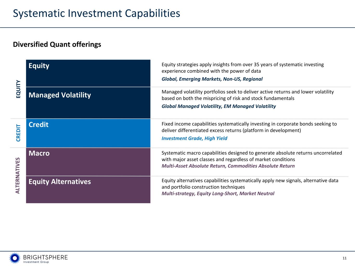 11 Equity strategies apply insights from over 35 years of systematic investing experience combined with the power of data Global, Emerging Markets, Non-US, Regional Managed volatility portfolios seek to deliver active returns and lower volatility based on both the mispricing of risk and stock fundamentals Global Managed Volatility, EM Managed Volatility Fixed income capabilities systematically investing in corporate bonds seeking to deliver differentiated excess returns (platform in development) Investment Grade, High Yield Systematic macro capabilities designed to generate absolute returns uncorrelated with major asset classes and regardless of market conditions Multi-Asset Absolute Return, Commodities Absolute Return Equity alternatives capabilities systematically apply new signals, alternative data and portfolio construction techniques Multi-strategy, Equity Long-Short, Market Neutral Diversified Quant offerings Managed VolatilityEQ U IT Y CR ED IT Credit Macro Equity Alternatives A LT ER N A TI V ES Systematic Investment Capabilities Equity