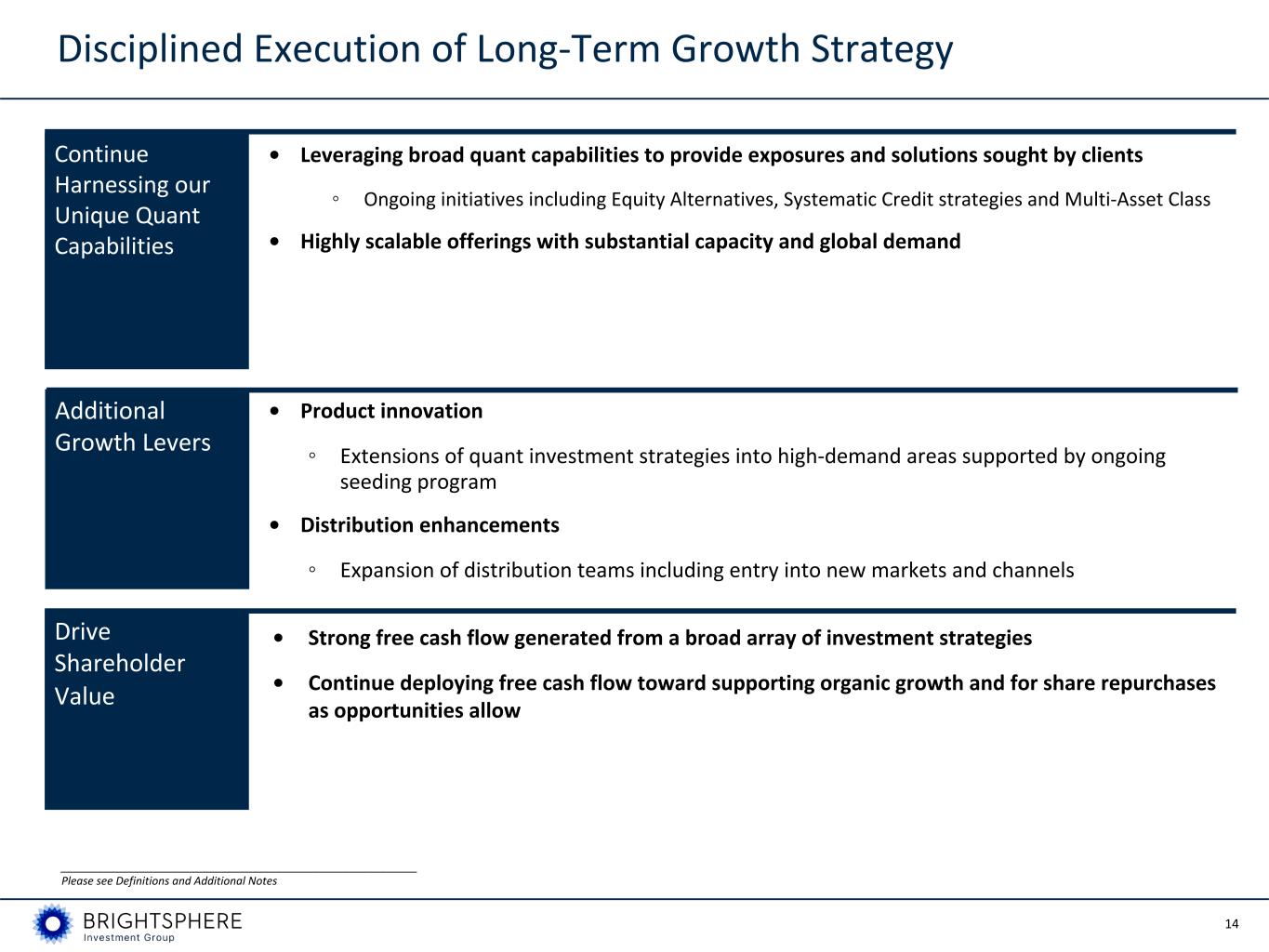 13 • Systematic Credit ◦ We believe current industry dynamics create an attractive opportunity for Acadian to expand and diversify its business into systematic credit and that Acadian is well positioned to win a share of this large market ◦ Roll-out of Systematic Credit effort continuing to move forward as planned ◦ Anticipate seeding first strategies in Q4'23 ◦ High Yield Corporate, Investment Grade Corporate, Credit Long-Short • Equity Alternative ◦ Systematically apply new signals, alternative data and portfolio construction techniques ◦ Seeded Acadian’s Equity Alternatives platform in Q4’22 with $15 million ◦ Multi-Strategy, Differentiated Hedge Fund Strategies, Equity Long-Short, Market Neutral • Systematic Macro ◦ Began offering to broad markets in late 2019; systematic macro strategies have since grown to over $2 billion in AUM as of September 30, 2023 ◦ Multi-Asset Absolute Return, Commodities Absolute Return Demand for Diversification, Downside Protection, and Fixed Income Replacements Acadian’s Recent and Ongoing Growth Initiatives Investment Theme Acadian Solutions __________________________________________________________ Please see Definitions and Additional Notes