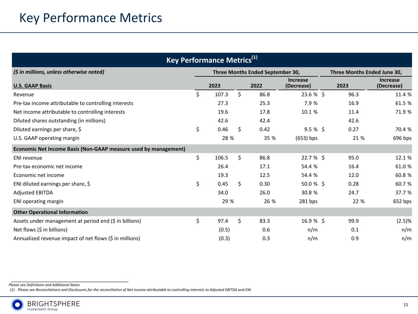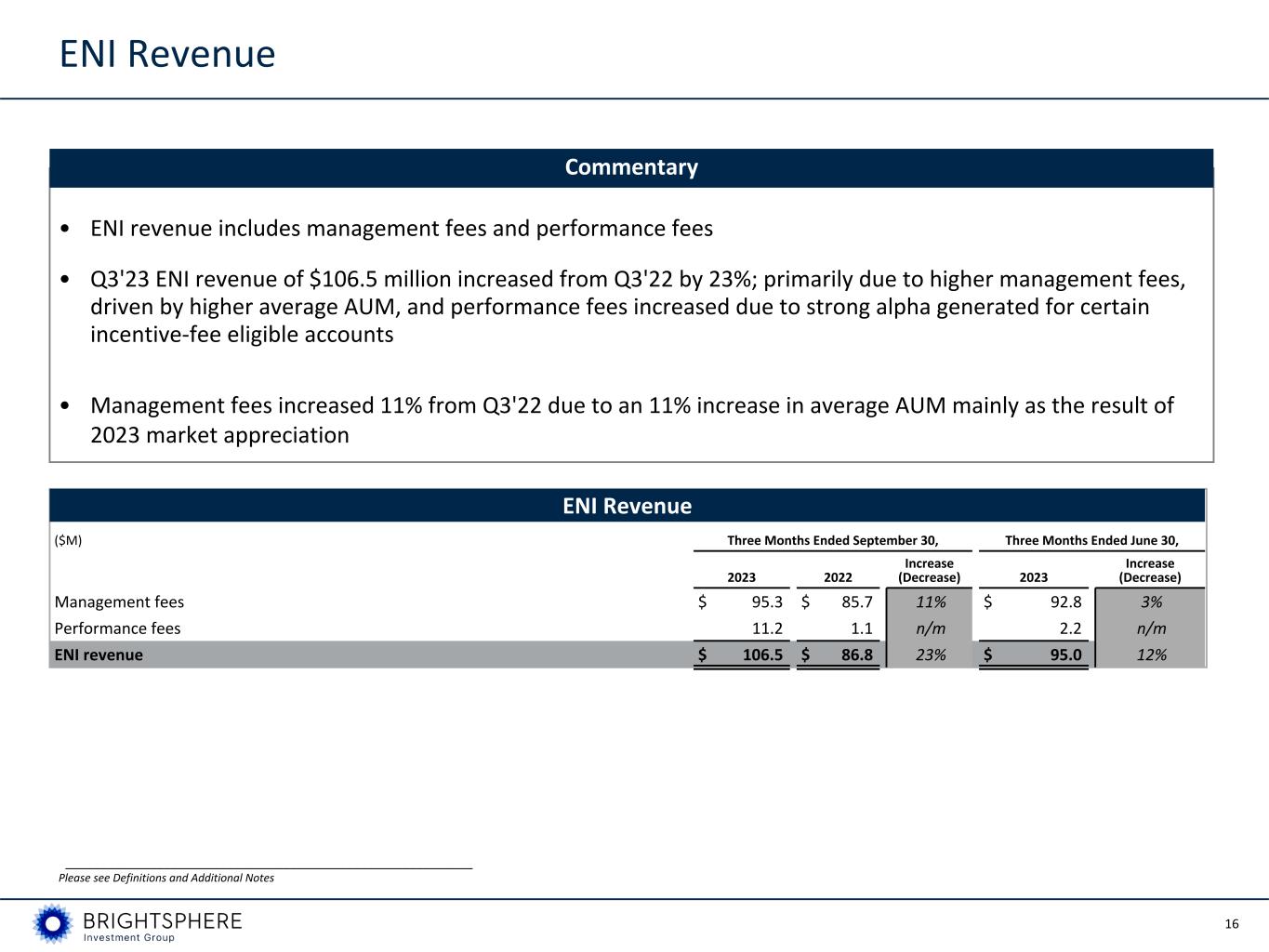 15 Key Performance Metrics Key Performance Metrics(1) ($ in millions, unless otherwise noted) Three Months Ended September 30, Three Months Ended June 30, U.S. GAAP Basis 2023 2022 Increase (Decrease) 2023 Increase (Decrease) Revenue $ 107.3 $ 86.8 23.6 % $ 96.3 11.4 % Pre-tax income attributable to controlling interests 27.3 25.3 7.9 % 16.9 61.5 % Net income attributable to controlling interests 19.6 17.8 10.1 % 11.4 71.9 % Diluted shares outstanding (in millions) 42.6 42.4 42.6 Diluted earnings per share, $ $ 0.46 $ 0.42 9.5 % $ 0.27 70.4 % U.S. GAAP operating margin 28 % 35 % (653) bps 21 % 696 bps Economic Net Income Basis (Non-GAAP measure used by management) ENI revenue $ 106.5 $ 86.8 22.7 % $ 95.0 12.1 % Pre-tax economic net income 26.4 17.1 54.4 % 16.4 61.0 % Economic net income 19.3 12.5 54.4 % 12.0 60.8 % ENI diluted earnings per share, $ $ 0.45 $ 0.30 50.0 % $ 0.28 60.7 % Adjusted EBITDA 34.0 26.0 30.8 % 24.7 37.7 % ENI operating margin 29 % 26 % 281 bps 22 % 652 bps Other Operational Information Assets under management at period end ($ in billions) $ 97.4 $ 83.3 16.9 % $ 99.9 (2.5) % Net flows ($ in billions) (0.5) 0.6 n/m 0.1 n/m Annualized revenue impact of net flows ($ in millions) (0.3) 0.3 n/m 0.9 n/m __________________________________________________________ Please see Definitions and Additional Notes (1) Please see Reconciliations and Disclosures for the reconciliation of Net income attributable to controlling interests to Adjusted EBITDA and ENI.