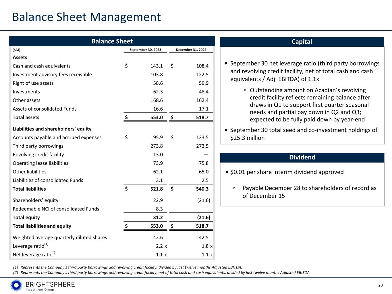 20 Balance Sheet ($M) September 30, 2023 December 31, 2022 Assets Cash and cash equivalents $ 143.1 $ 108.4 Investment advisory fees receivable 103.8 122.5 Right of use assets 58.6 59.9 Investments 62.3 48.4 Other assets 168.6 162.4 Assets of consolidated Funds 16.6 17.1 Total assets $ 553.0 $ 518.7 Liabilities and shareholders’ equity Accounts payable and accrued expenses $ 95.9 $ 123.5 Third party borrowings 273.8 273.5 Revolving credit facility 13.0 — Operating lease liabilities 73.9 75.8 Other liabilities 62.1 65.0 Liabilities of consolidated Funds 3.1 2.5 Total liabilities $ 521.8 $ 540.3 Shareholders’ equity 22.9 (21.6) Redeemable NCI of consolidated Funds 8.3 — Total equity 31.2 (21.6) Total liabilities and equity $ 553.0 $ 518.7 Weighted average quarterly diluted shares 42.6 42.5 Leverage ratio(1) 2.2 x 1.8 x Net leverage ratio(2) 1.1 x 1.1 x Balance Sheet Management • $0.01 per share interim dividend approved ◦ Payable December 28 to shareholders of record as of December 15 • September 30 net leverage ratio (third party borrowings and revolving credit facility, net of total cash and cash equivalents / Adj. EBITDA) of 1.1x ◦ Outstanding amount on Acadian’s revolving credit facility reflects remaining balance after draws in Q1 to support first quarter seasonal needs and partial pay down in Q2 and Q3; expected to be fully paid down by year-end • September 30 total seed and co-investment holdings of $25.3 million Capital Dividend _______________________________________________________________ (1) Represents the Company’s third party borrowings and revolving credit facility, divided by last twelve months Adjusted EBITDA. (2) Represents the Company’s third party borrowings and revolving credit facility, net of total cash and cash equivalents, divided by last twelve months Adjusted EBITDA.