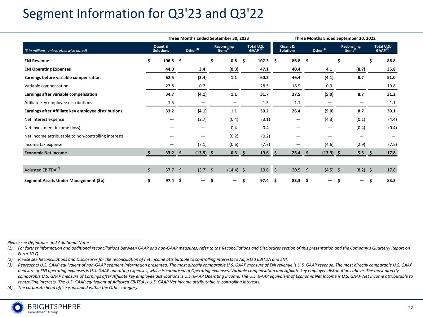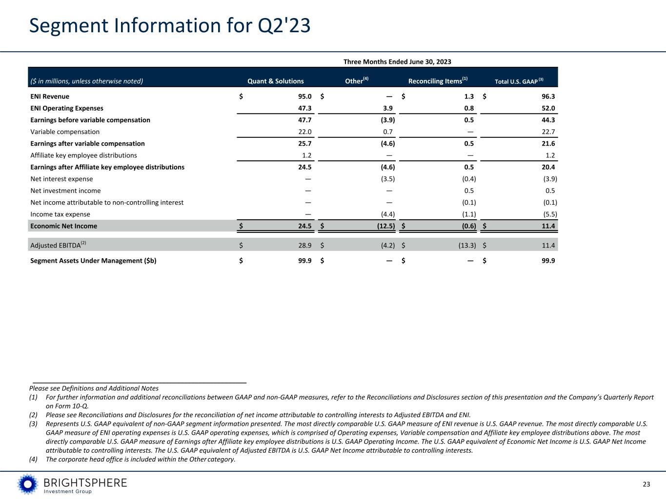 22 Segment Information for Q3'23 and Q3'22 Three Months Ended September 30, 2023 Three Months Ended September 30, 2022 ($ in millions, unless otherwise noted) Quant & Solutions Other(4) Reconciling Items(1) Total U.S. GAAP (3) Quant & Solutions Other(4) Reconciling Items(1) Total U.S. GAAP (3) ENI Revenue $ 106.5 $ — $ 0.8 $ 107.3 $ 86.8 $ — $ — $ 86.8 ENI Operating Expenses 44.0 3.4 (0.3) 47.1 40.4 4.1 (8.7) 35.8 Earnings before variable compensation 62.5 (3.4) 1.1 60.2 46.4 (4.1) 8.7 51.0 Variable compensation 27.8 0.7 — 28.5 18.9 0.9 — 19.8 Earnings after variable compensation 34.7 (4.1) 1.1 31.7 27.5 (5.0) 8.7 31.2 Affiliate key employee distributions 1.5 — — 1.5 1.1 — — 1.1 Earnings after Affiliate key employee distributions 33.2 (4.1) 1.1 30.2 26.4 (5.0) 8.7 30.1 Net interest expense — (2.7) (0.4) (3.1) — (4.3) (0.1) (4.4) Net investment income (loss) — — 0.4 0.4 — — (0.4) (0.4) Net income attributable to non-controlling interests — — (0.2) (0.2) — — — — Income tax expense — (7.1) (0.6) (7.7) — (4.6) (2.9) (7.5) Economic Net Income $ 33.2 $ (13.9) $ 0.3 $ 19.6 $ 26.4 $ (13.9) $ 5.3 $ 17.8 Adjusted EBITDA(2) $ 37.7 $ (3.7) $ (14.4) $ 19.6 $ 30.5 $ (4.5) $ (8.2) $ 17.8 Segment Assets Under Management ($b) $ 97.4 $ — $ — $ 97.4 $ 83.3 $ — $ — $ 83.3 __________________________________________________________ Please see Definitions and Additional Notes (1) For further information and additional reconciliations between GAAP and non-GAAP measures, refer to the Reconciliations and Disclosures section of this presentation and the Company’s Quarterly Report on Form 10-Q. (2) Please see Reconciliations and Disclosures for the reconciliation of net income attributable to controlling interests to Adjusted EBITDA and ENI. (3) Represents U.S. GAAP equivalent of non-GAAP segment information presented. The most directly comparable U.S. GAAP measure of ENI revenue is U.S. GAAP revenue. The most directly comparable U.S. GAAP measure of ENI operating expenses is U.S. GAAP operating expenses, which is comprised of Operating expenses, Variable compensation and Affiliate key employee distributions above. The most directly comparable U.S. GAAP measure of Earnings after Affiliate key employee distributions is U.S. GAAP Operating Income. The U.S. GAAP equivalent of Economic Net Income is U.S. GAAP Net Income attributable to controlling interests. The U.S. GAAP equivalent of Adjusted EBITDA is U.S. GAAP Net Income attributable to controlling interests. (4) The corporate head office is included within the Other category.