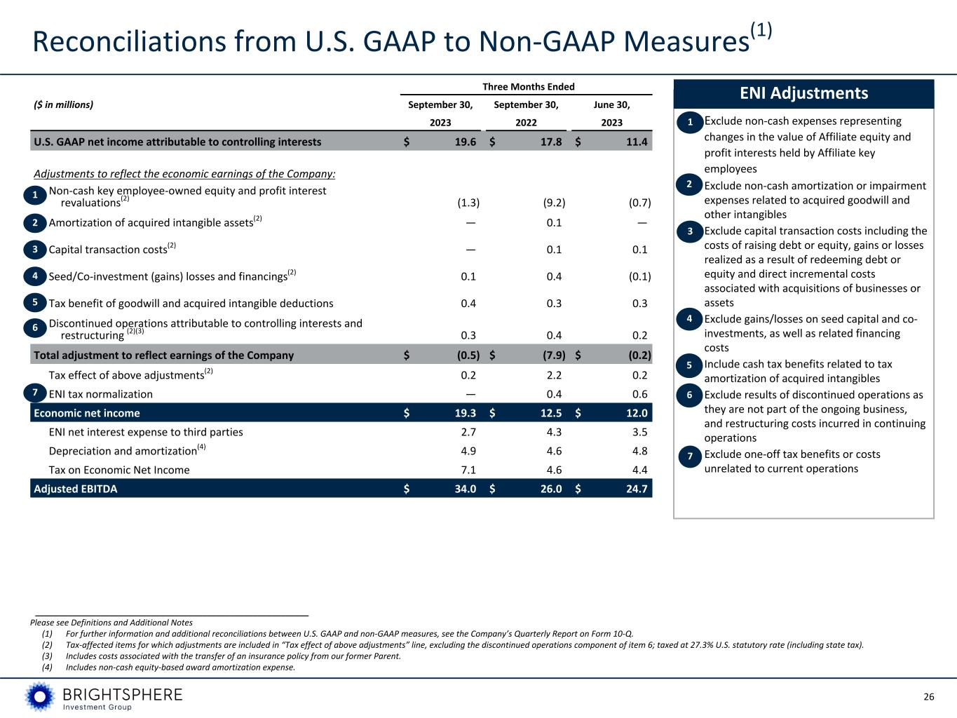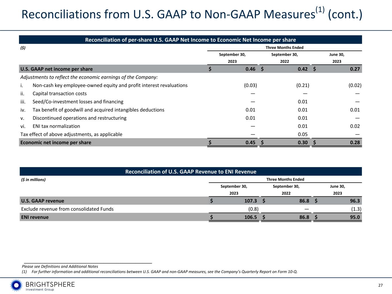 26 Three Months Ended ($ in millions) September 30, September 30, June 30, 2023 2022 2023 U.S. GAAP net income attributable to controlling interests $ 19.6 $ 17.8 $ 11.4 Adjustments to reflect the economic earnings of the Company: Non-cash key employee-owned equity and profit interest revaluations(2) (1.3) (9.2) (0.7) Amortization of acquired intangible assets(2) — 0.1 — Capital transaction costs(2) — 0.1 0.1 Seed/Co-investment (gains) losses and financings(2) 0.1 0.4 (0.1) Tax benefit of goodwill and acquired intangible deductions 0.4 0.3 0.3 Discontinued operations attributable to controlling interests and restructuring (2)(3) 0.3 0.4 0.2 Total adjustment to reflect earnings of the Company $ (0.5) $ (7.9) $ (0.2) Tax effect of above adjustments(2) 0.2 2.2 0.2 ENI tax normalization — 0.4 0.6 Economic net income $ 19.3 $ 12.5 $ 12.0 ENI net interest expense to third parties 2.7 4.3 3.5 Depreciation and amortization(4) 4.9 4.6 4.8 Tax on Economic Net Income 7.1 4.6 4.4 Adjusted EBITDA $ 34.0 $ 26.0 $ 24.7 Reconciliations from U.S. GAAP to Non-GAAP Measures(1) i. Exclude non-cash expenses representing changes in the value of Affiliate equity and profit interests held by Affiliate key employees ii. Exclude non-cash amortization or impairment expenses related to acquired goodwill and other intangibles iii.Exclude capital transaction costs including the costs of raising debt or equity, gains or losses realized as a result of redeeming debt or equity and direct incremental costs associated with acquisitions of businesses or assets iv.Exclude gains/losses on seed capital and co- investments, as well as related financing costs v. Include cash tax benefits related to tax amortization of acquired intangibles vi.Exclude results of discontinued operations as they are not part of the ongoing business, and restructuring costs incurred in continuing operations vii. Exclude one-off tax benefits or costs unrelated to current operations ENI Adjustments 1 3 2 3 4 5 7 6 2 1 4 5 6 7 ___________________________________________________________ Please see Definitions and Additional Notes (1) For further information and additional reconciliations between U.S. GAAP and non-GAAP measures, see the Company’s Quarterly Report on Form 10-Q. (2) Tax-affected items for which adjustments are included in “Tax effect of above adjustments” line, excluding the discontinued operations component of item 6; taxed at 27.3% U.S. statutory rate (including state tax). (3) Includes costs associated with the transfer of an insurance policy from our former Parent. (4) Includes non-cash equity-based award amortization expense.