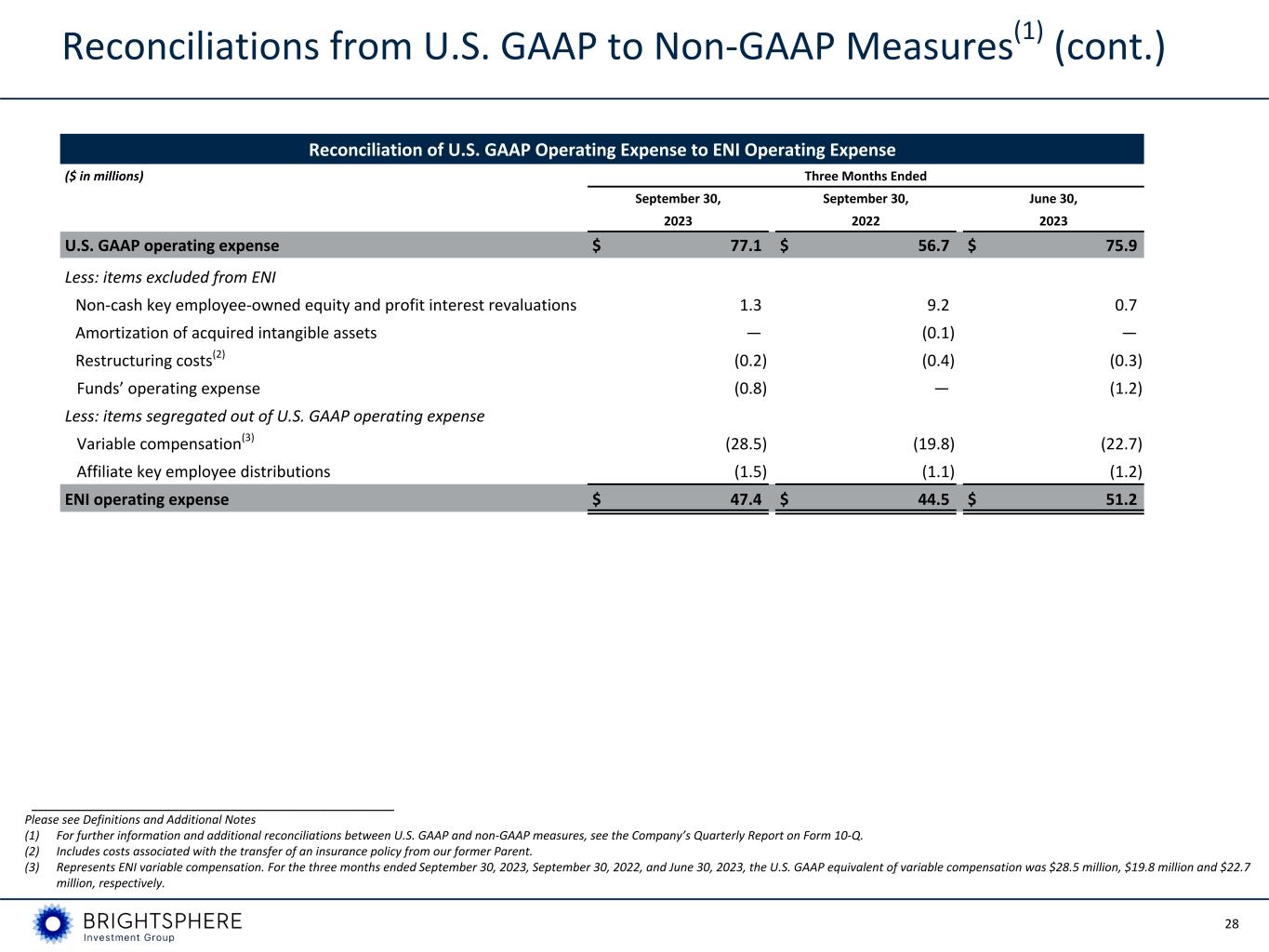27 Reconciliations from U.S. GAAP to Non-GAAP Measures(1) (cont.) Reconciliation of per-share U.S. GAAP Net Income to Economic Net Income per share ($) Three Months Ended September 30, September 30, June 30, 2023 2022 2023 U.S. GAAP net income per share $ 0.46 $ 0.42 $ 0.27 Adjustments to reflect the economic earnings of the Company: i. Non-cash key employee-owned equity and profit interest revaluations (0.03) (0.21) (0.02) ii. Capital transaction costs — — — iii. Seed/Co-investment losses and financing — 0.01 — iv. Tax benefit of goodwill and acquired intangibles deductions 0.01 0.01 0.01 v. Discontinued operations and restructuring 0.01 0.01 — vi. ENI tax normalization — 0.01 0.02 Tax effect of above adjustments, as applicable — 0.05 — Economic net income per share $ 0.45 $ 0.30 $ 0.28 Reconciliation of U.S. GAAP Revenue to ENI Revenue ($ in millions) Three Months Ended September 30, September 30, June 30, 2023 2022 2023 U.S. GAAP revenue $ 107.3 $ 86.8 $ 96.3 Exclude revenue from consolidated Funds (0.8) — (1.3) ENI revenue $ 106.5 $ 86.8 $ 95.0 ___________________________________________________________ Please see Definitions and Additional Notes (1) For further information and additional reconciliations between U.S. GAAP and non-GAAP measures, see the Company’s Quarterly Report on Form 10-Q.