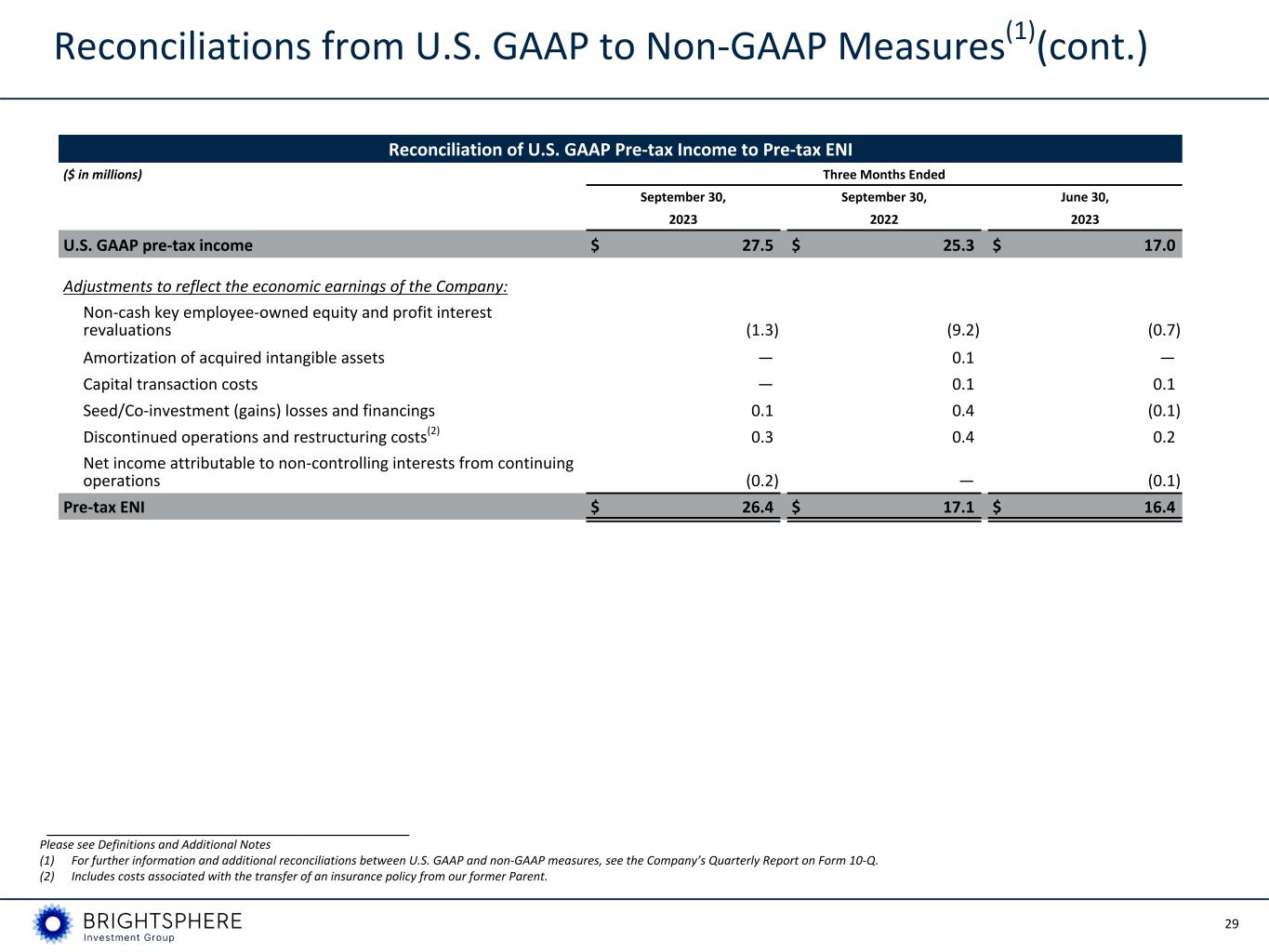 28 Reconciliations from U.S. GAAP to Non-GAAP Measures(1) (cont.) Reconciliation of U.S. GAAP Operating Expense to ENI Operating Expense ($ in millions) Three Months Ended September 30, September 30, June 30, 2023 2022 2023 U.S. GAAP operating expense $ 77.1 $ 56.7 $ 75.9 Less: items excluded from ENI Non-cash key employee-owned equity and profit interest revaluations 1.3 9.2 0.7 Amortization of acquired intangible assets — (0.1) — Restructuring costs(2) (0.2) (0.4) (0.3) Funds’ operating expense (0.8) — (1.2) Less: items segregated out of U.S. GAAP operating expense Variable compensation(3) (28.5) (19.8) (22.7) Affiliate key employee distributions (1.5) (1.1) (1.2) ENI operating expense $ 47.4 $ 44.5 $ 51.2 ___________________________________________________________ Please see Definitions and Additional Notes (1) For further information and additional reconciliations between U.S. GAAP and non-GAAP measures, see the Company’s Quarterly Report on Form 10-Q. (2) Includes costs associated with the transfer of an insurance policy from our former Parent. (3) Represents ENI variable compensation. For the three months ended September 30, 2023, September 30, 2022, and June 30, 2023, the U.S. GAAP equivalent of variable compensation was $28.5 million, $19.8 million and $22.7 million, respectively.