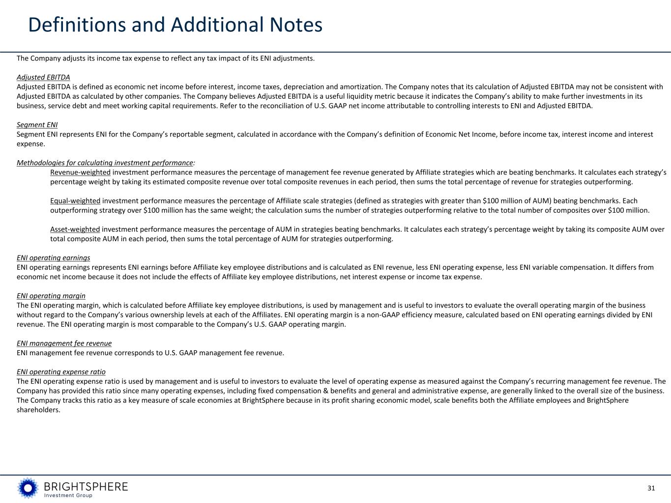 31 The Company adjusts its income tax expense to reflect any tax impact of its ENI adjustments. Adjusted EBITDA Adjusted EBITDA is defined as economic net income before interest, income taxes, depreciation and amortization. The Company notes that its calculation of Adjusted EBITDA may not be consistent with Adjusted EBITDA as calculated by other companies. The Company believes Adjusted EBITDA is a useful liquidity metric because it indicates the Company’s ability to make further investments in its business, service debt and meet working capital requirements. Refer to the reconciliation of U.S. GAAP net income attributable to controlling interests to ENI and Adjusted EBITDA. Segment ENI Segment ENI represents ENI for the Company’s reportable segment, calculated in accordance with the Company’s definition of Economic Net Income, before income tax, interest income and interest expense. Methodologies for calculating investment performance: Revenue-weighted investment performance measures the percentage of management fee revenue generated by Affiliate strategies which are beating benchmarks. It calculates each strategy’s percentage weight by taking its estimated composite revenue over total composite revenues in each period, then sums the total percentage of revenue for strategies outperforming. Equal-weighted investment performance measures the percentage of Affiliate scale strategies (defined as strategies with greater than $100 million of AUM) beating benchmarks. Each outperforming strategy over $100 million has the same weight; the calculation sums the number of strategies outperforming relative to the total number of composites over $100 million. Asset-weighted investment performance measures the percentage of AUM in strategies beating benchmarks. It calculates each strategy’s percentage weight by taking its composite AUM over total composite AUM in each period, then sums the total percentage of AUM for strategies outperforming. ENI operating earnings ENI operating earnings represents ENI earnings before Affiliate key employee distributions and is calculated as ENI revenue, less ENI operating expense, less ENI variable compensation. It differs from economic net income because it does not include the effects of Affiliate key employee distributions, net interest expense or income tax expense. ENI operating margin The ENI operating margin, which is calculated before Affiliate key employee distributions, is used by management and is useful to investors to evaluate the overall operating margin of the business without regard to the Company’s various ownership levels at each of the Affiliates. ENI operating margin is a non-GAAP efficiency measure, calculated based on ENI operating earnings divided by ENI revenue. The ENI operating margin is most comparable to the Company’s U.S. GAAP operating margin. ENI management fee revenue ENI management fee revenue corresponds to U.S. GAAP management fee revenue. ENI operating expense ratio The ENI operating expense ratio is used by management and is useful to investors to evaluate the level of operating expense as measured against the Company’s recurring management fee revenue. The Company has provided this ratio since many operating expenses, including fixed compensation & benefits and general and administrative expense, are generally linked to the overall size of the business. The Company tracks this ratio as a key measure of scale economies at BrightSphere because in its profit sharing economic model, scale benefits both the Affiliate employees and BrightSphere shareholders. Definitions and Additional Notes