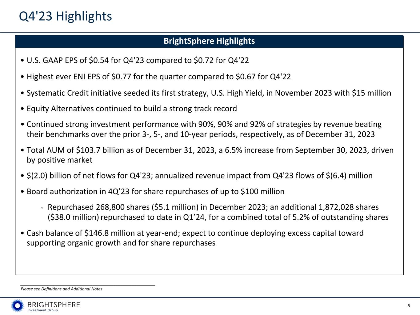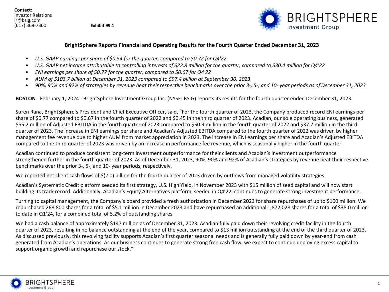 1 Contact: Investor Relations ir@bsig.com (617) 369-7300 Exhibit 99.1 BrightSphere Reports Financial and Operating Results for the Fourth Quarter Ended December 31, 2023 • U.S. GAAP earnings per share of $0.54 for the quarter, compared to $0.72 for Q4'22 • U.S. GAAP net income attributable to controlling interests of $22.8 million for the quarter, compared to $30.4 million for Q4'22 • ENI earnings per share of $0.77 for the quarter, compared to $0.67 for Q4'22 • AUM of $103.7 billion at December 31, 2023 compared to $97.4 billion at September 30, 2023 • 90%, 90% and 92% of strategies by revenue beat their respective benchmarks over the prior 3-, 5-, and 10- year periods as of December 31, 2023 BOSTON - February 1, 2024 - BrightSphere Investment Group Inc. (NYSE: BSIG) reports its results for the fourth quarter ended December 31, 2023. Suren Rana, BrightSphere’s President and Chief Executive Officer, said, “For the fourth quarter of 2023, the Company produced record ENI earnings per share of $0.77 compared to $0.67 in the fourth quarter of 2022 and $0.45 in the third quarter of 2023. Acadian, our sole operating business, generated $55.2 million of Adjusted EBITDA in the fourth quarter of 2023 compared to $50.9 million in the fourth quarter of 2022 and $37.7 million in the third quarter of 2023. The increase in ENI earnings per share and Acadian’s Adjusted EBITDA compared to the fourth quarter of 2022 was driven by higher management fee revenue due to higher AUM from market appreciation in 2023. The increase in ENI earnings per share and Acadian’s Adjusted EBITDA compared to the third quarter of 2023 was driven by an increase in performance fee revenue, which is seasonally higher in the fourth quarter. Acadian continued to produce consistent long-term investment outperformance for their clients and Acadian’s investment outperformance strengthened further in the fourth quarter of 2023. As of December 31, 2023, 90%, 90% and 92% of Acadian’s strategies by revenue beat their respective benchmarks over the prior 3-, 5-, and 10- year periods, respectively. We reported net client cash flows of $(2.0) billion for the fourth quarter of 2023 driven by outflows from managed volatility strategies. Acadian’s Systematic Credit platform seeded its first strategy, U.S. High Yield, in November 2023 with $15 million of seed capital and will now start building its track record. Additionally, Acadian’s Equity Alternatives platform, seeded in Q4’22, continues to generate strong investment performance. Turning to capital management, the Company’s board provided a fresh authorization in December 2023 for share repurchases of up to $100 million. We repurchased 268,800 shares for a total of $5.1 million in December 2023 and have repurchased an additional 1,872,028 shares for a total of $38.0 million to date in Q1’24, for a combined total of 5.2% of outstanding shares. We had a cash balance of approximately $147 million as of December 31, 2023. Acadian fully paid down their revolving credit facility in the fourth quarter of 2023, resulting in no balance outstanding at the end of the year, compared to $13 million outstanding at the end of the third quarter of 2023. As discussed previously, this revolving facility supports Acadian’s first quarter seasonal needs and is generally fully paid down by year-end from cash generated from Acadian’s operations. As our business continues to generate strong free cash flow, we expect to continue deploying excess capital to support organic growth and repurchase our stock.”