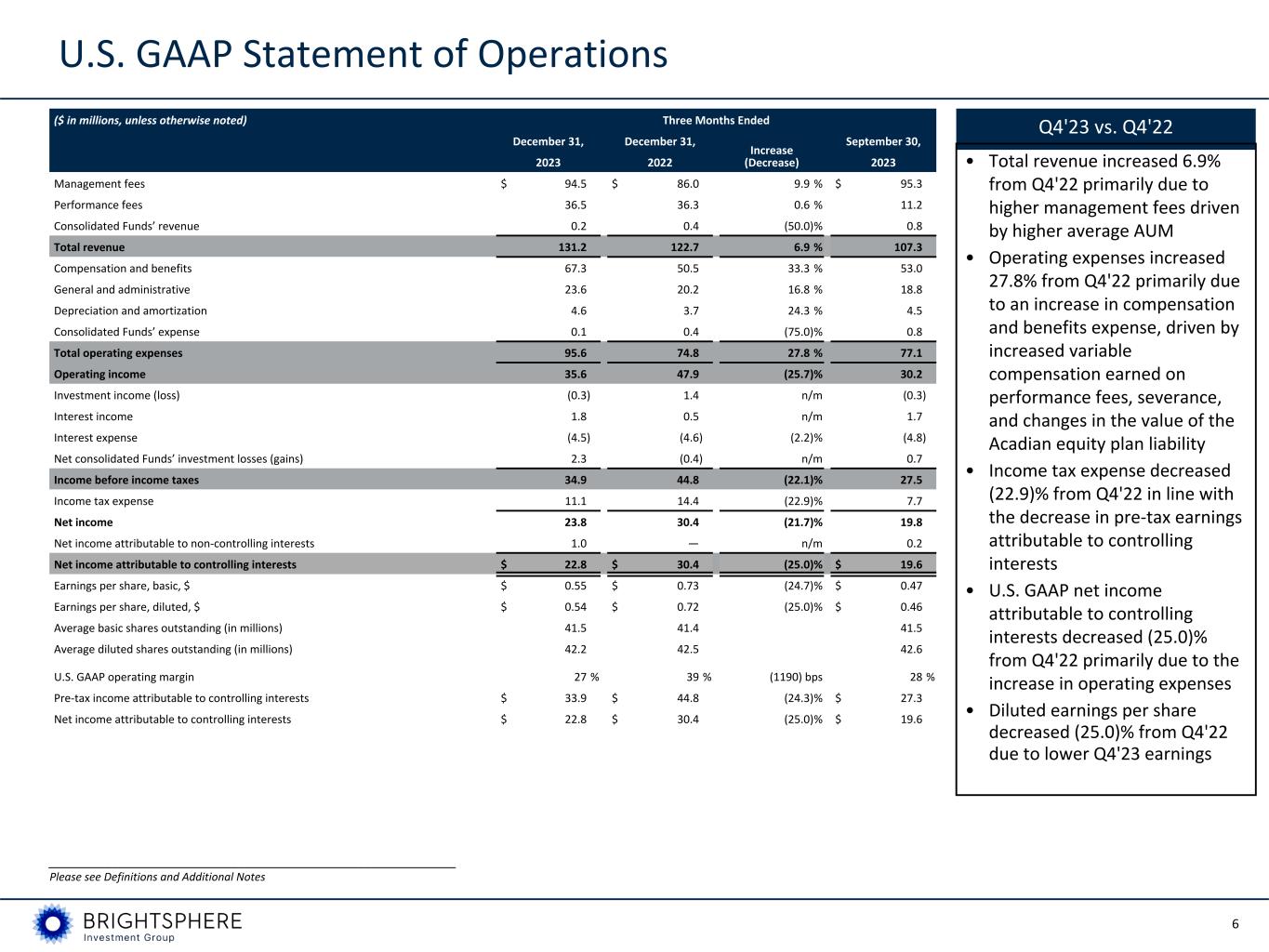 5 • U.S. GAAP EPS of $0.54 for Q4'23 compared to $0.72 for Q4'22 • Highest ever ENI EPS of $0.77 for the quarter compared to $0.67 for Q4'22 • Systematic Credit initiative seeded its first strategy, U.S. High Yield, in November 2023 with $15 million • Equity Alternatives continued to build a strong track record • Continued strong investment performance with 90%, 90% and 92% of strategies by revenue beating their benchmarks over the prior 3-, 5-, and 10-year periods, respectively, as of December 31, 2023 • Total AUM of $103.7 billion as of December 31, 2023, a 6.5% increase from September 30, 2023, driven by positive market • $(2.0) billion of net flows for Q4'23; annualized revenue impact from Q4'23 flows of $(6.4) million • Board authorization in 4Q’23 for share repurchases of up to $100 million ◦ Repurchased 268,800 shares ($5.1 million) in December 2023; an additional 1,872,028 shares ($38.0 million) repurchased to date in Q1’24, for a combined total of 5.2% of outstanding shares • Cash balance of $146.8 million at year-end; expect to continue deploying excess capital toward supporting organic growth and for share repurchases BrightSphere Highlights Q4'23 Highlights __________________________________________________________ Please see Definitions and Additional Notes