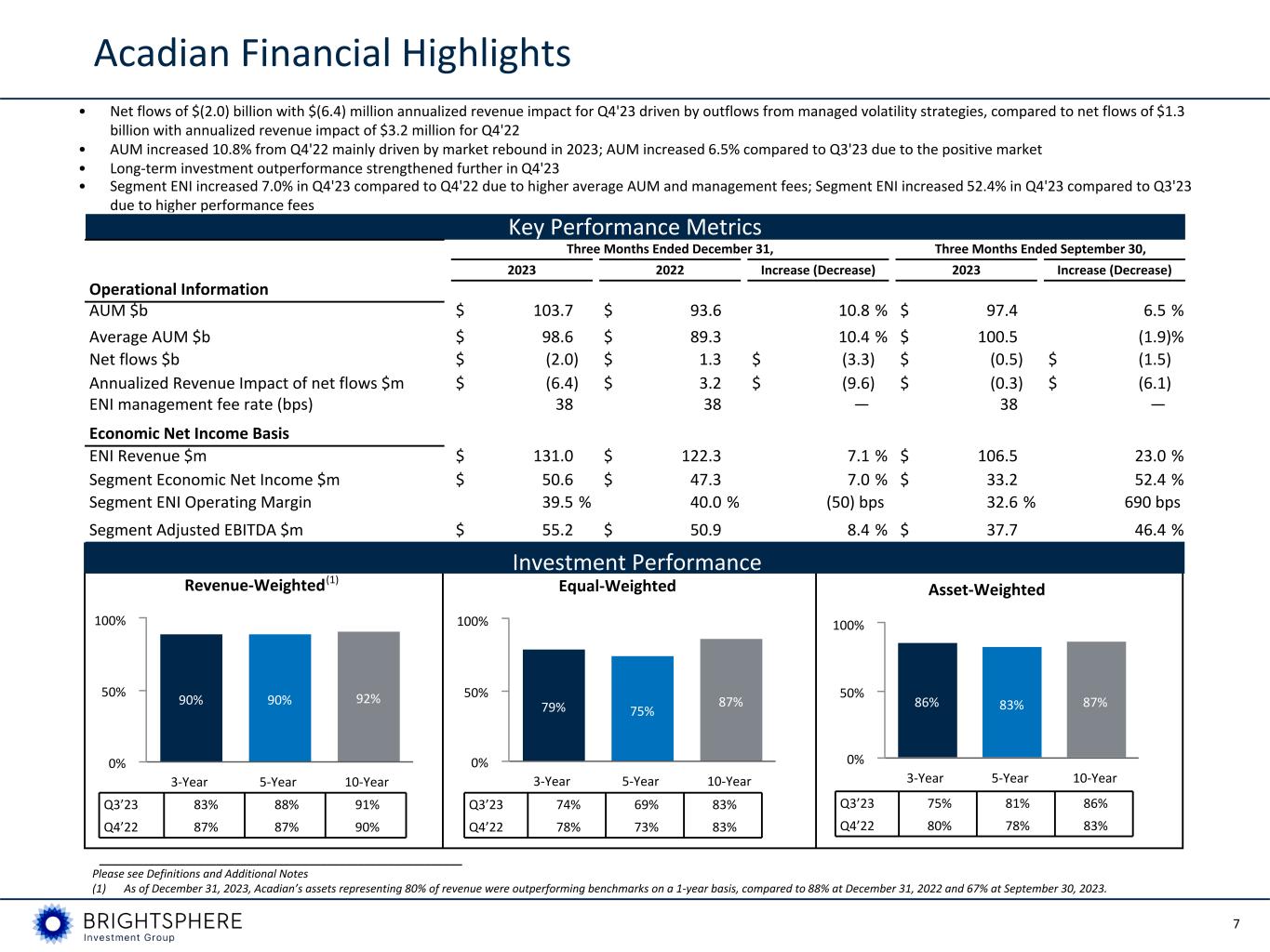 6 U.S. GAAP Statement of Operations ($ in millions, unless otherwise noted) Three Months Ended December 31, December 31, Increase (Decrease) September 30, 2023 2022 2023 Management fees $ 94.5 $ 86.0 9.9 % $ 95.3 Performance fees 36.5 36.3 0.6 % 11.2 Consolidated Funds’ revenue 0.2 0.4 (50.0) % 0.8 Total revenue 131.2 122.7 6.9 % 107.3 Compensation and benefits 67.3 50.5 33.3 % 53.0 General and administrative 23.6 20.2 16.8 % 18.8 Depreciation and amortization 4.6 3.7 24.3 % 4.5 Consolidated Funds’ expense 0.1 0.4 (75.0) % 0.8 Total operating expenses 95.6 74.8 27.8 % 77.1 Operating income 35.6 47.9 (25.7) % 30.2 Investment income (loss) (0.3) 1.4 n/m (0.3) Interest income 1.8 0.5 n/m 1.7 Interest expense (4.5) (4.6) (2.2) % (4.8) Net consolidated Funds’ investment losses (gains) 2.3 (0.4) n/m 0.7 Income before income taxes 34.9 44.8 (22.1) % 27.5 Income tax expense 11.1 14.4 (22.9) % 7.7 Net income 23.8 30.4 (21.7) % 19.8 Net income attributable to non-controlling interests 1.0 — n/m 0.2 Net income attributable to controlling interests $ 22.8 $ 30.4 (25.0) % $ 19.6 Earnings per share, basic, $ $ 0.55 $ 0.73 (24.7) % $ 0.47 Earnings per share, diluted, $ $ 0.54 $ 0.72 (25.0) % $ 0.46 Average basic shares outstanding (in millions) 41.5 41.4 41.5 Average diluted shares outstanding (in millions) 42.2 42.5 42.6 U.S. GAAP operating margin 27 % 39 % (1190) bps 28 % Pre-tax income attributable to controlling interests $ 33.9 $ 44.8 (24.3) % $ 27.3 Net income attributable to controlling interests $ 22.8 $ 30.4 (25.0) % $ 19.6 Q4'23 vs. Q4'22 __________________________________________________________ Please see Definitions and Additional Notes • Total revenue increased 6.9% from Q4'22 primarily due to higher management fees driven by higher average AUM • Operating expenses increased 27.8% from Q4'22 primarily due to an increase in compensation and benefits expense, driven by increased variable compensation earned on performance fees, severance, and changes in the value of the Acadian equity plan liability • Income tax expense decreased (22.9)% from Q4'22 in line with the decrease in pre-tax earnings attributable to controlling interests • U.S. GAAP net income attributable to controlling interests decreased (25.0)% from Q4'22 primarily due to the increase in operating expenses • Diluted earnings per share decreased (25.0)% from Q4'22 due to lower Q4'23 earnings